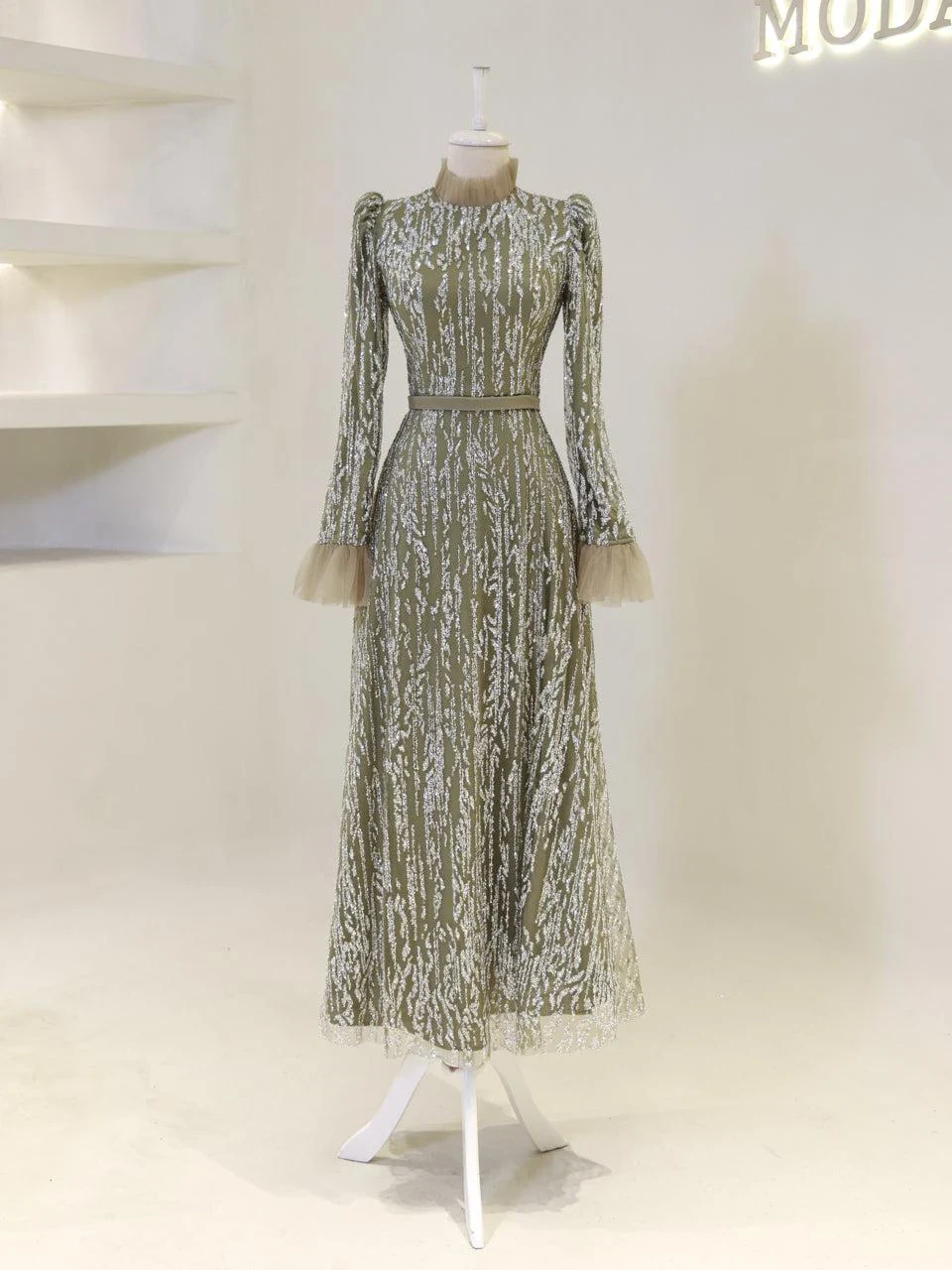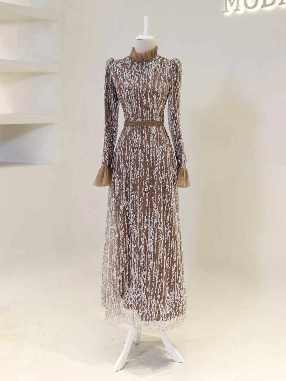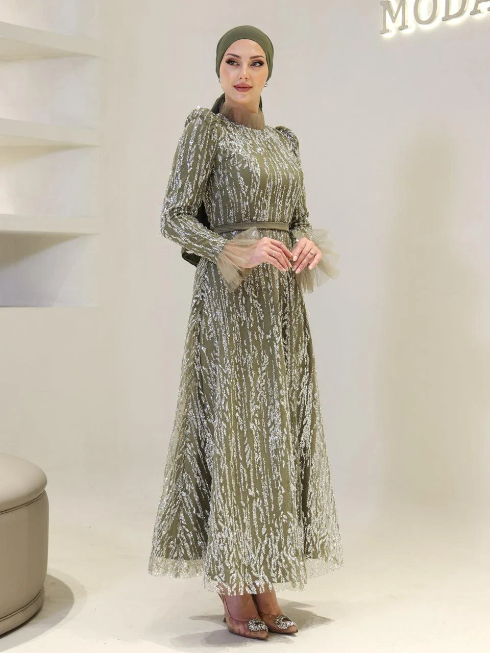 The Adhara Modest Evening Dress is designed with a standard fit and an average length of 145 cm. Made from tulle fabric, it includes a lining for added comfort. The dress is equipped with a back zipper and features a built-in chest pad for support. The A-line skirt provides a flattering silhouette, and the belt detail is removable for versatility. Note: The embellishments are glued, and while some shedding may occur, it will not affect the overall appearance of the dress.