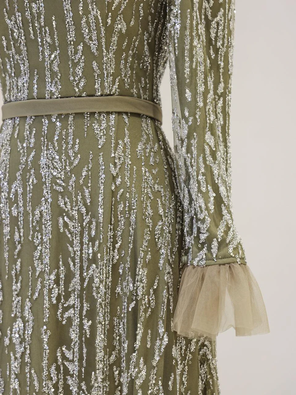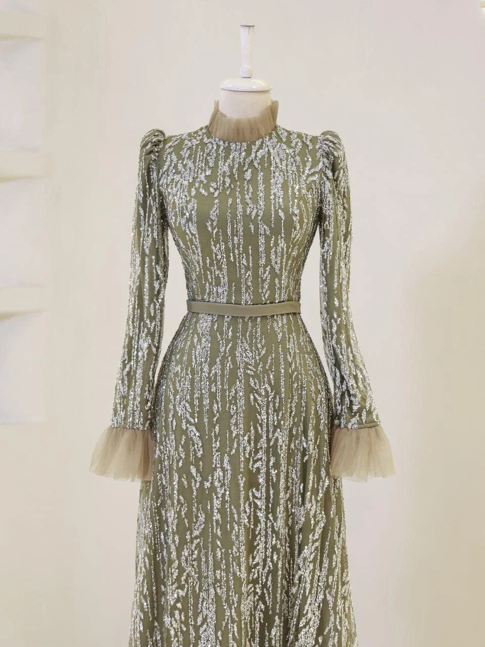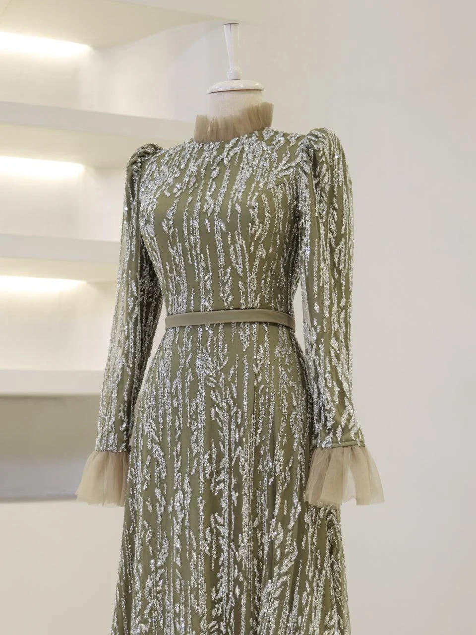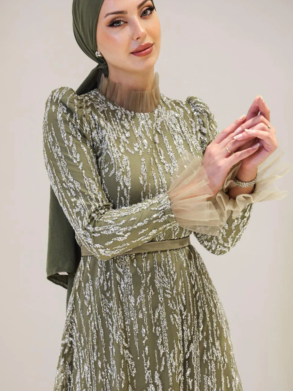 The Adhara Modest Evening Dress is designed with a standard fit and an average length of 145 cm. Made from tulle fabric, it includes a lining for added comfort. The dress is equipped with a back zipper and features a built-in chest pad for support. The A-line skirt provides a flattering silhouette, and the belt detail is removable for versatility. Note: The embellishments are glued, and while some shedding may occur, it will not affect the overall appearance of the dress.