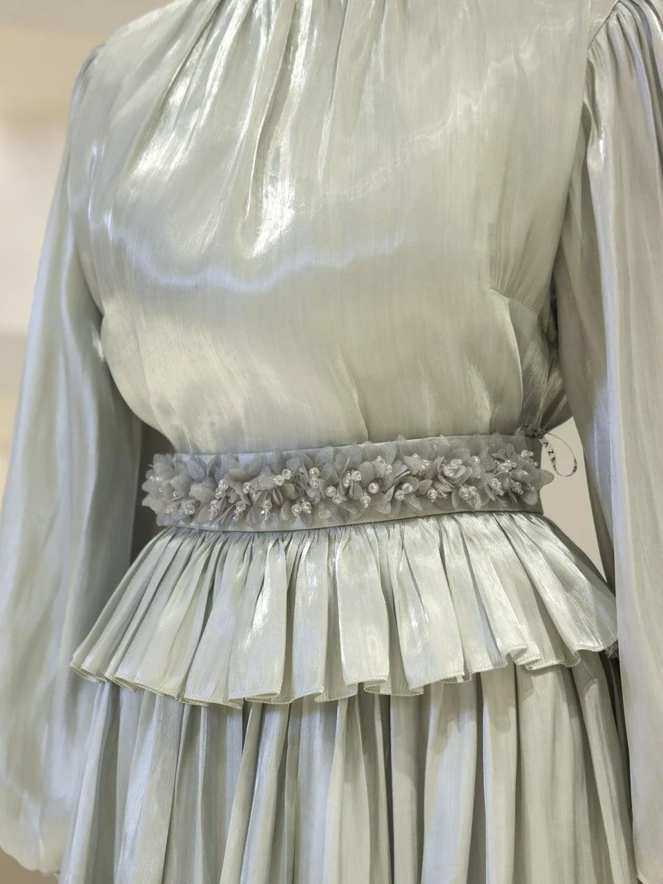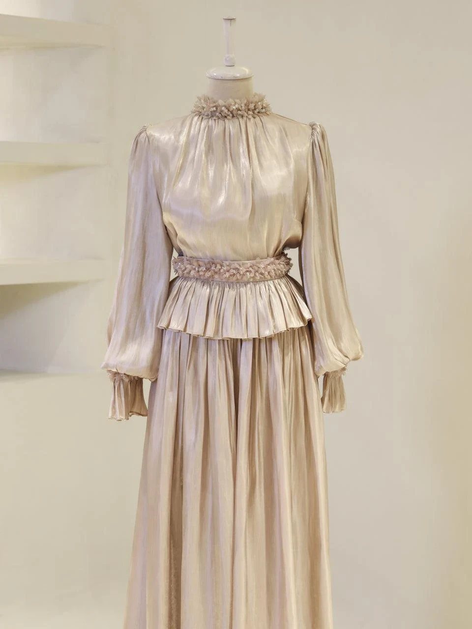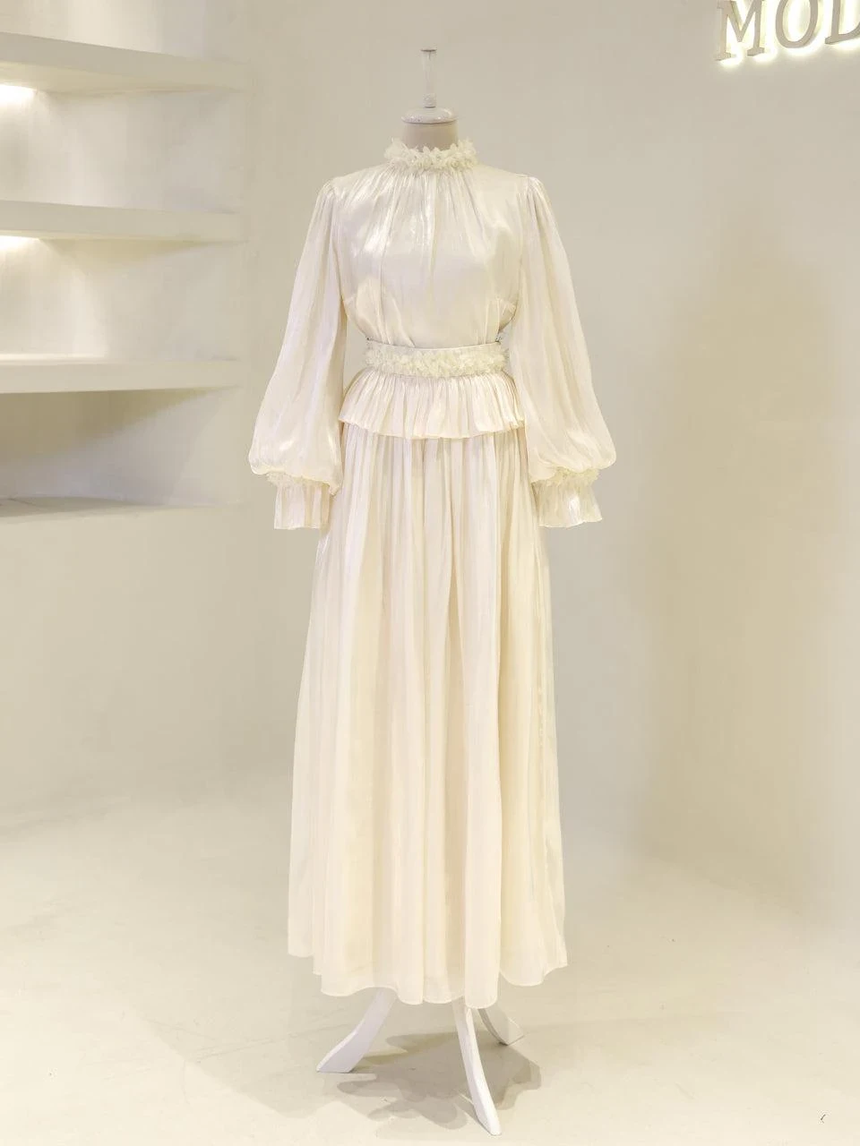 The Adriana Modest Outfit Set is designed with a fitted silhouette, suggesting choosing one size larger for optimal comfort. The set includes a skirt with an average length of 110 cm and a top measuring 55 cm in length. Crafted from orchid fabric, it is fully lined and features a back zipper closure. The balloon sleeves add a unique touch, while the embellishments are securely attached, not glued. The skirt offers a straight form for a classic look.