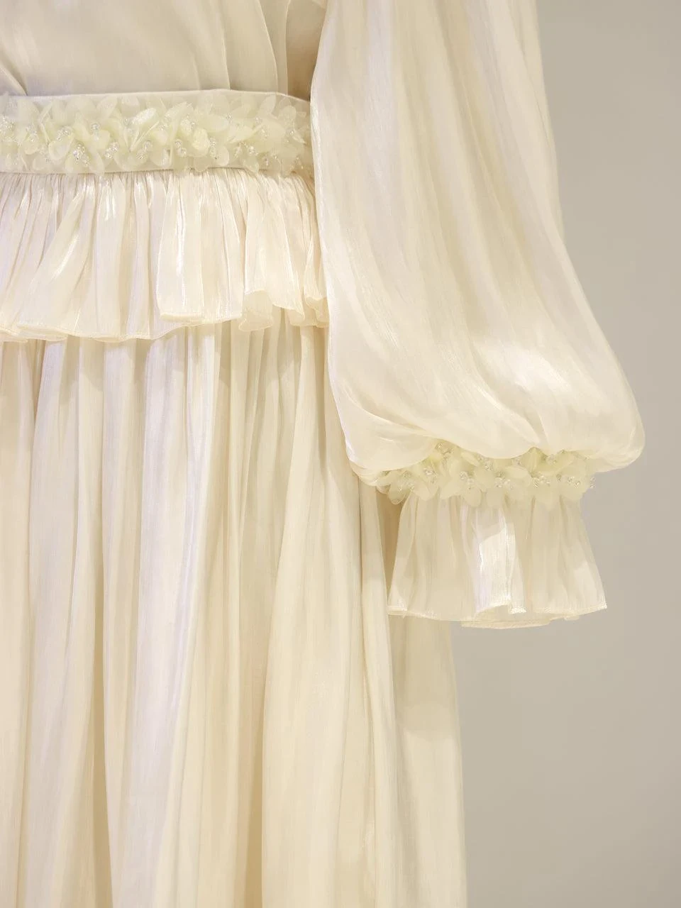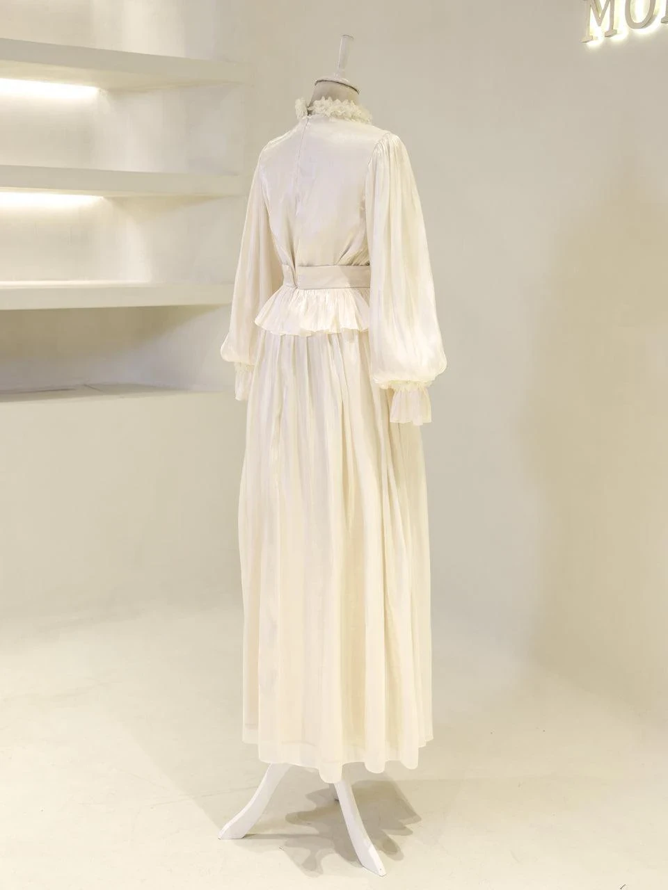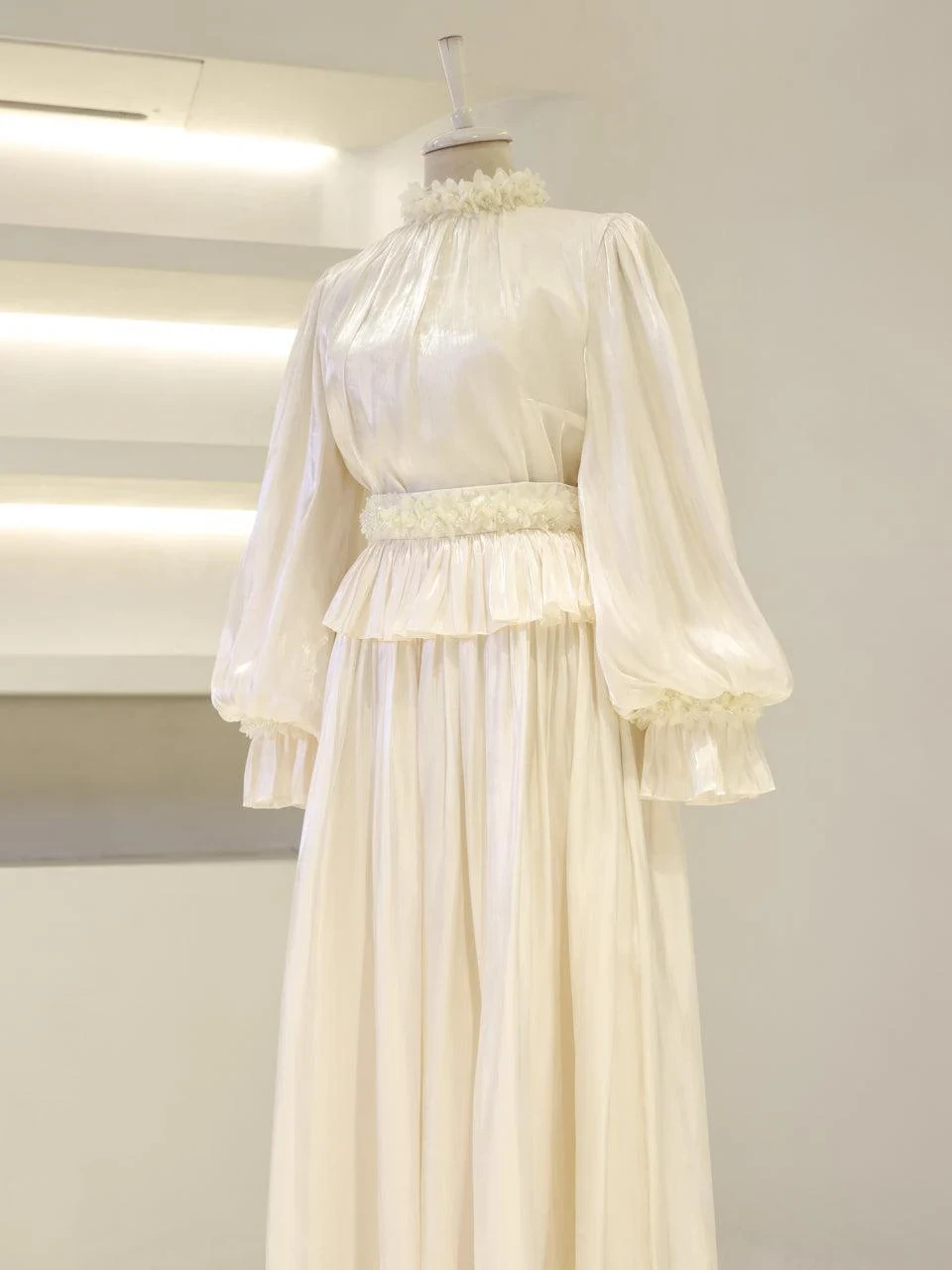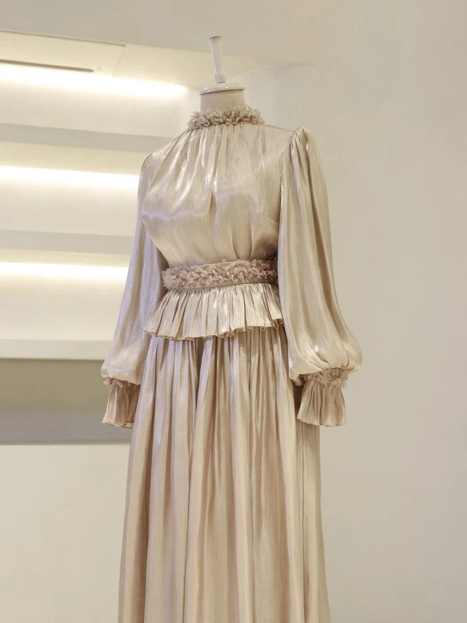 The Adriana Modest Outfit Set is designed with a fitted silhouette, suggesting choosing one size larger for optimal comfort. The set includes a skirt with an average length of 110 cm and a top measuring 55 cm in length. Crafted from orchid fabric, it is fully lined and features a back zipper closure. The balloon sleeves add a unique touch, while the embellishments are securely attached, not glued. The skirt offers a straight form for a classic look.