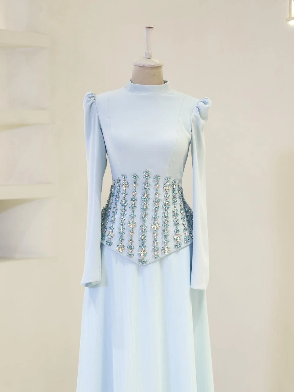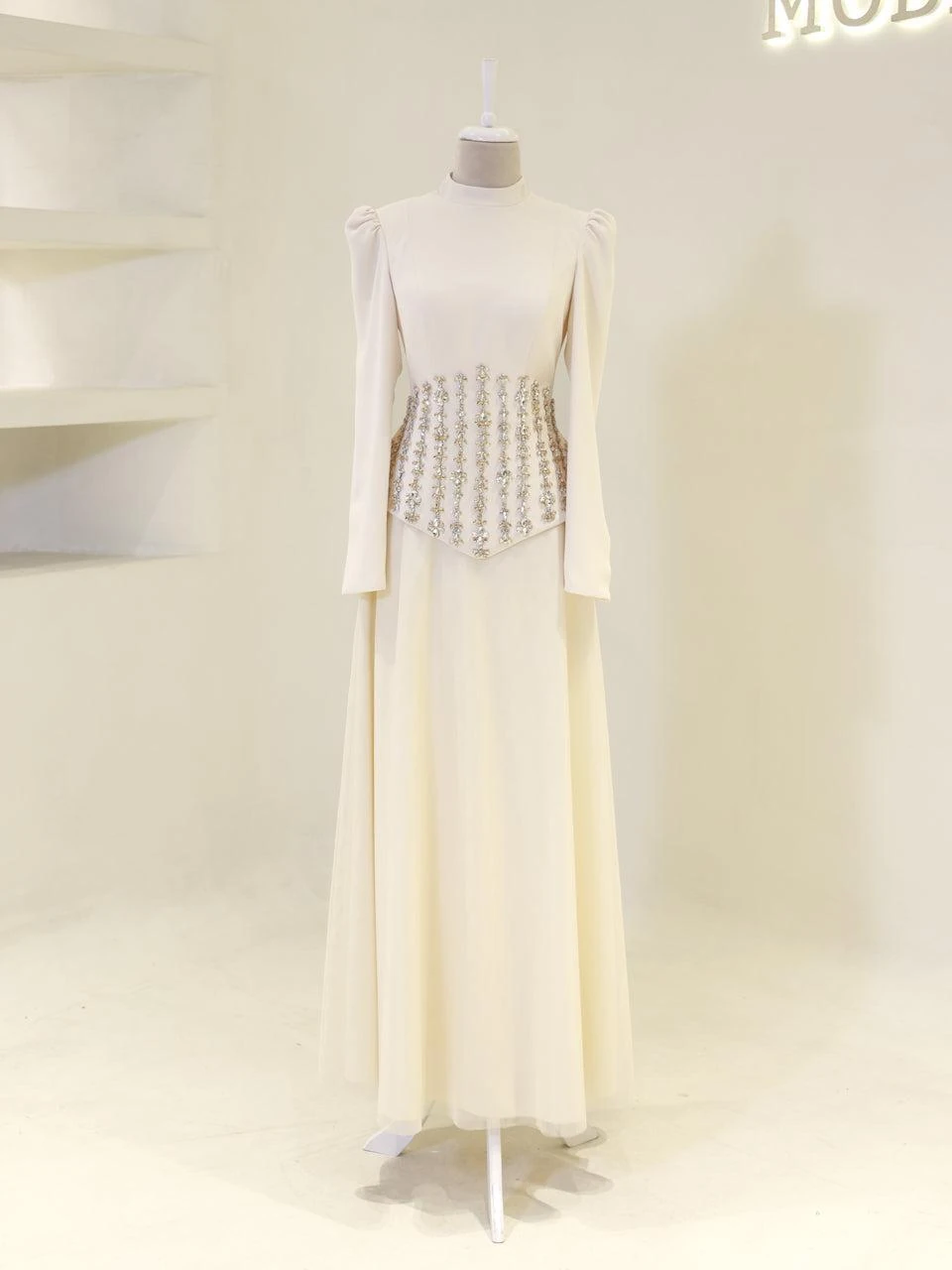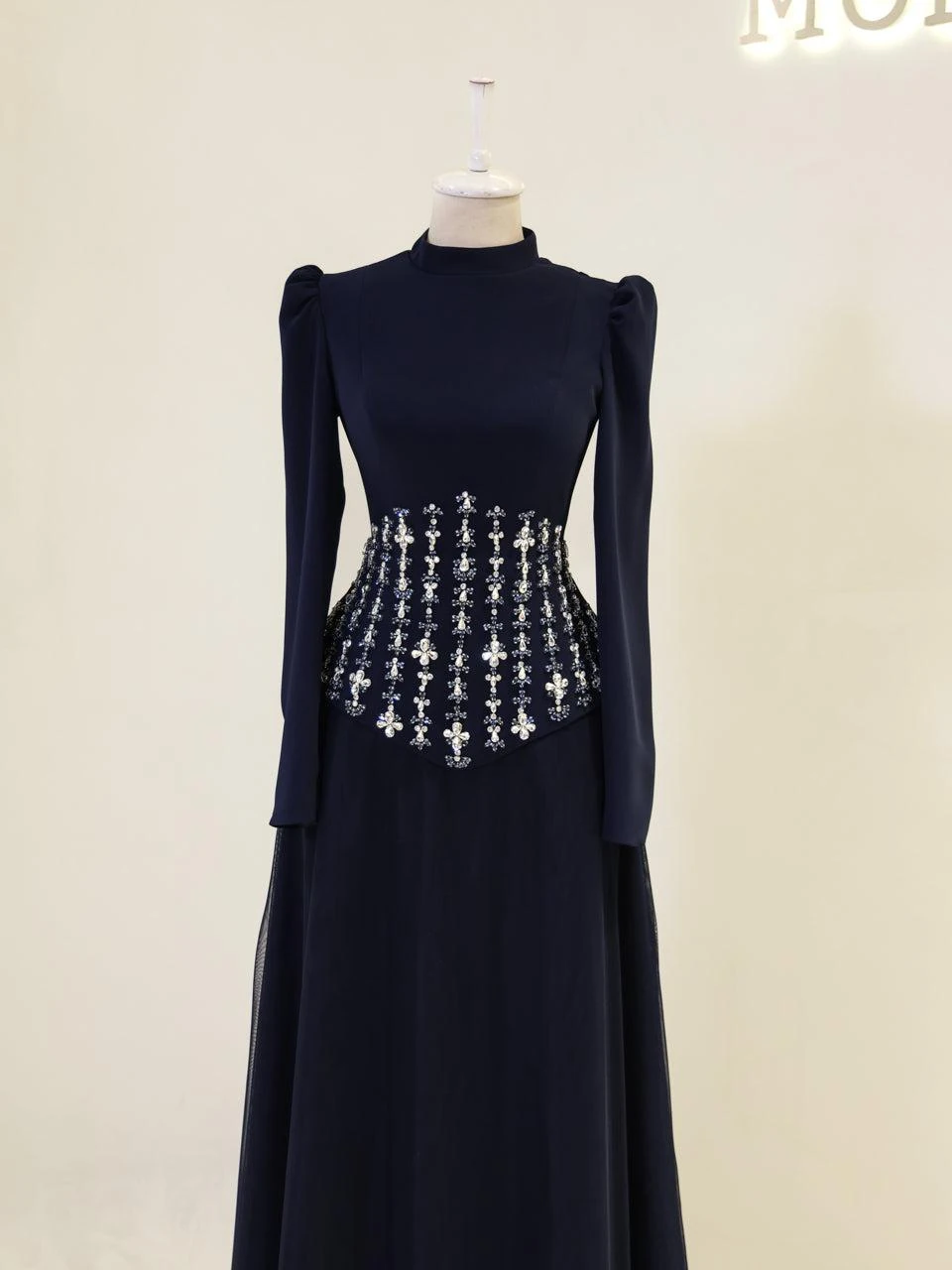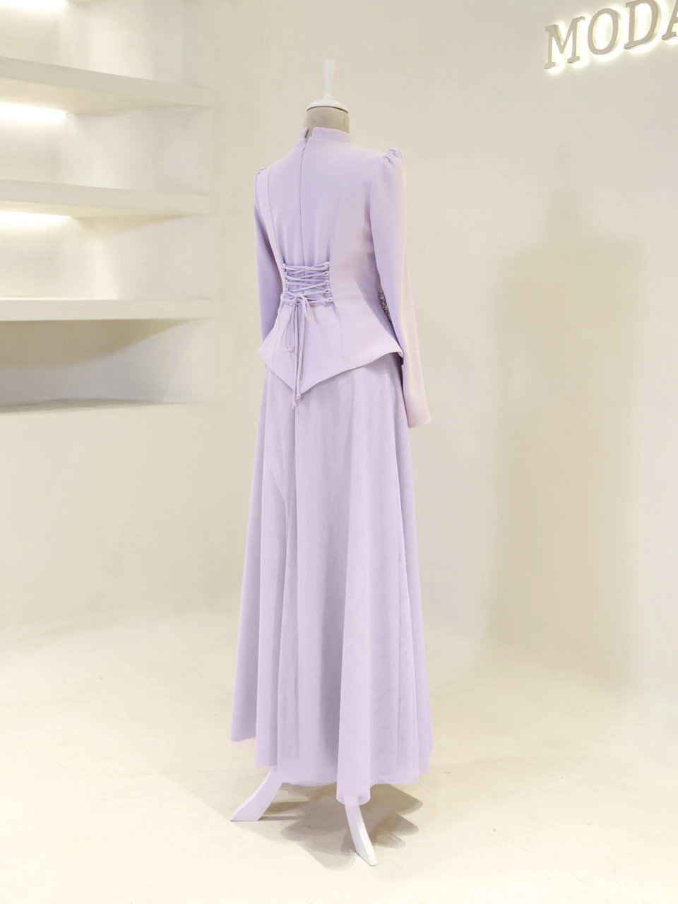 The Alira Modest Outfit Set is designed to provide a full fit with its elegant crepe top and flowing tulle skirt. The top measures 60 cm in length, while the skirt is 115 cm long. The outfit is equipped with a back zipper and tie for convenience. It includes a chest pad and is fully lined for comfort. The embellishments are adhesive, and the skirt has a flared design.