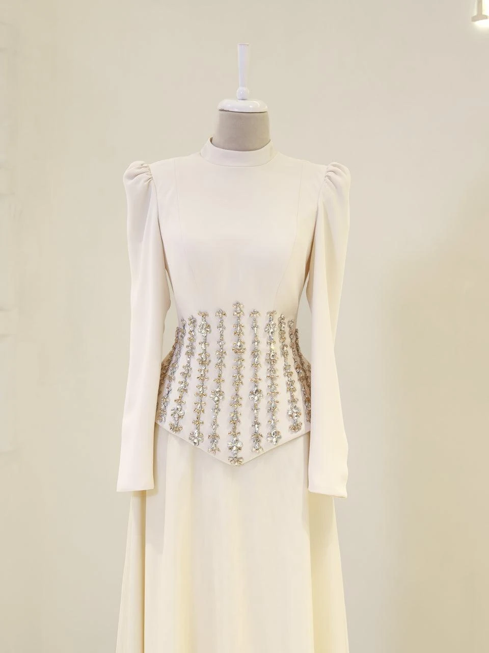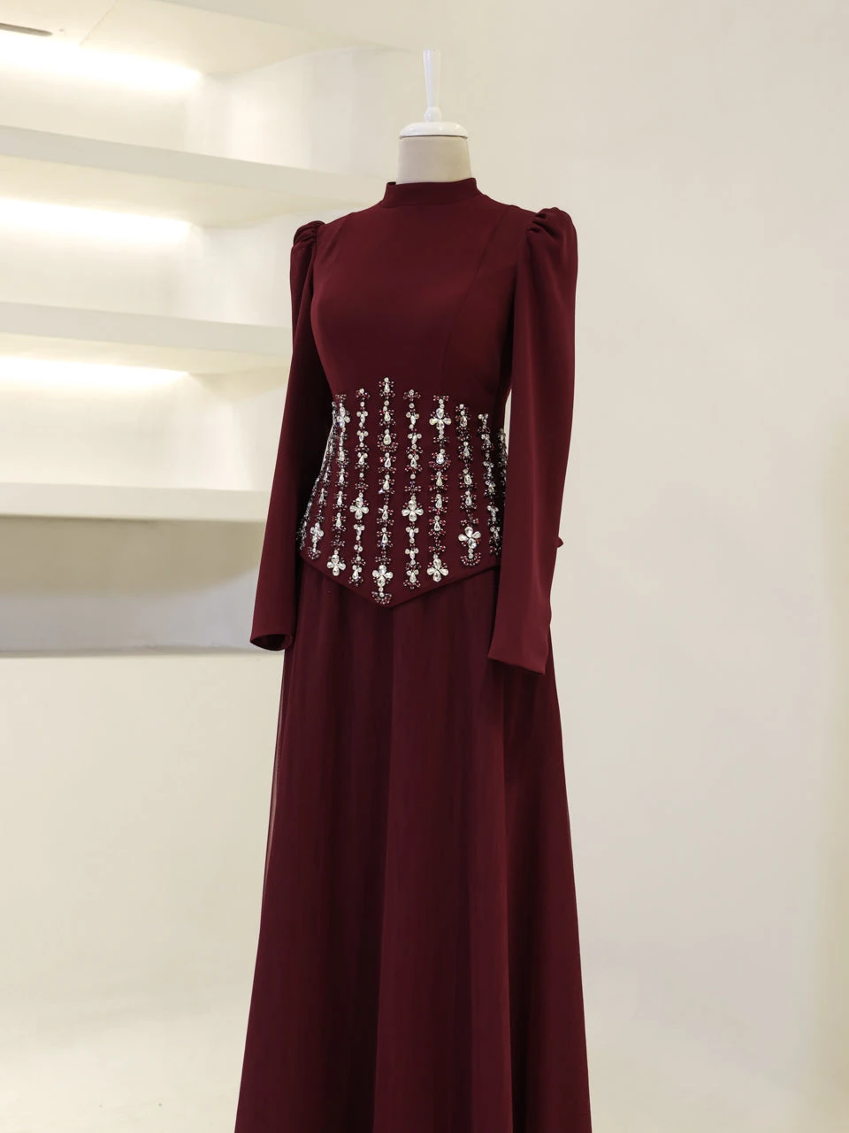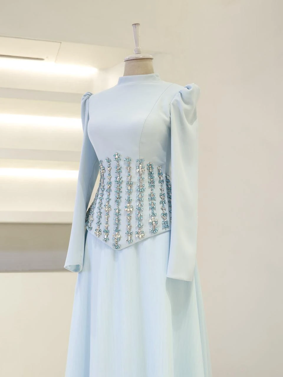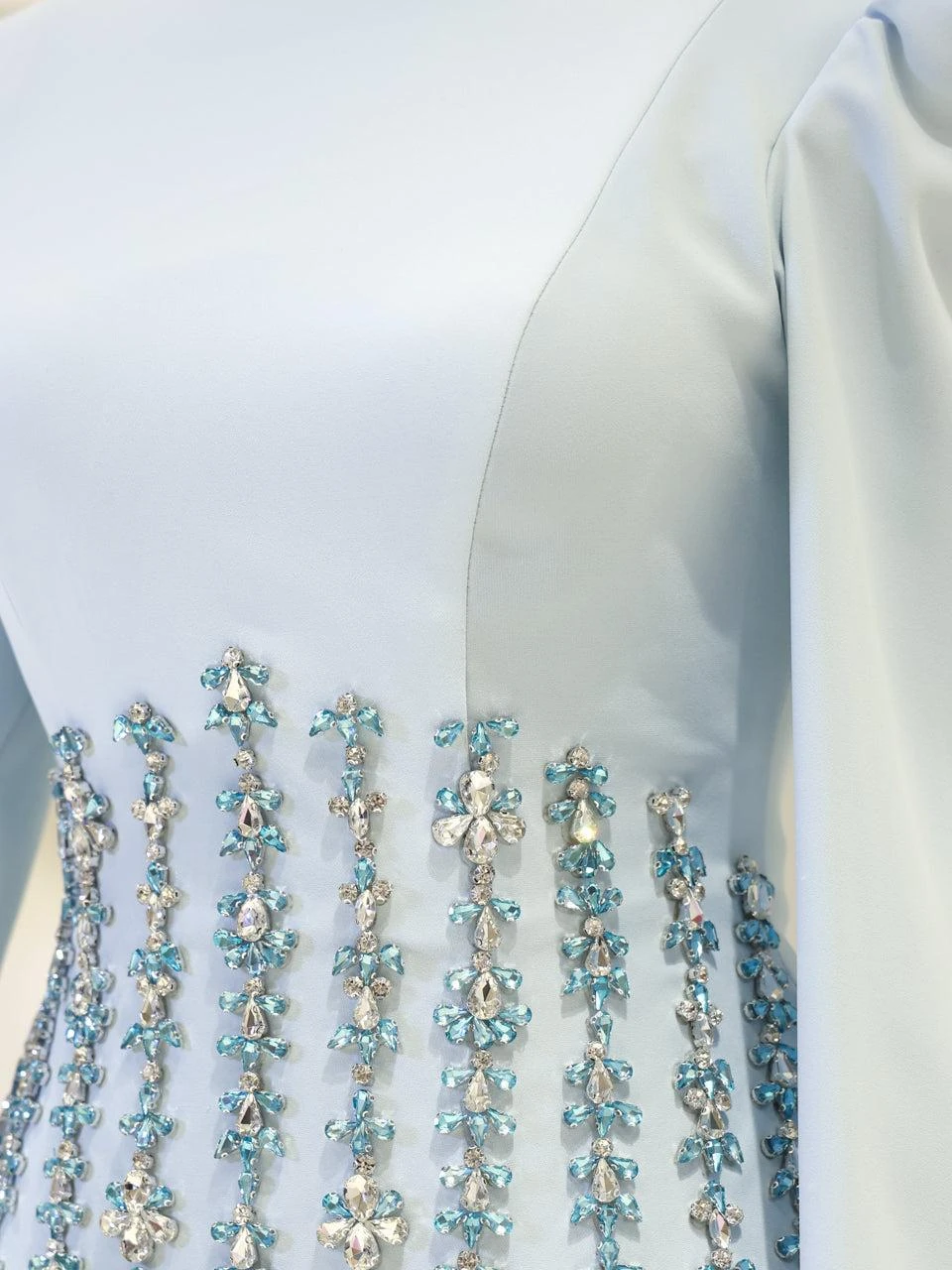 The Alira Modest Outfit Set is designed to provide a full fit with its elegant crepe top and flowing tulle skirt. The top measures 60 cm in length, while the skirt is 115 cm long. The outfit is equipped with a back zipper and tie for convenience. It includes a chest pad and is fully lined for comfort. The embellishments are adhesive, and the skirt has a flared design.