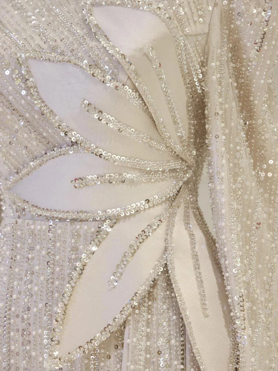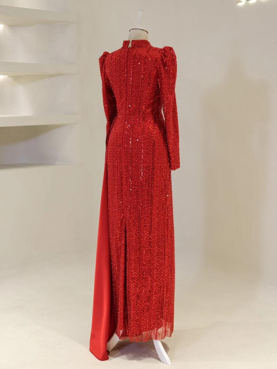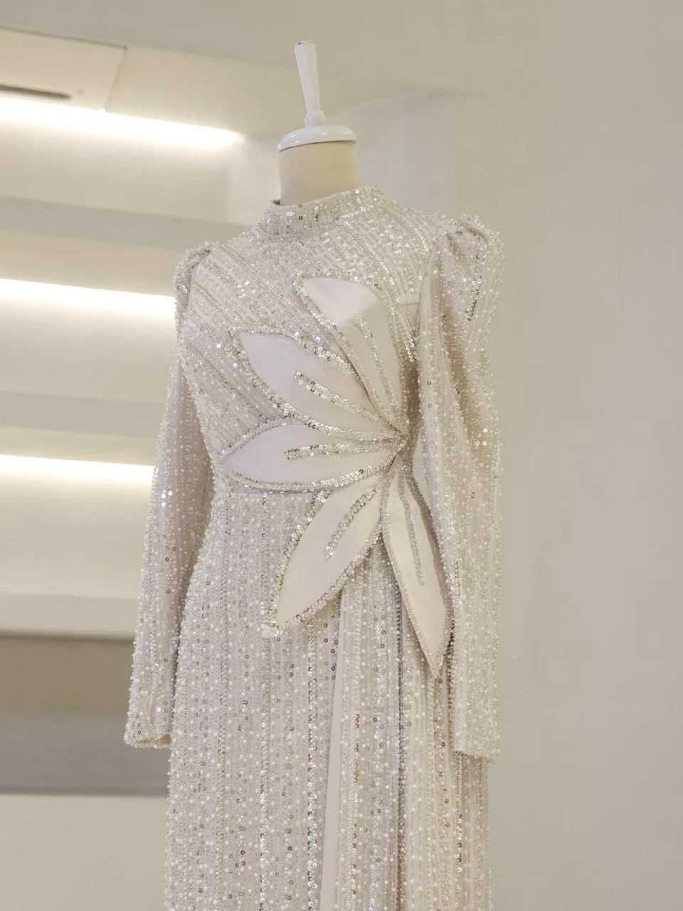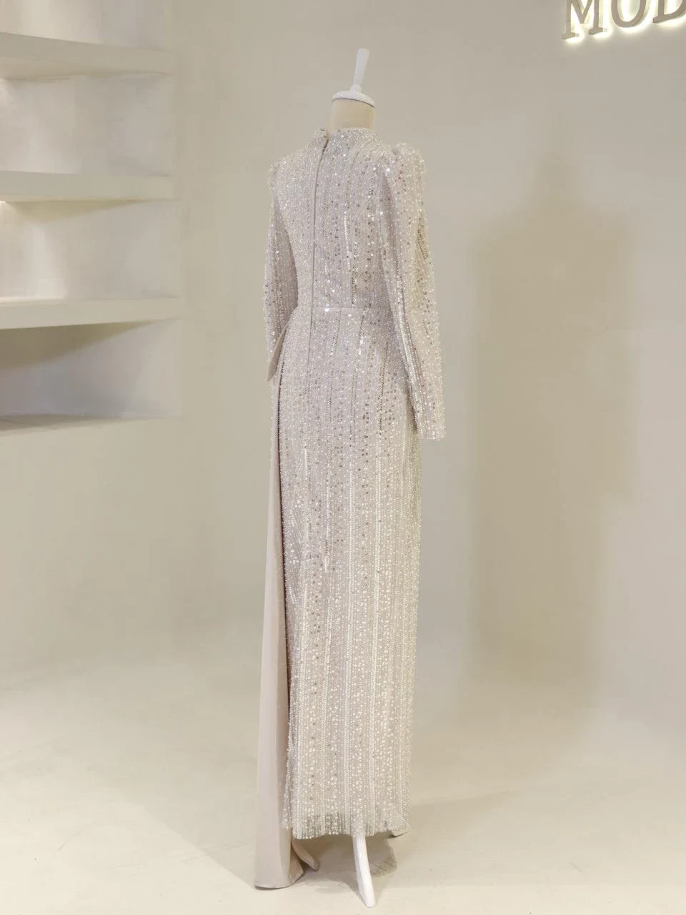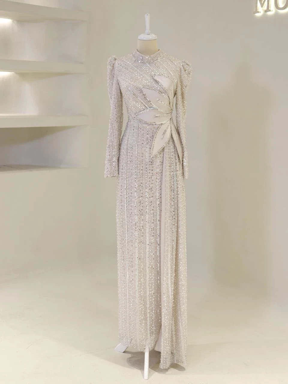 The Alisya Modest Evening Dress is designed with a precise fit, ensuring comfort and style. It measures approximately 155 cm in length and is crafted from tulle fabric, providing a delicate and refined appearance. The dress includes a lining for added comfort and coverage. It is equipped with a back zipper for easy wear and features a built-in chest pad for support. Unlike other designs, the embellishments are not glued, ensuring durability. The dress has a straight skirt form, offering a timeless silhouette.