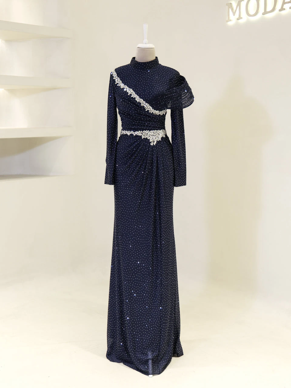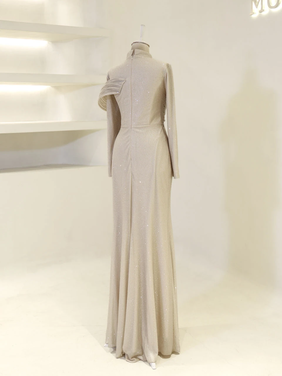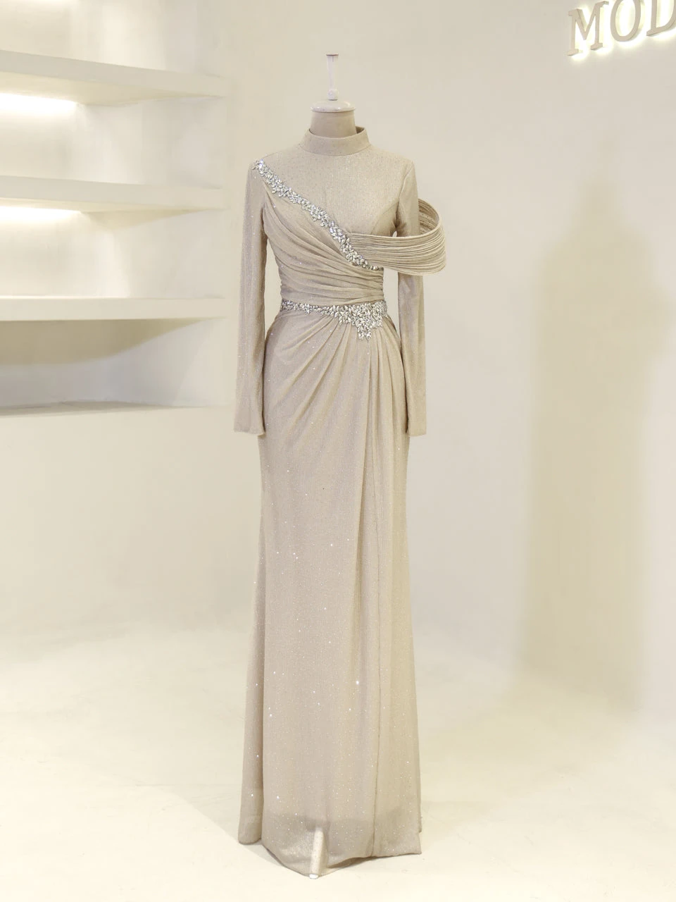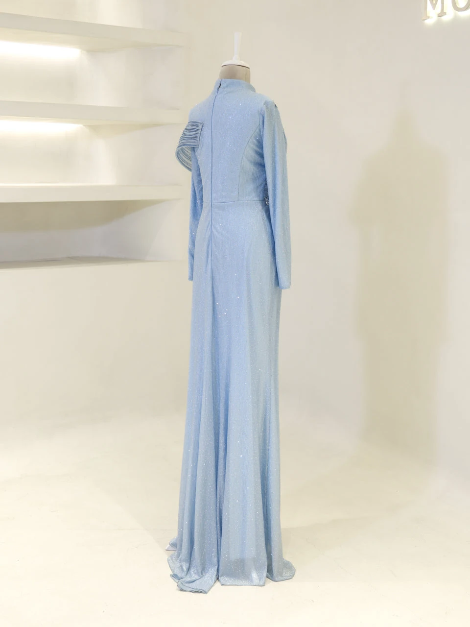 The Alzena Modest Evening Dress is designed for a perfect fit, with an average length of 165 cm. Made from tulle fabric, it features a convenient back zipper for easy wear. The dress includes a built-in chest pad and is fully lined for comfort. The embellishments are securely attached, and the dress has a flared skirt design for a graceful look.