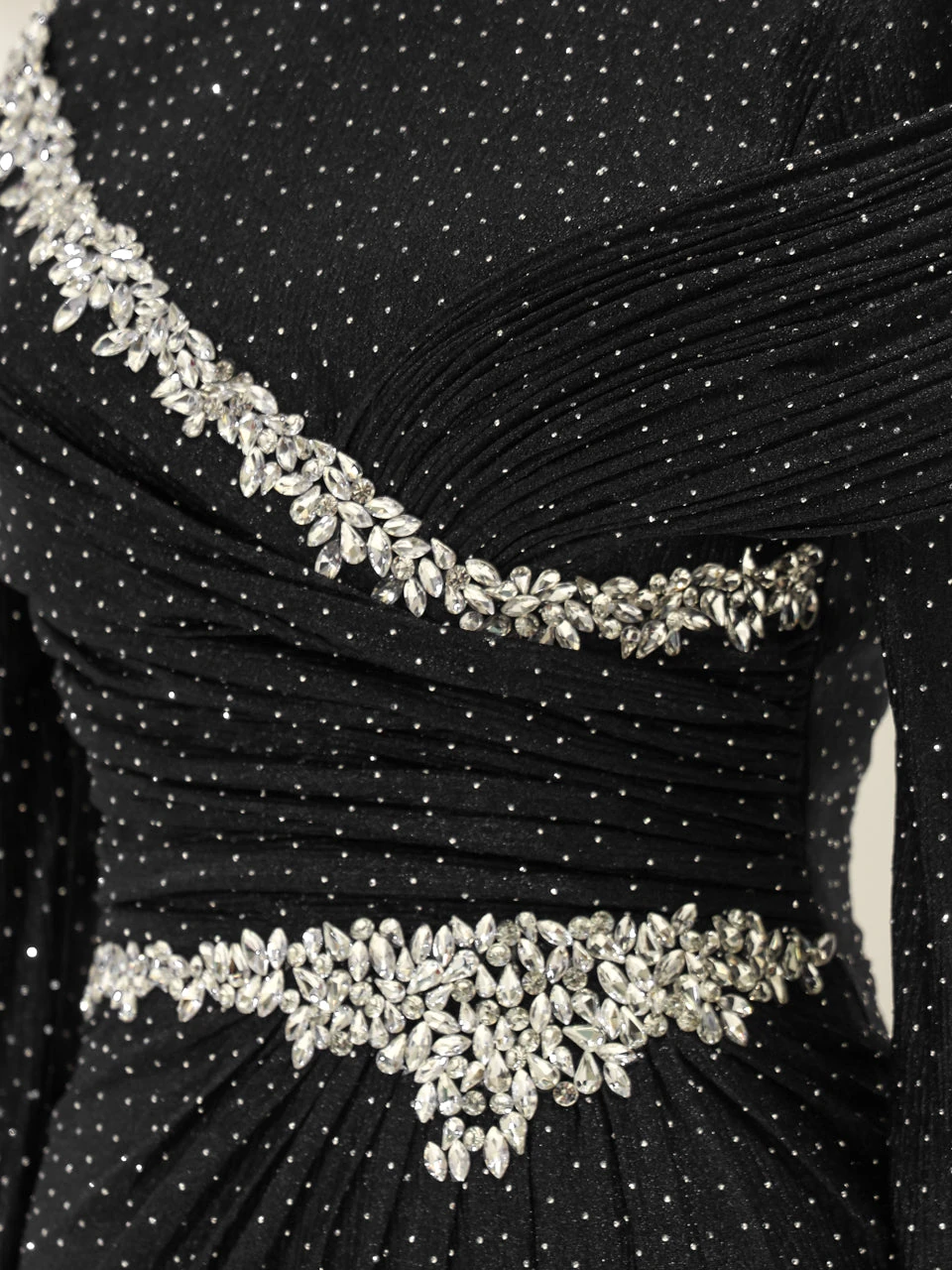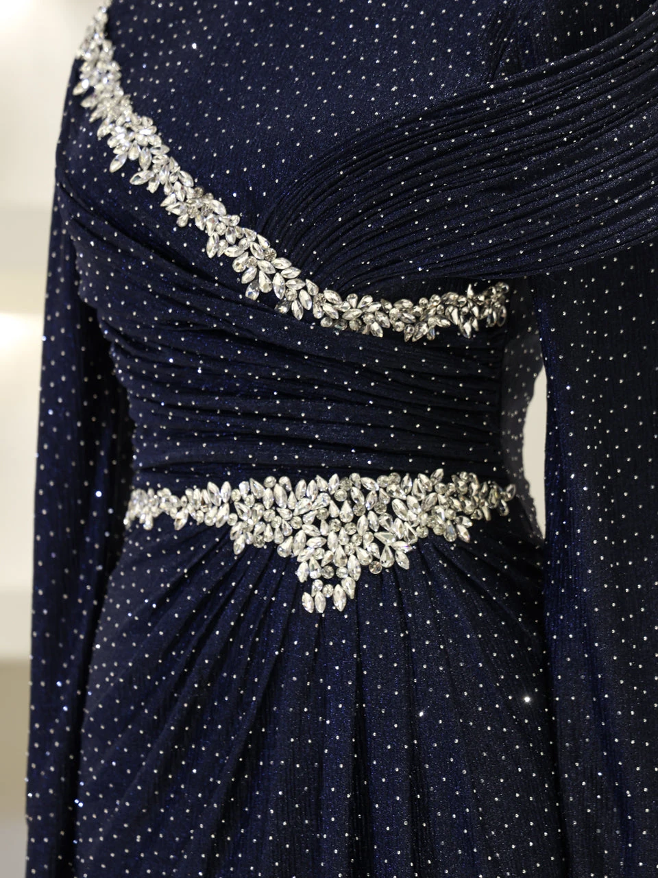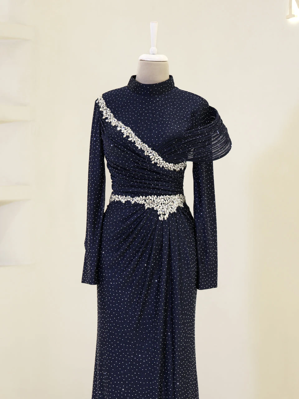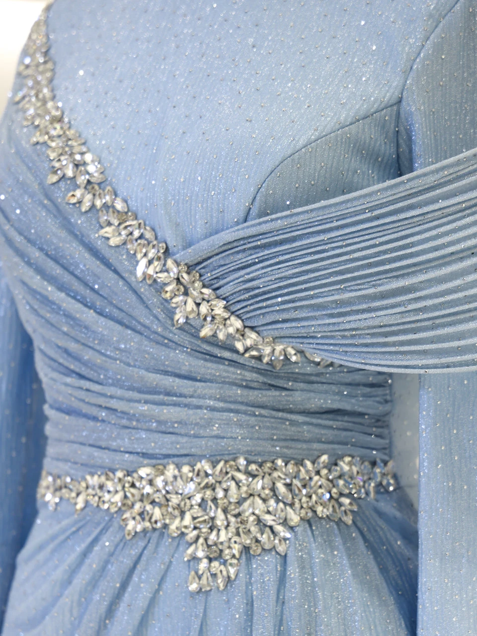 The Alzena Modest Evening Dress is designed for a perfect fit, with an average length of 165 cm. Made from tulle fabric, it features a convenient back zipper for easy wear. The dress includes a built-in chest pad and is fully lined for comfort. The embellishments are securely attached, and the dress has a flared skirt design for a graceful look.