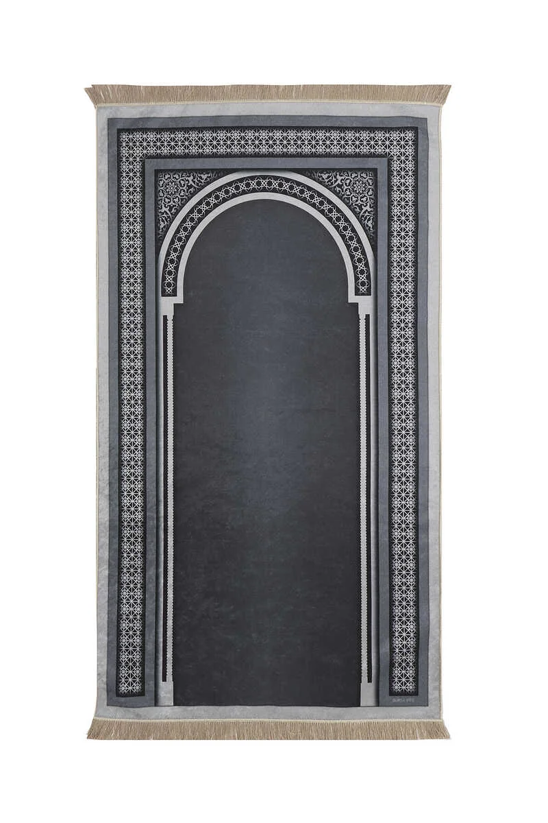 The Anthracite Velvet Prayer Rug combines traditional Turkish motifs and tile patterns to offer a decorative appearance. Measuring 65×115 cm, it is designed for comfortable use with its velvet texture. Originating from Bursa, Turkey, this rug adds both style and practicality to your prayer routine.