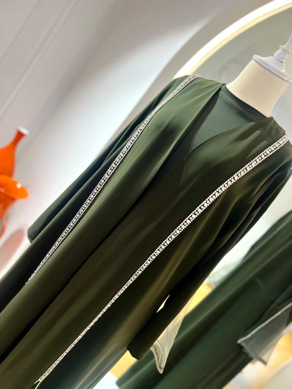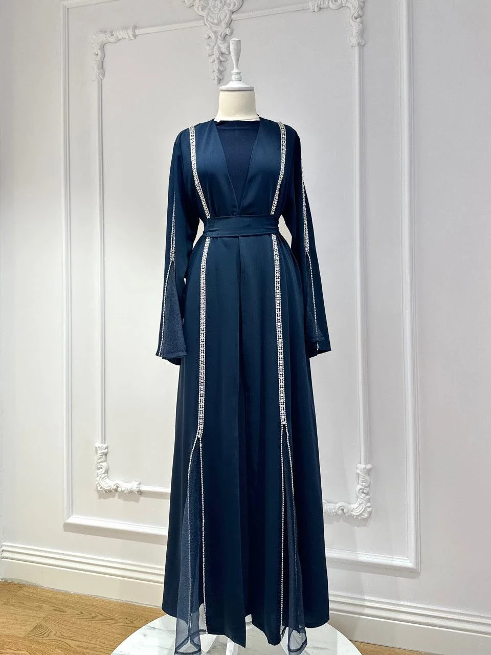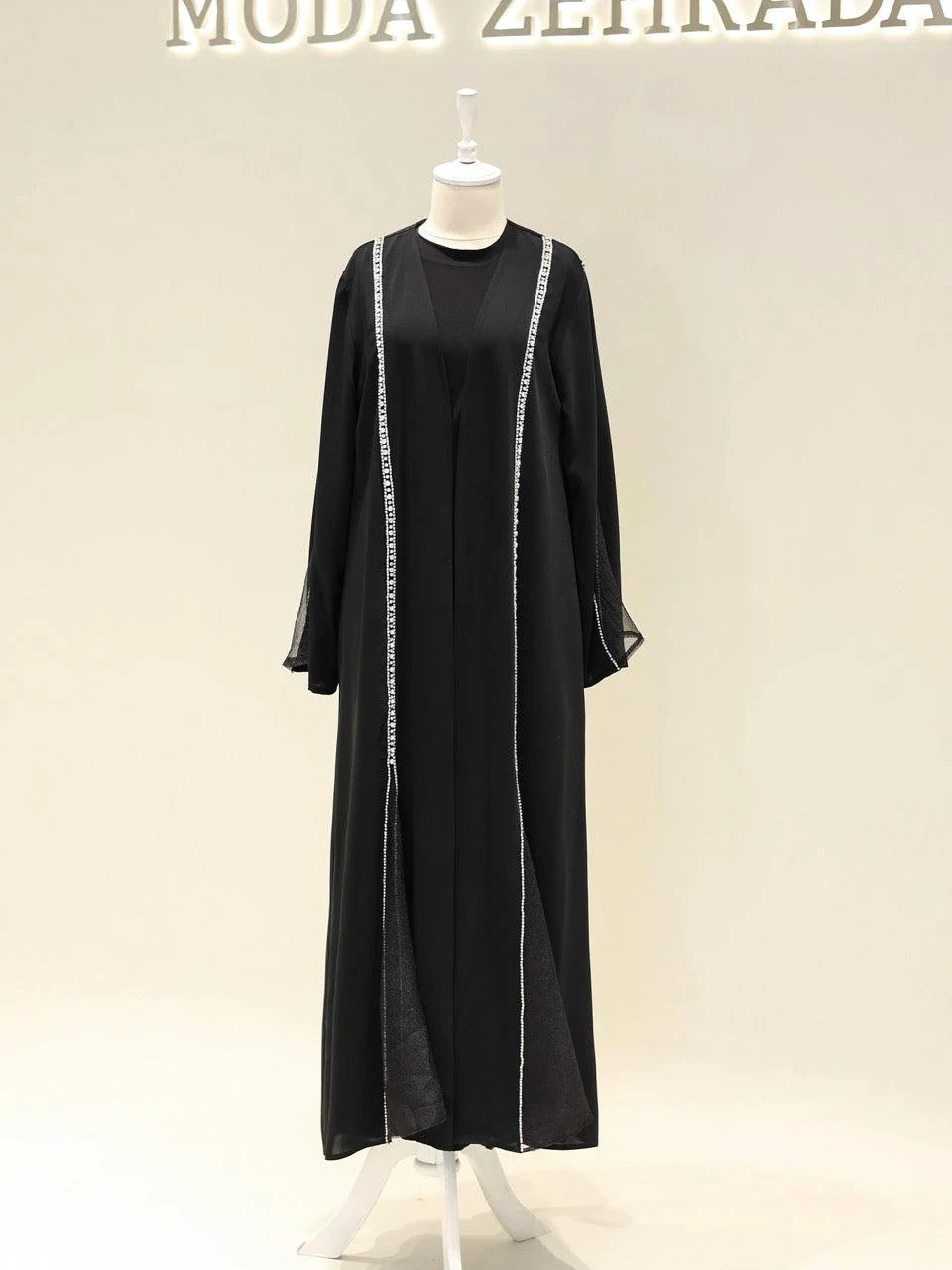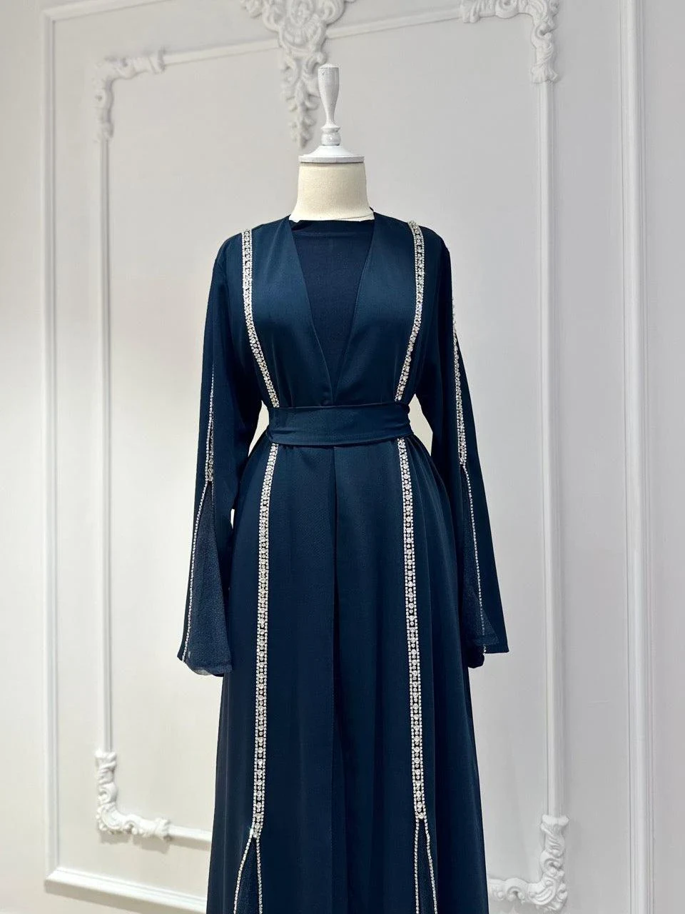 The Anyeja Abaya Modest Set is designed for comfort and style. With a length of 145 cm, both the abaya and the inner garment provide ample coverage. Crafted from crepe fabric, this set offers an oversize fit, making it suitable for various body types. It comes with a detachable belt for added versatility. The embellishments are securely attached, ensuring durability. The inner garment features long sleeves, providing additional coverage.