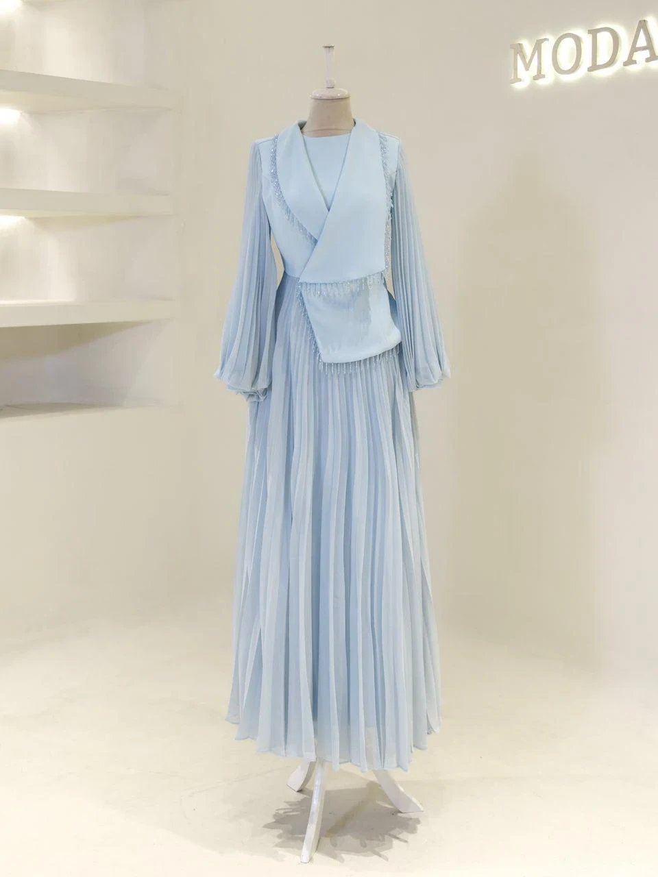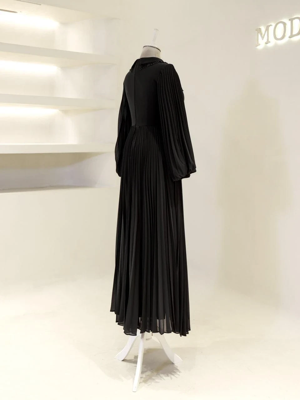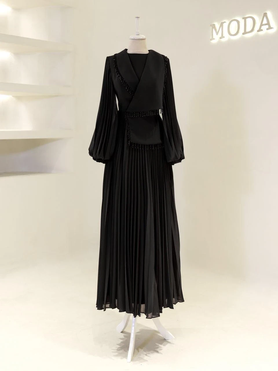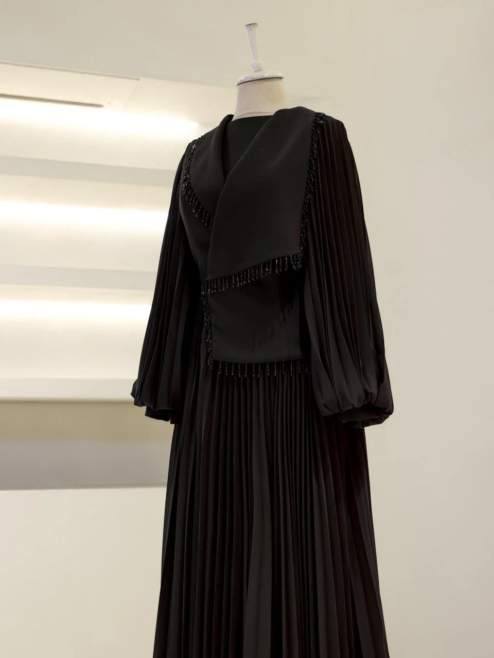 The Arva Modest Evening Dress is designed to provide both style and comfort. It features a crepe fabric top and a chiffon fabric skirt, offering a sophisticated look. The dress is fully lined and includes a zipper at the back for easy wearing. It also comes with a built-in chest pad for added support. The embellishments on the dress are not glued, ensuring a high-quality finish. The skirt has a pleated design, adding a touch of elegance to the overall look. The dress length ranges from 145 to 150 cm.