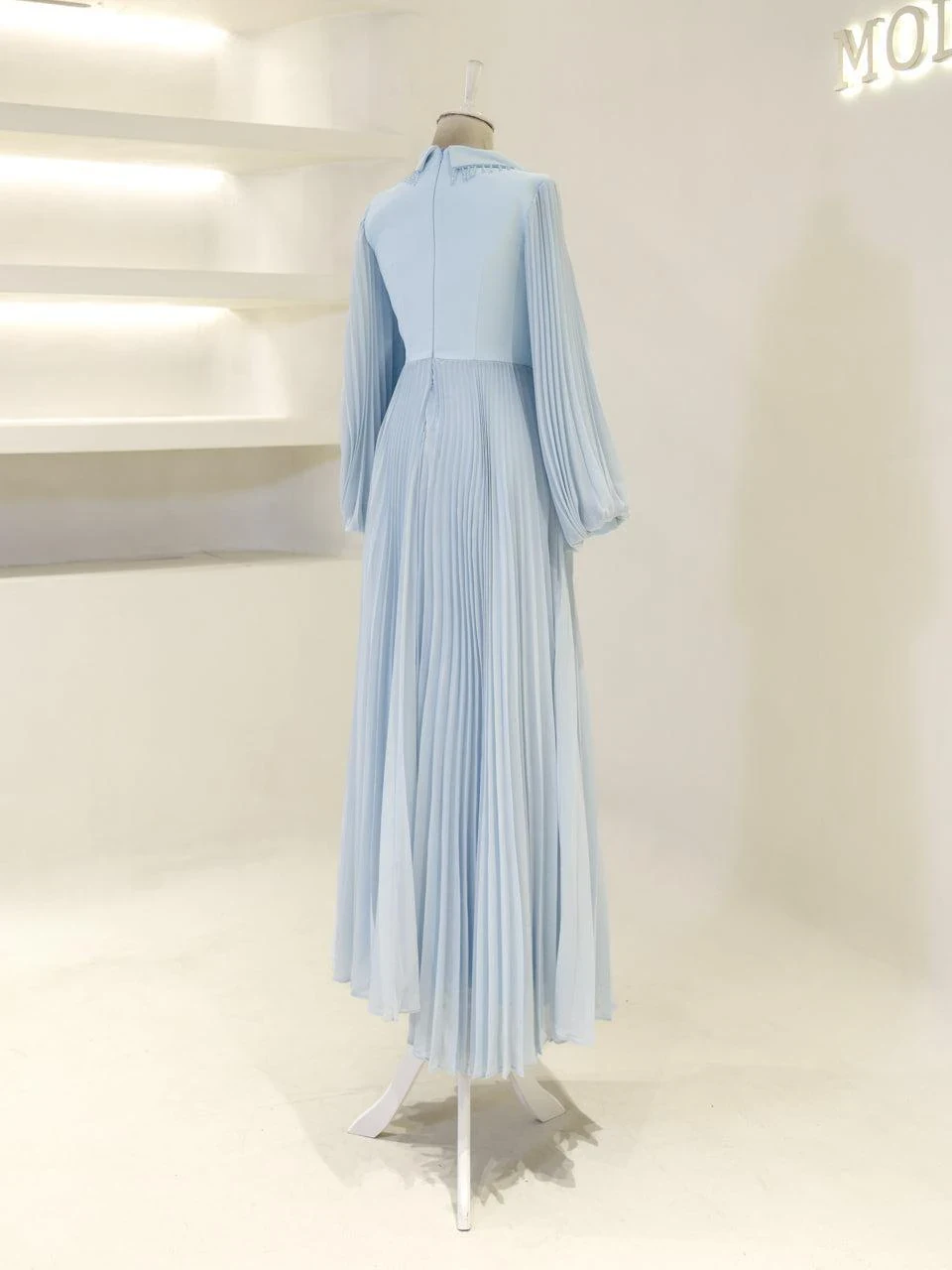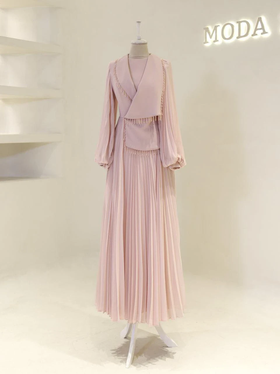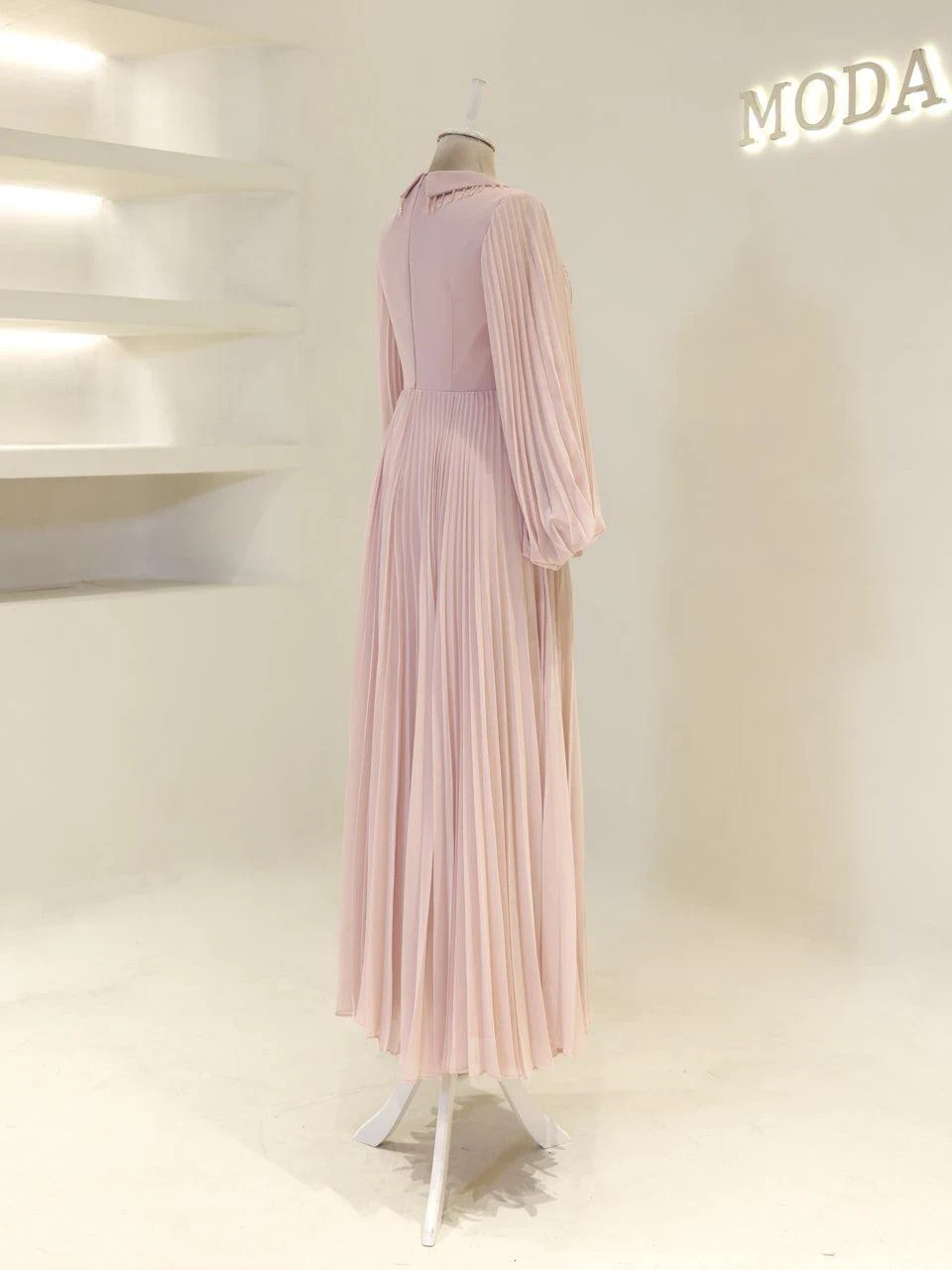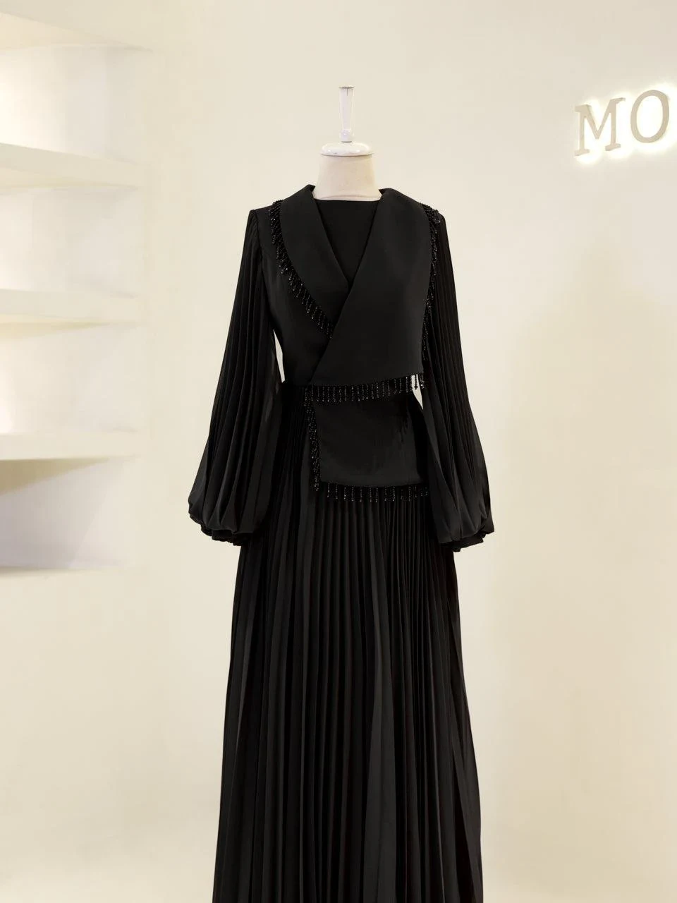 The Arva Modest Evening Dress is designed to provide both style and comfort. It features a crepe fabric top and a chiffon fabric skirt, offering a sophisticated look. The dress is fully lined and includes a zipper at the back for easy wearing. It also comes with a built-in chest pad for added support. The embellishments on the dress are not glued, ensuring a high-quality finish. The skirt has a pleated design, adding a touch of elegance to the overall look. The dress length ranges from 145 to 150 cm.