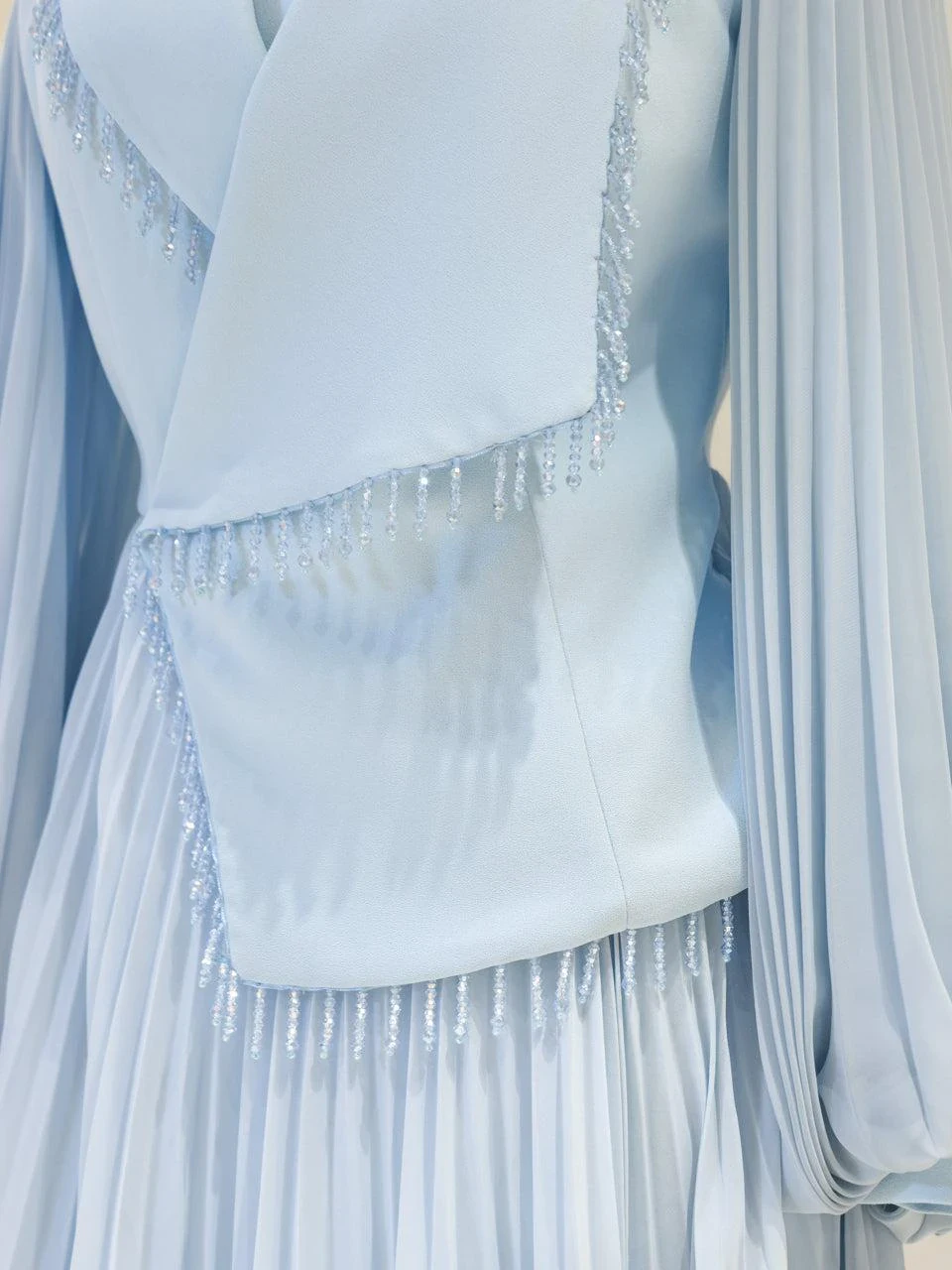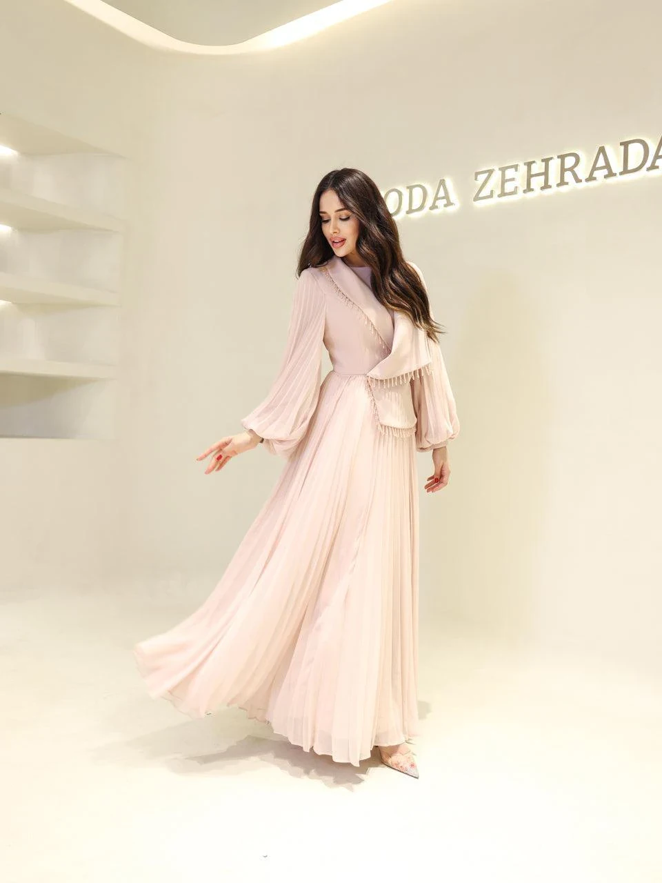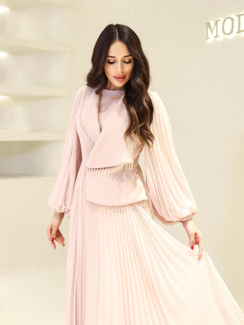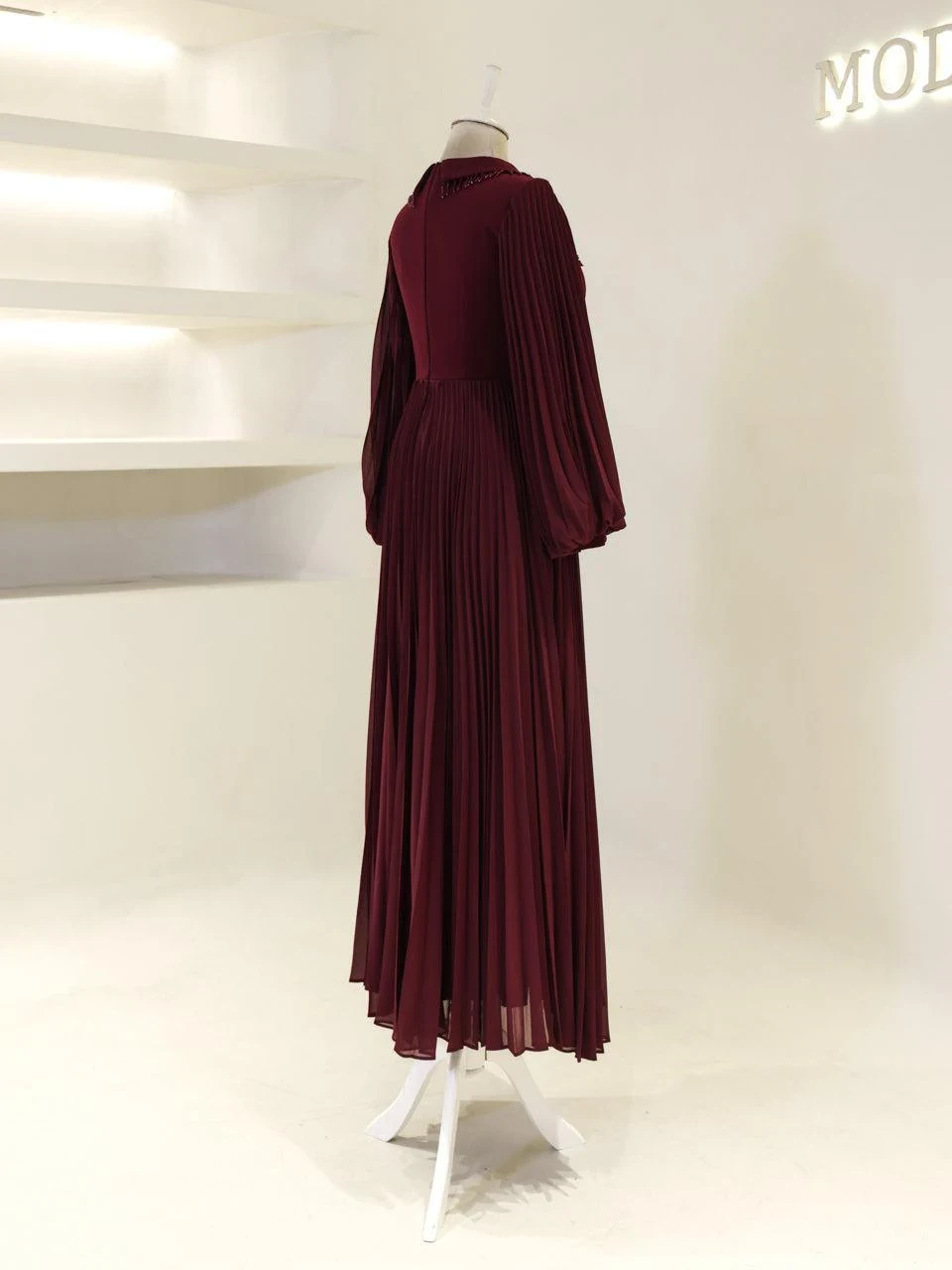 The Arva Modest Evening Dress is designed to provide both style and comfort. It features a crepe fabric top and a chiffon fabric skirt, offering a sophisticated look. The dress is fully lined and includes a zipper at the back for easy wearing. It also comes with a built-in chest pad for added support. The embellishments on the dress are not glued, ensuring a high-quality finish. The skirt has a pleated design, adding a touch of elegance to the overall look. The dress length ranges from 145 to 150 cm.
