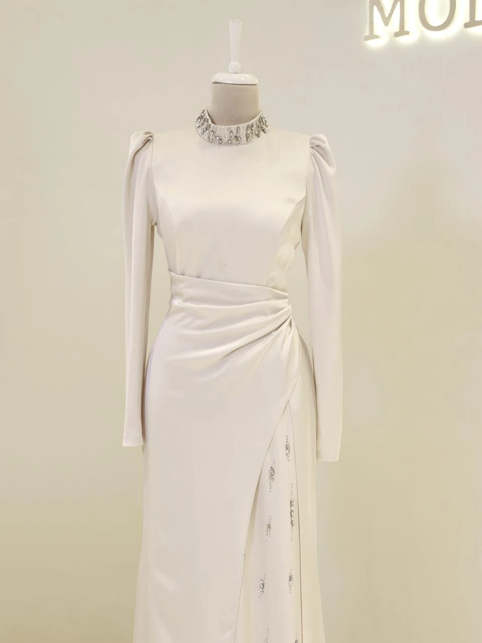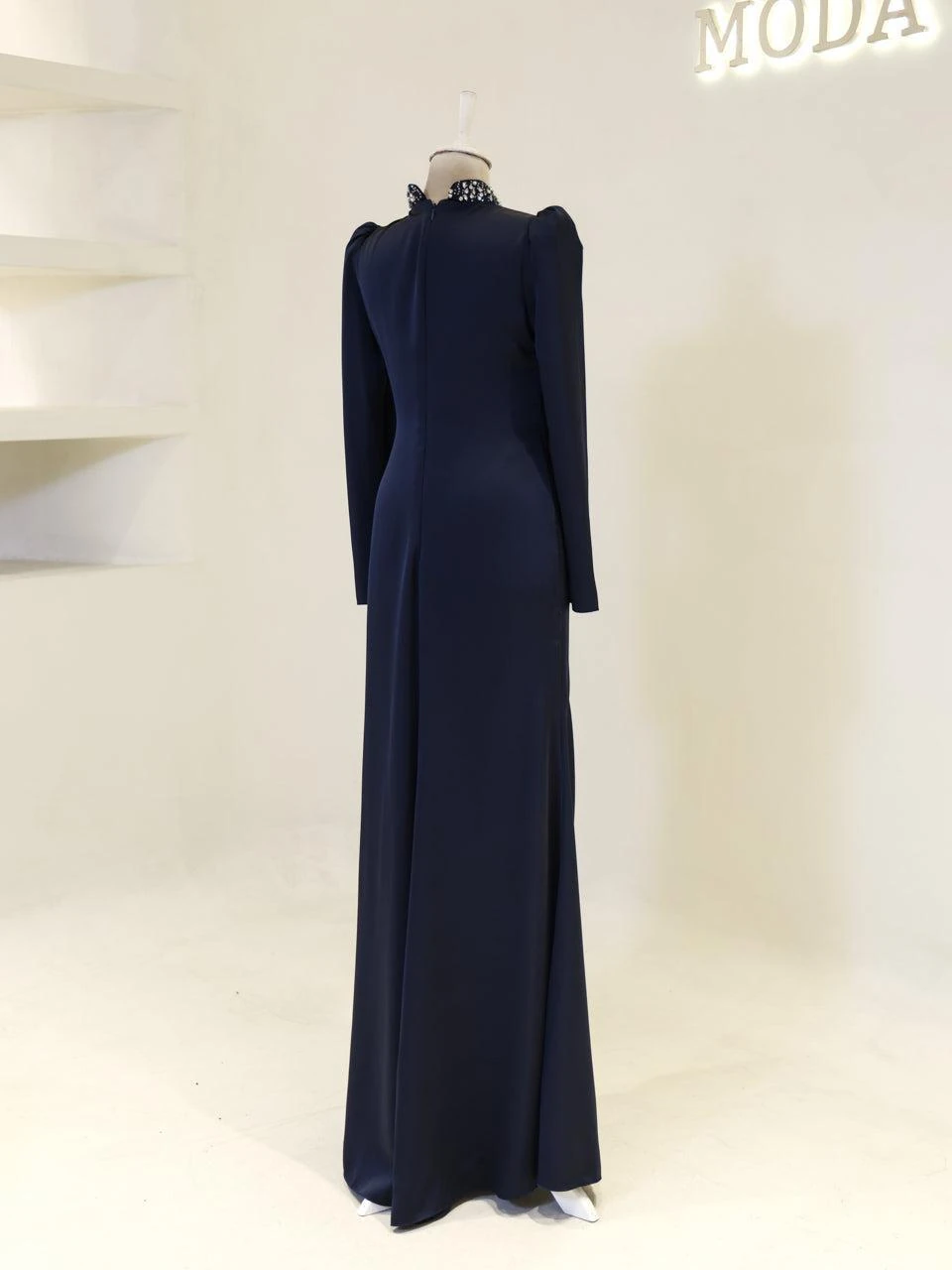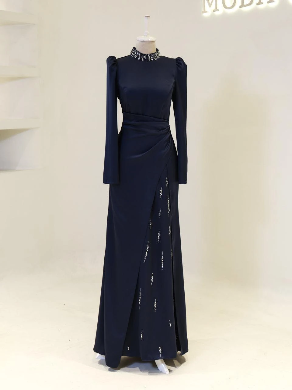 The Avenza Modest Evening Dress is designed for a perfect fit with a length of 160 cm. Made from satin fabric, it features a concealed back zipper for a seamless look. The dress includes a built-in chest pad and is fully lined for comfort. Decorative embellishments are adhered to the fabric, and the dress is styled with an A-line skirt for a classic silhouette.