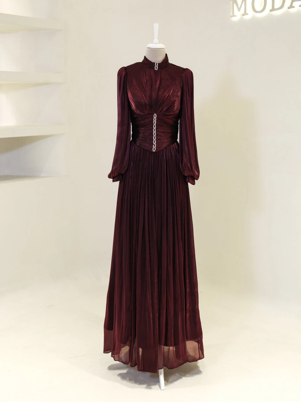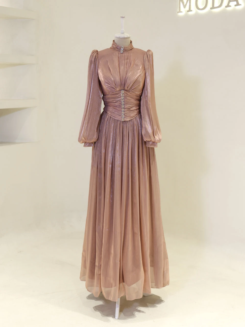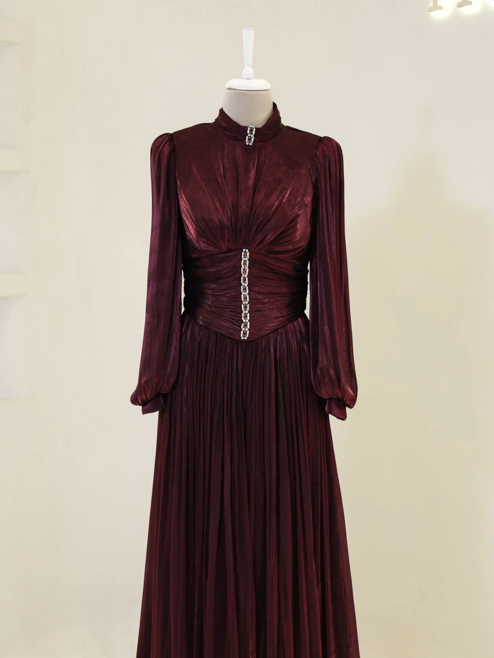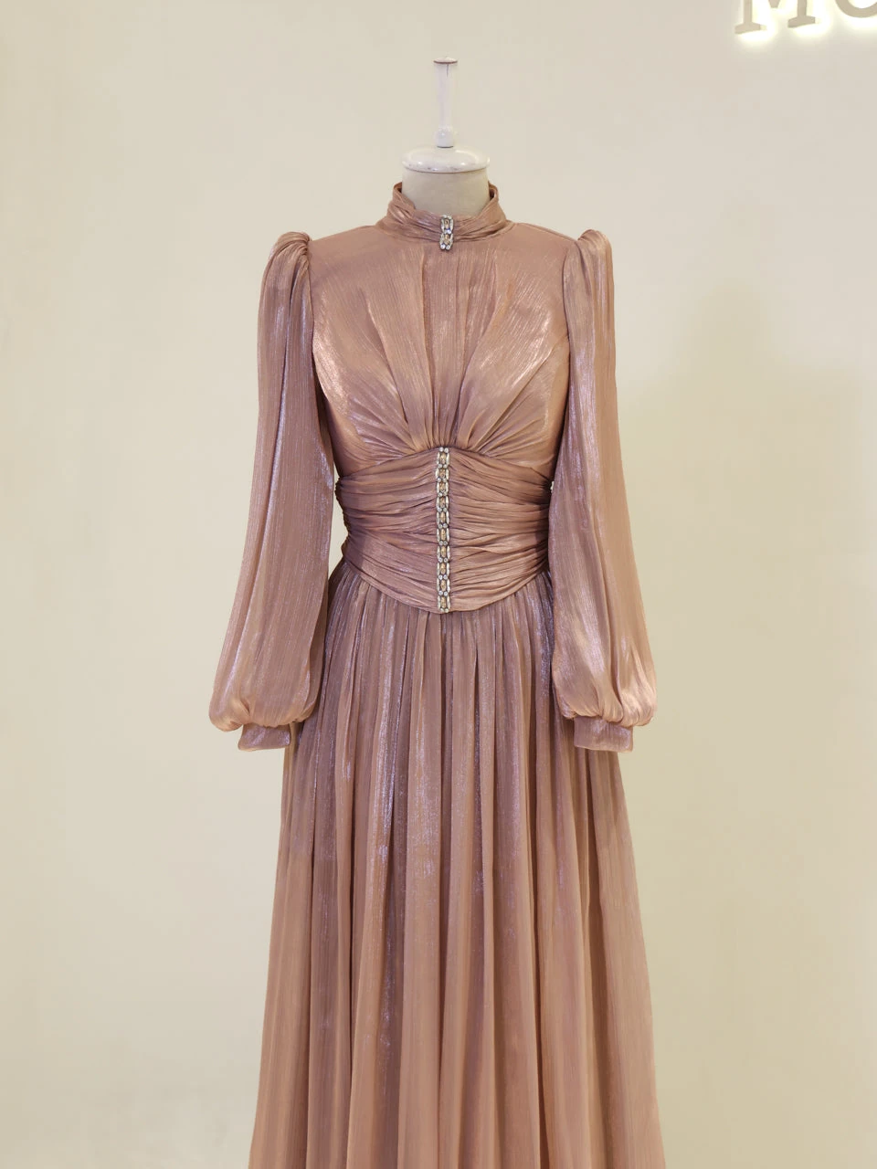 The Azoria Modest Evening Dress is designed with a full fit and measures 150 cm in length. Made from orchid fabric, it features a lining for added comfort. The dress is equipped with a back zipper for easy wear and includes a built-in chest pad. The embellishments are adhesively applied, and the dress has a flared skirt design, offering a graceful silhouette.