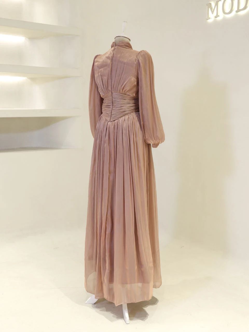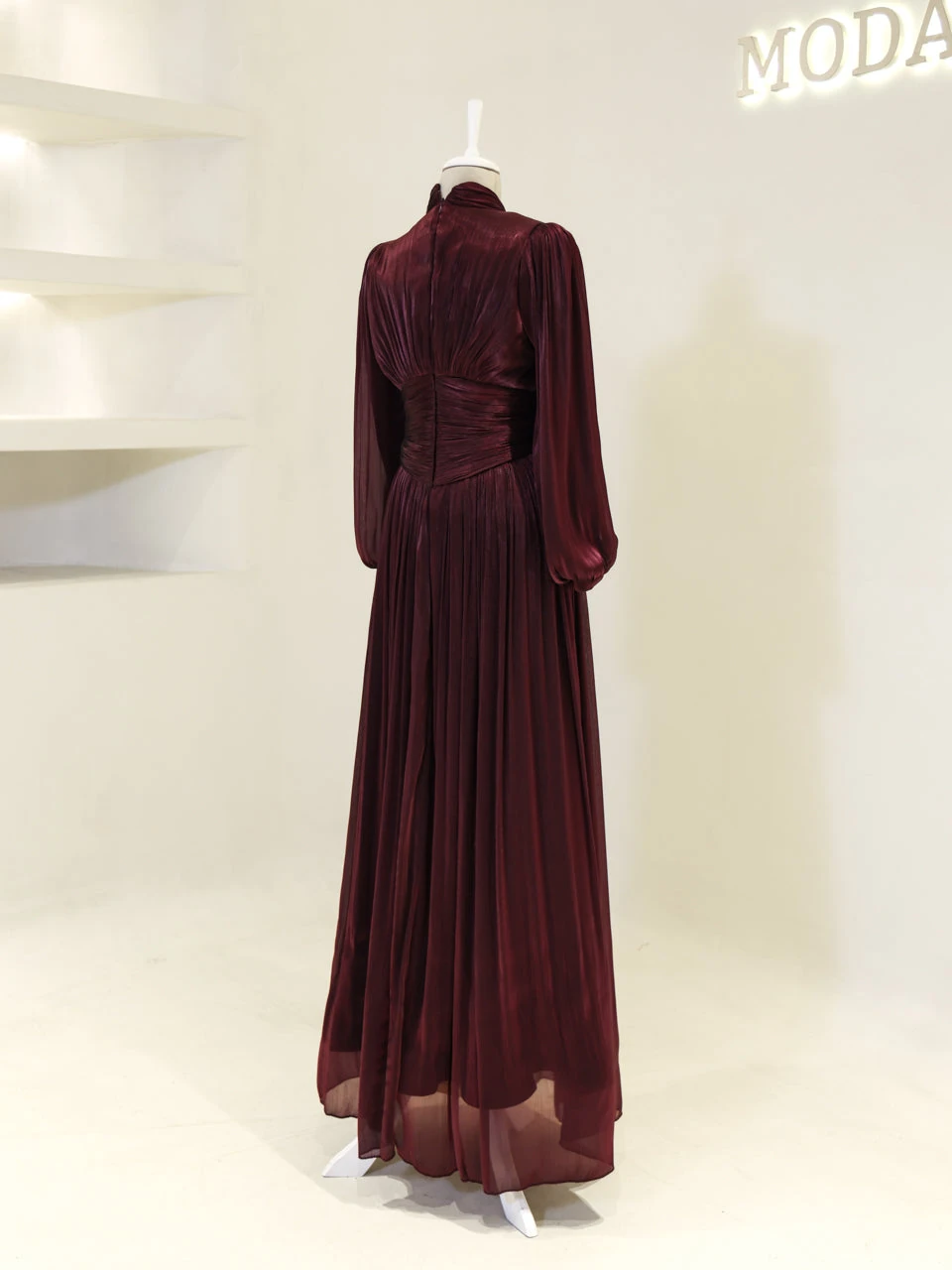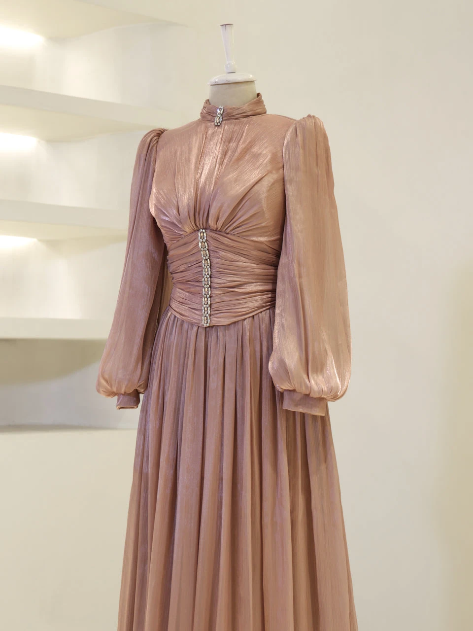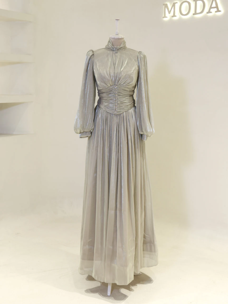 The Azoria Modest Evening Dress is designed with a full fit and measures 150 cm in length. Made from orchid fabric, it features a lining for added comfort. The dress is equipped with a back zipper for easy wear and includes a built-in chest pad. The embellishments are adhesively applied, and the dress has a flared skirt design, offering a graceful silhouette.