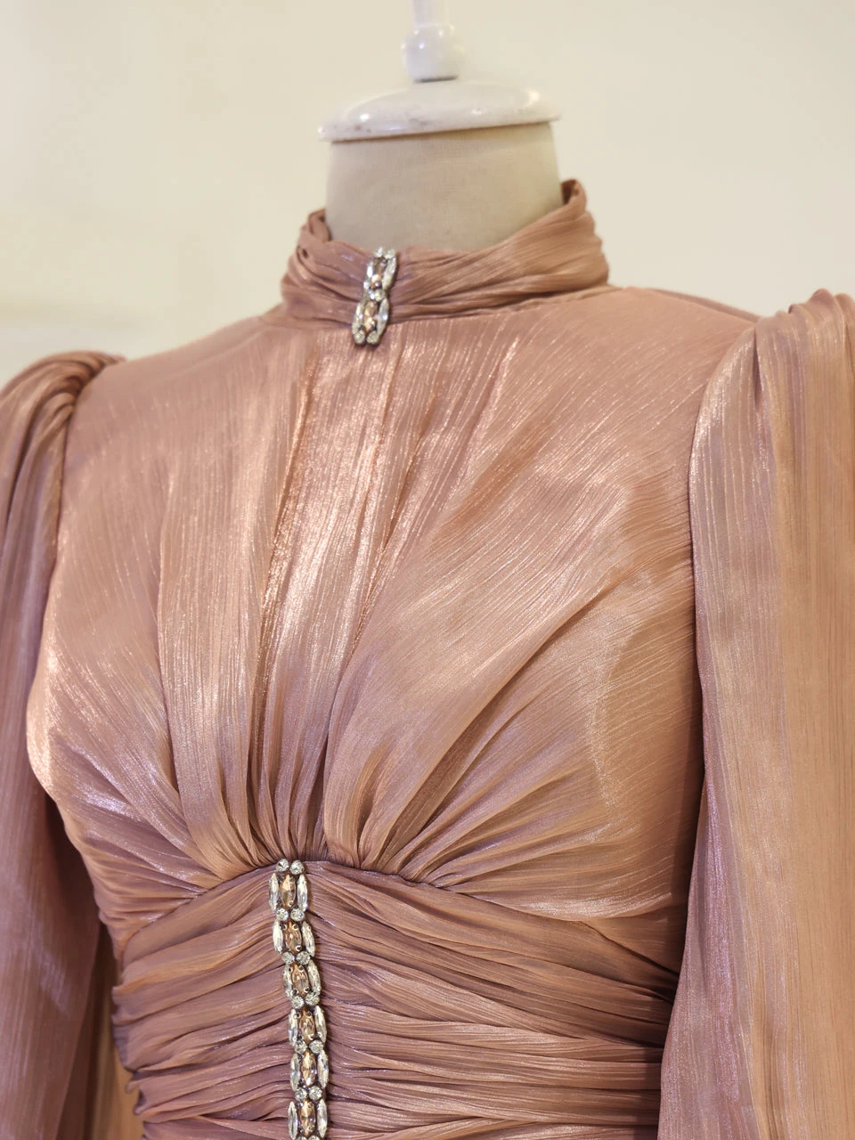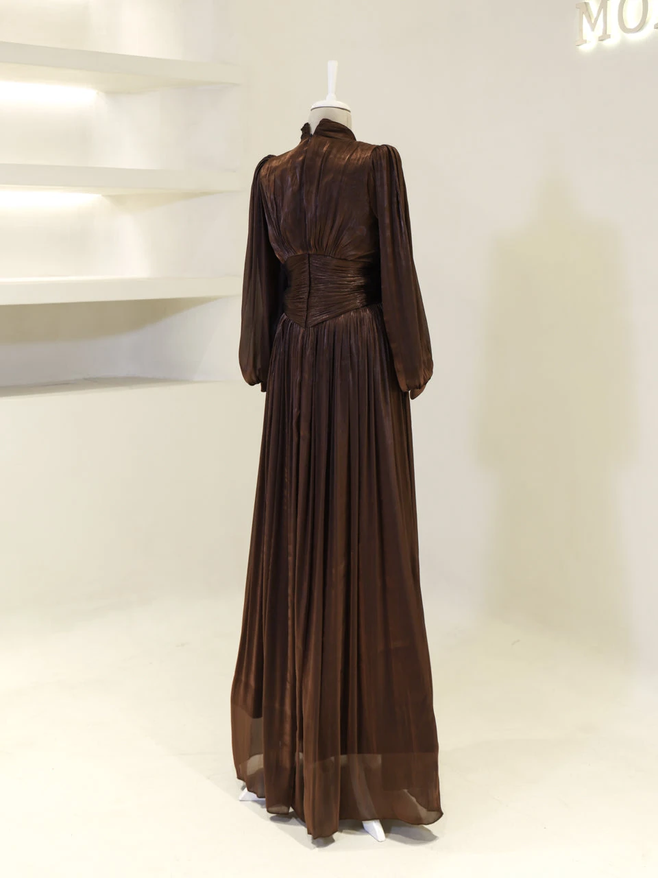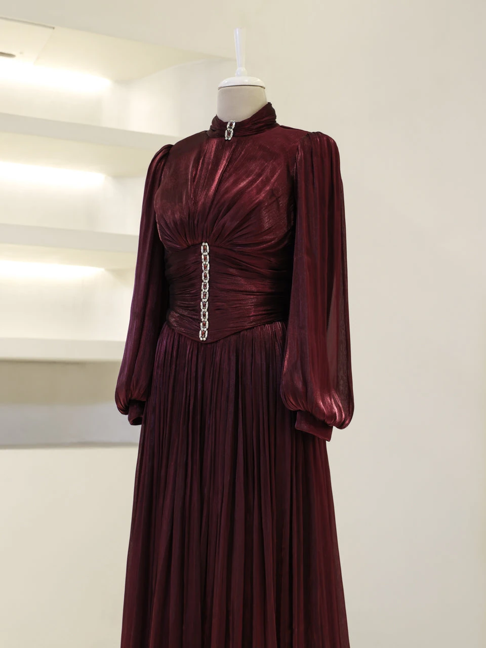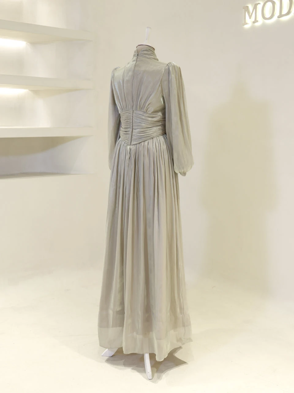 The Azoria Modest Evening Dress is designed with a full fit and measures 150 cm in length. Made from orchid fabric, it features a lining for added comfort. The dress is equipped with a back zipper for easy wear and includes a built-in chest pad. The embellishments are adhesively applied, and the dress has a flared skirt design, offering a graceful silhouette.
