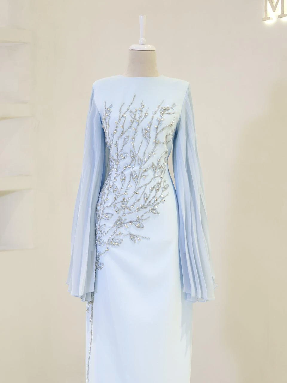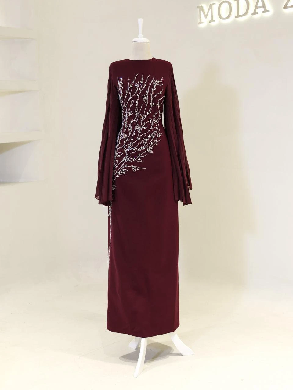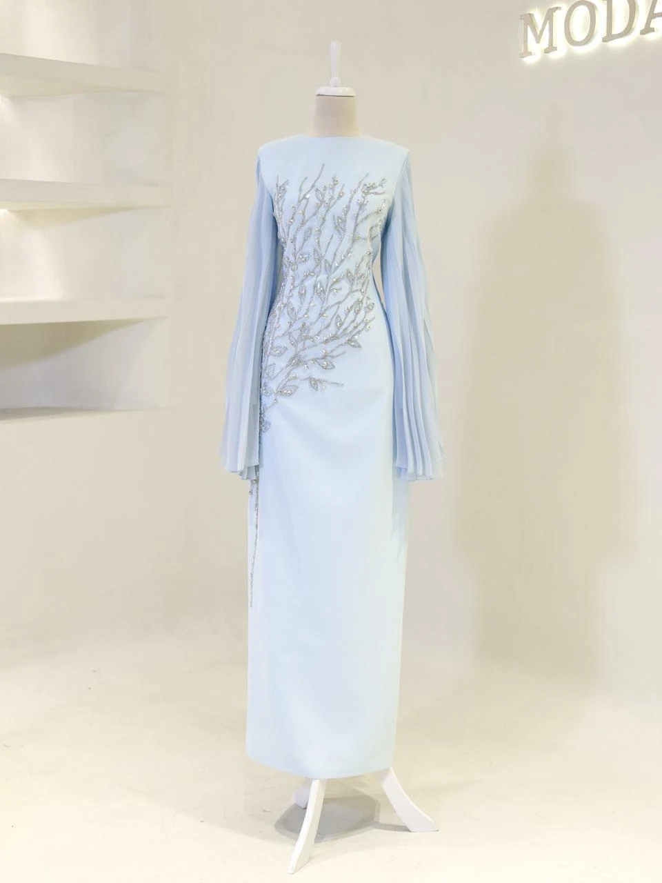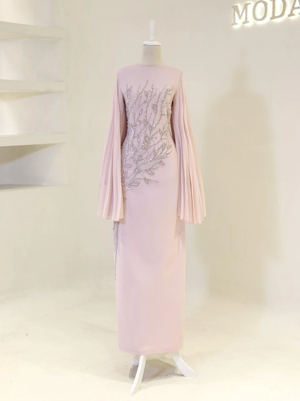 The Baire Modest Evening Dress features a full-length design measuring 150 cm. Made from crepe fabric, this dress is lined and includes a back zipper for easy wear. The Spanish sleeves and pencil skirt form add a touch of elegance. Please note, due to the adhesive nature of the embellishments, some may detach over time, but this will not significantly affect the dress’s overall appearance.