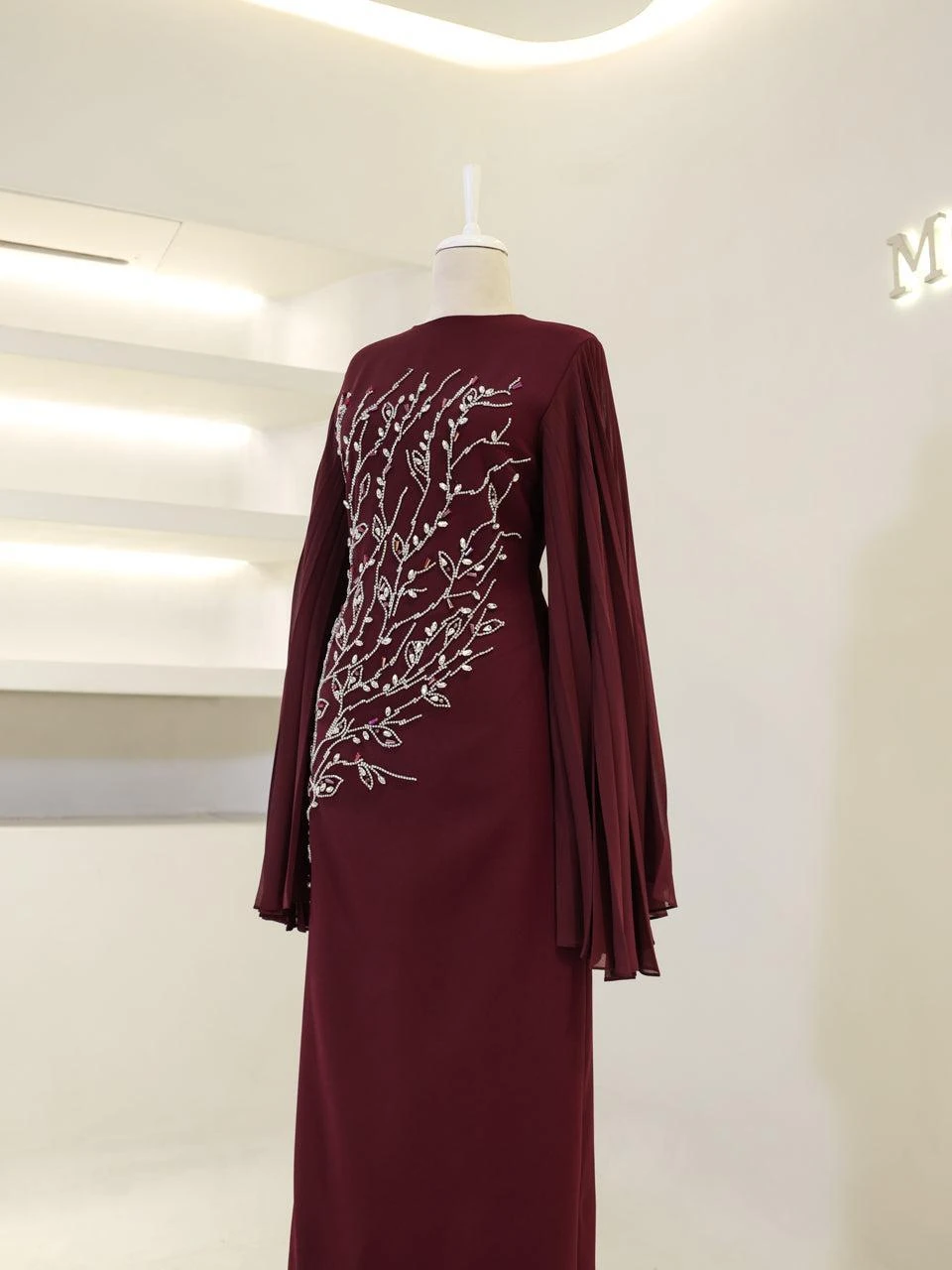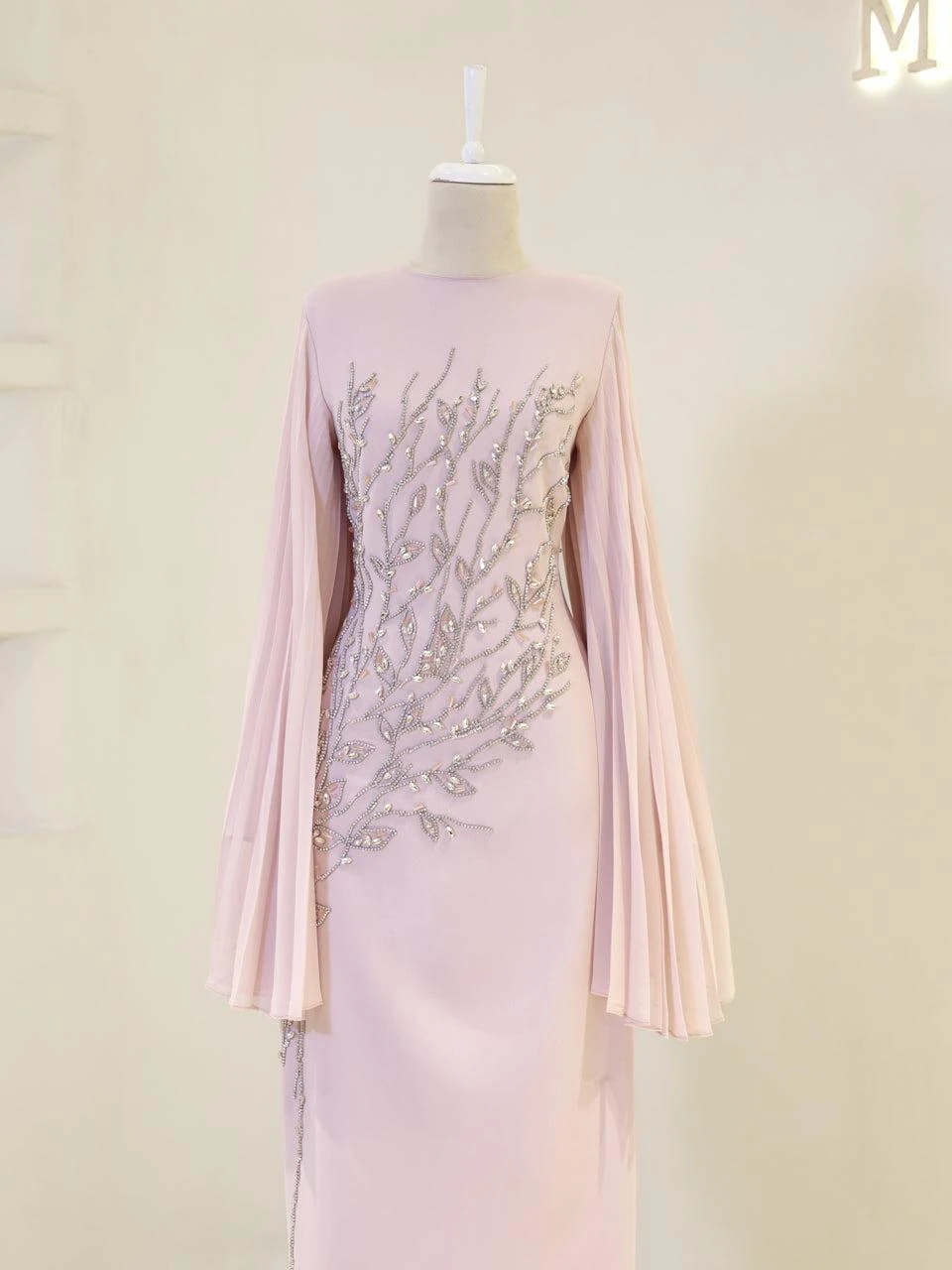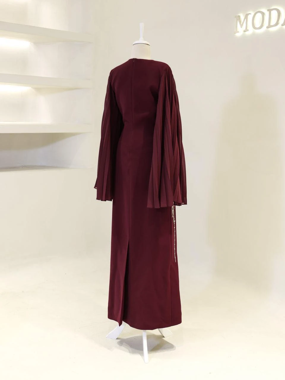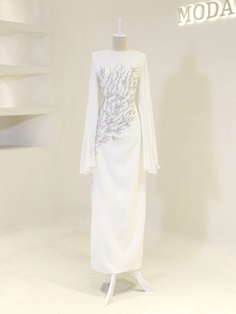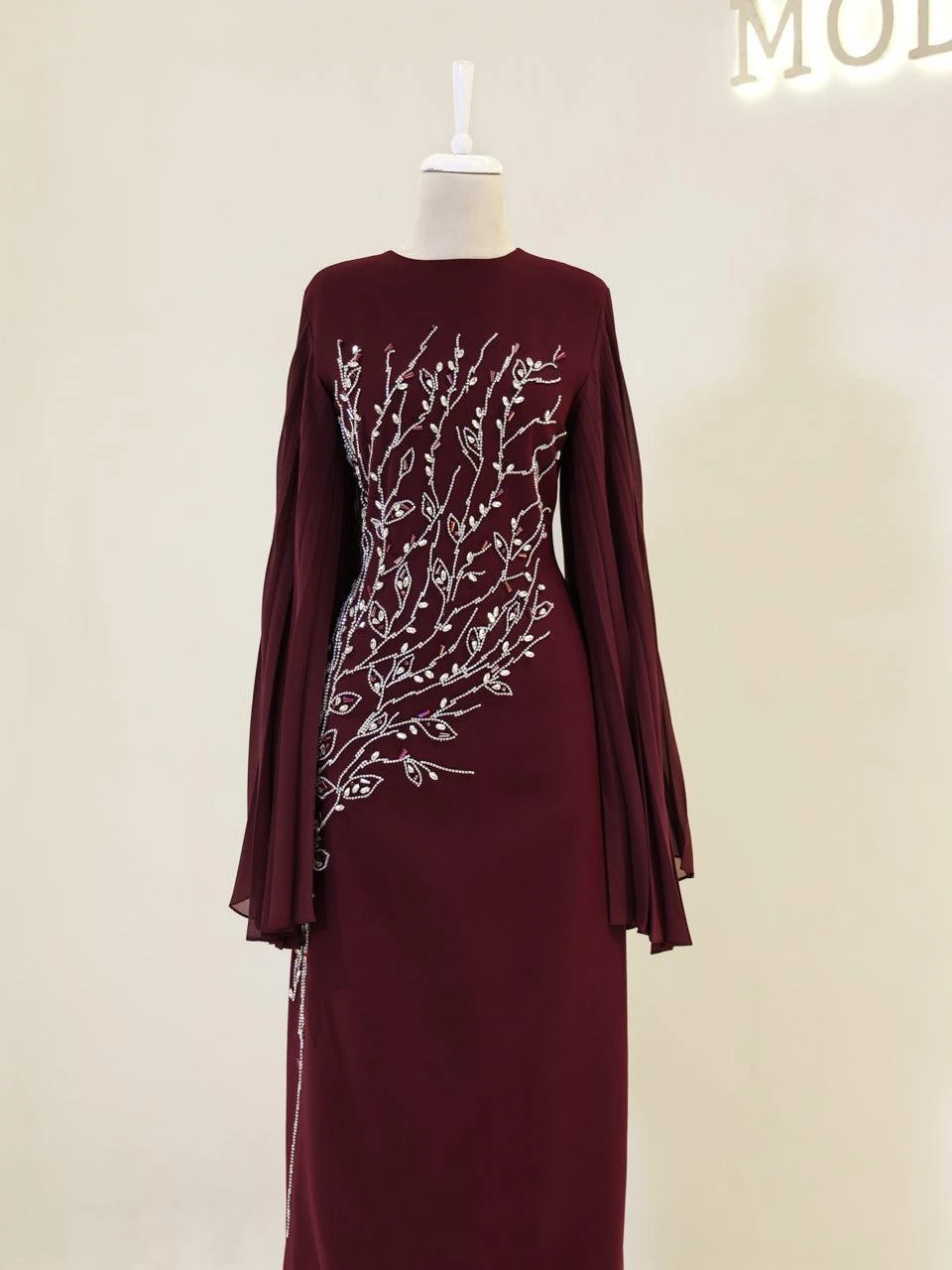 The Baire Modest Evening Dress features a full-length design measuring 150 cm. Made from crepe fabric, this dress is lined and includes a back zipper for easy wear. The Spanish sleeves and pencil skirt form add a touch of elegance. Please note, due to the adhesive nature of the embellishments, some may detach over time, but this will not significantly affect the dress’s overall appearance.