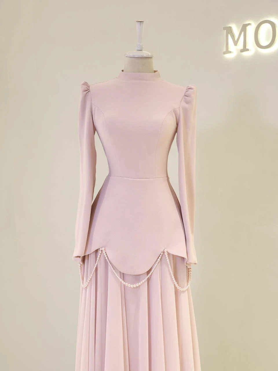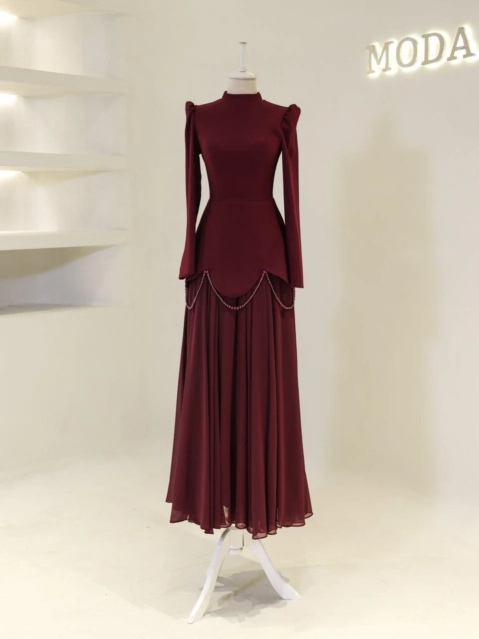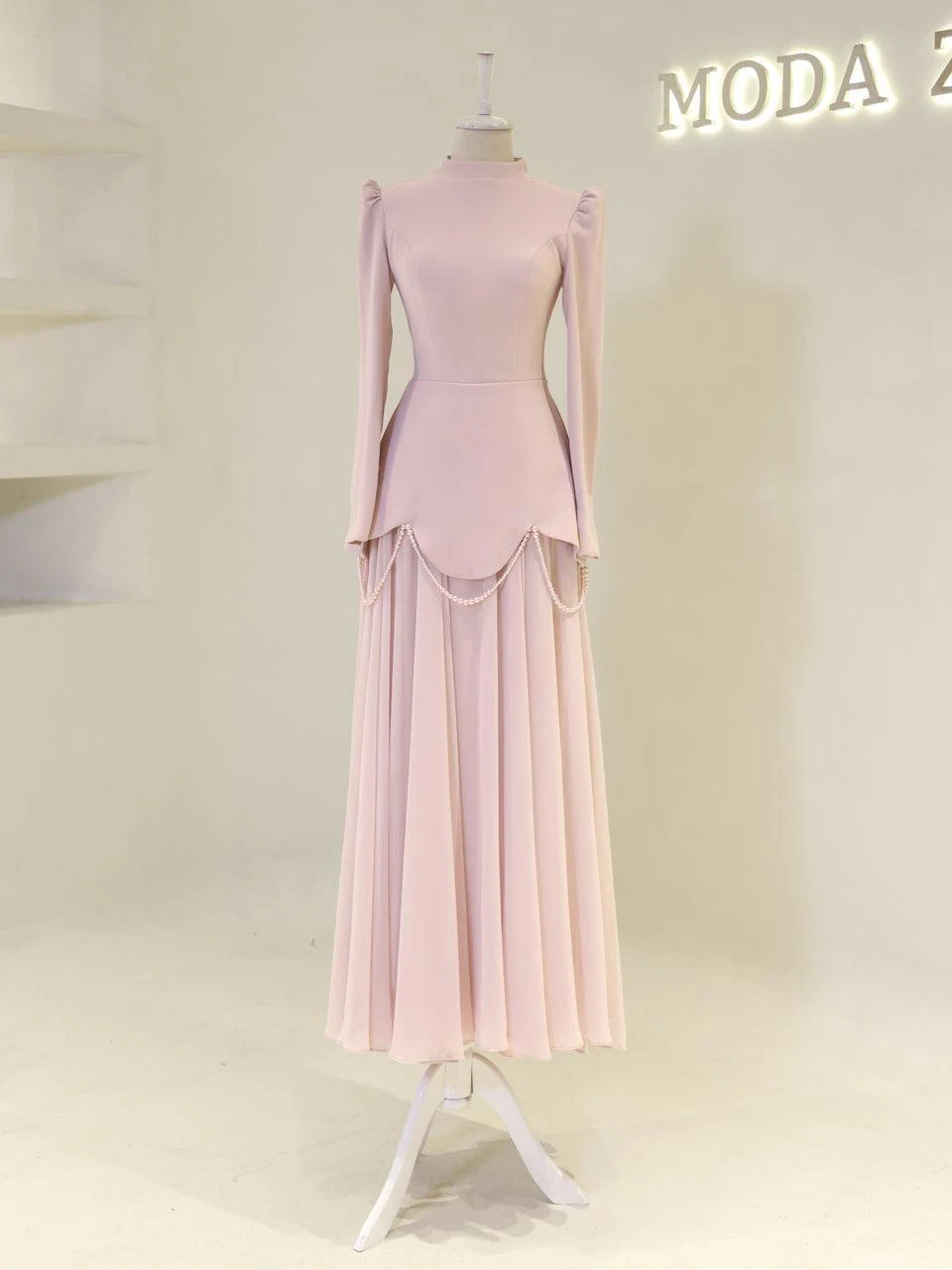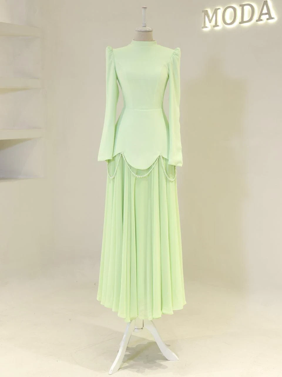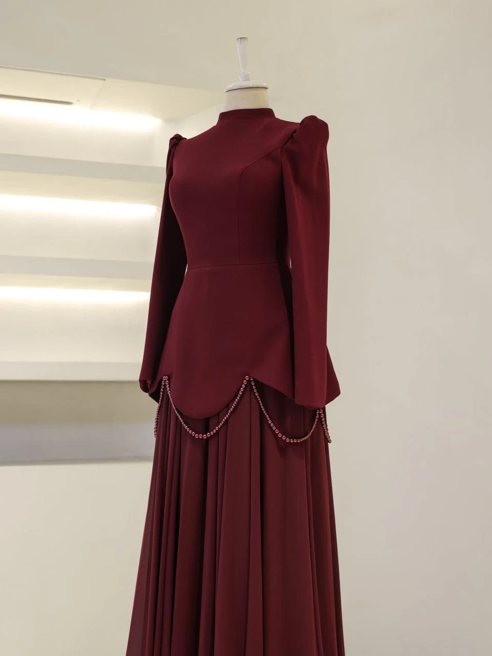 The Baneen Modest Evening Dress offers a perfect fit with a total length of 150 cm. The upper part of the dress is made from crepe fabric, while the skirt is crafted from chiffon, providing a graceful flow. It features a back zipper closure and is fully lined for comfort. The dress also includes a built-in chest pad and has a flared skirt design.