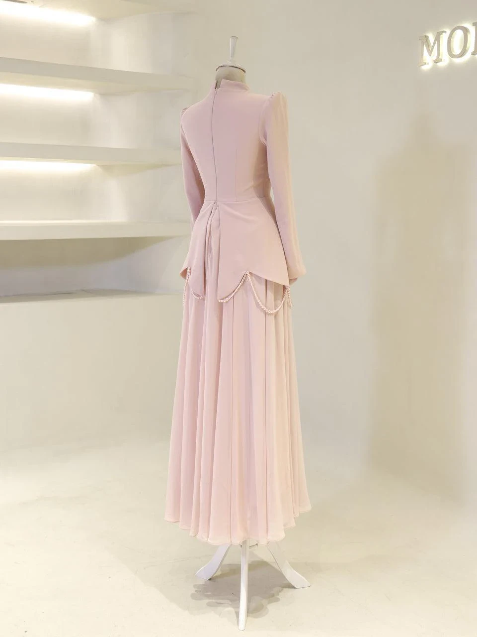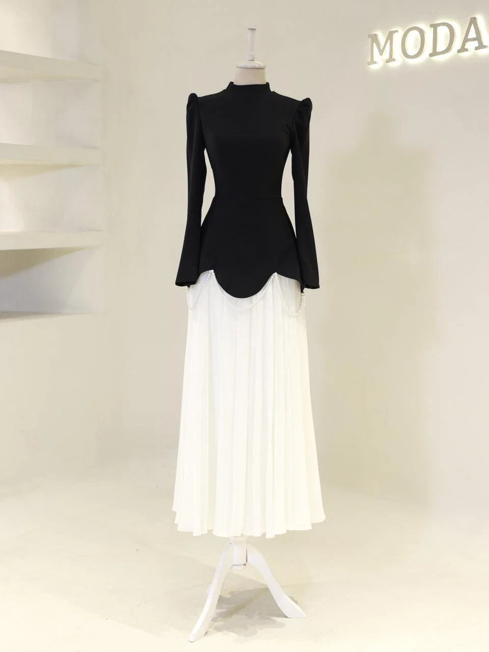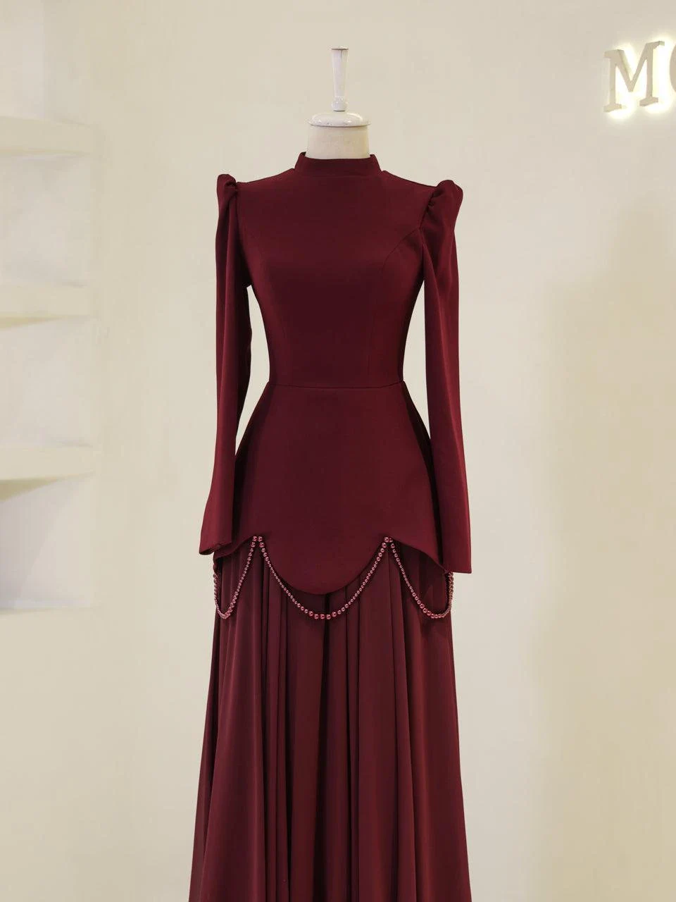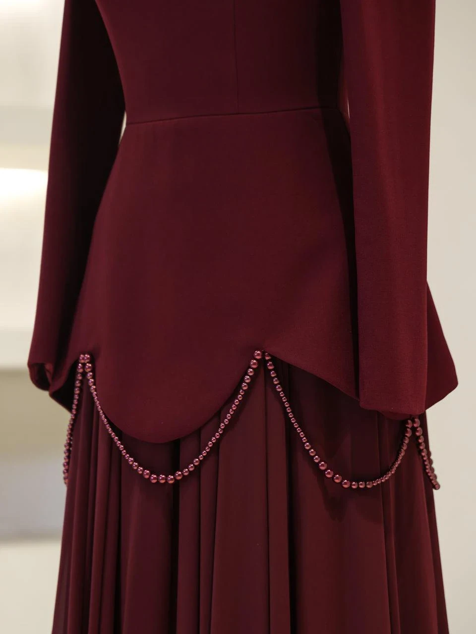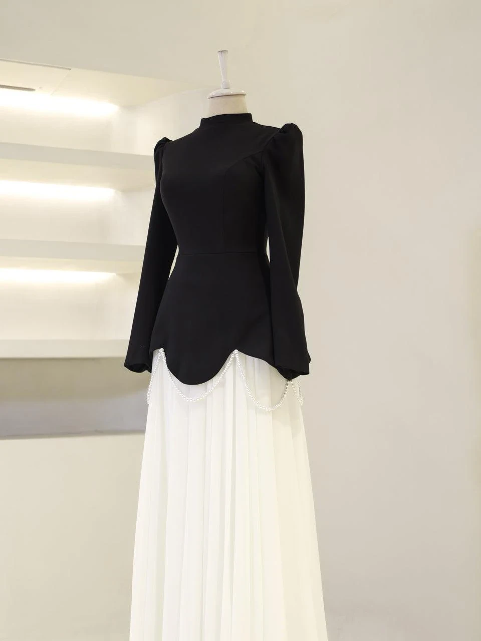 The Baneen Modest Evening Dress offers a perfect fit with a total length of 150 cm. The upper part of the dress is made from crepe fabric, while the skirt is crafted from chiffon, providing a graceful flow. It features a back zipper closure and is fully lined for comfort. The dress also includes a built-in chest pad and has a flared skirt design.