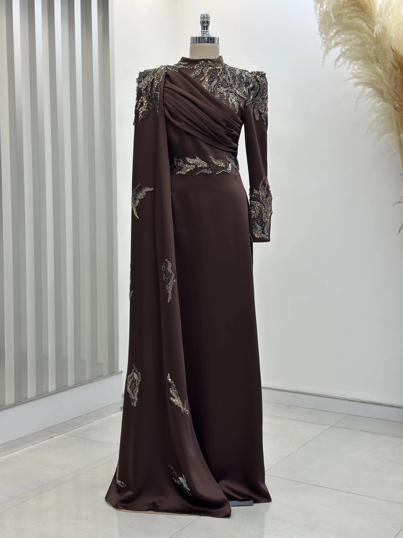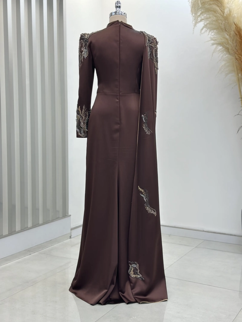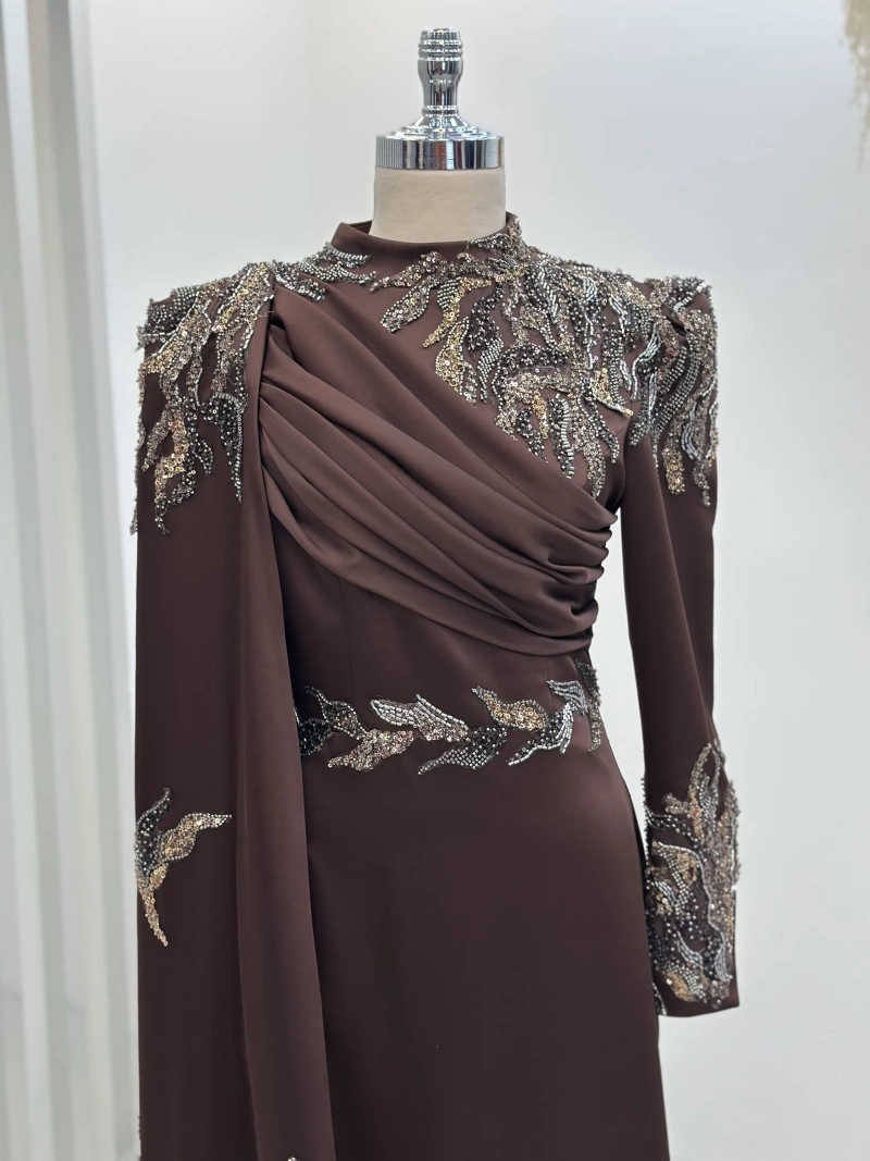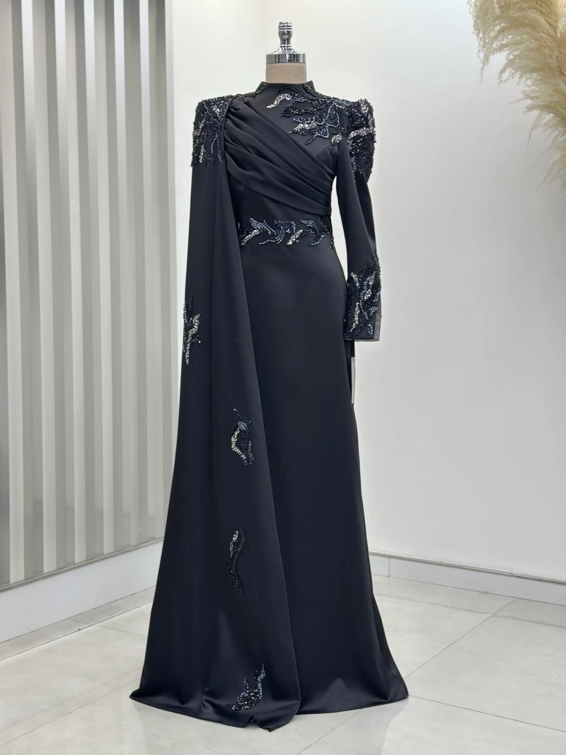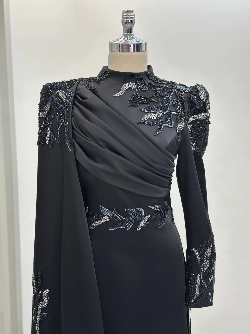 The design features a statuesque high neckline and long fitted sleeves, offering full coverage in a silhouette that flatters without clinging. The bodice is elevated by carefully placed beaded embroidery in botanical shapes, cascading from the shoulders and cuffs for a refined statement.