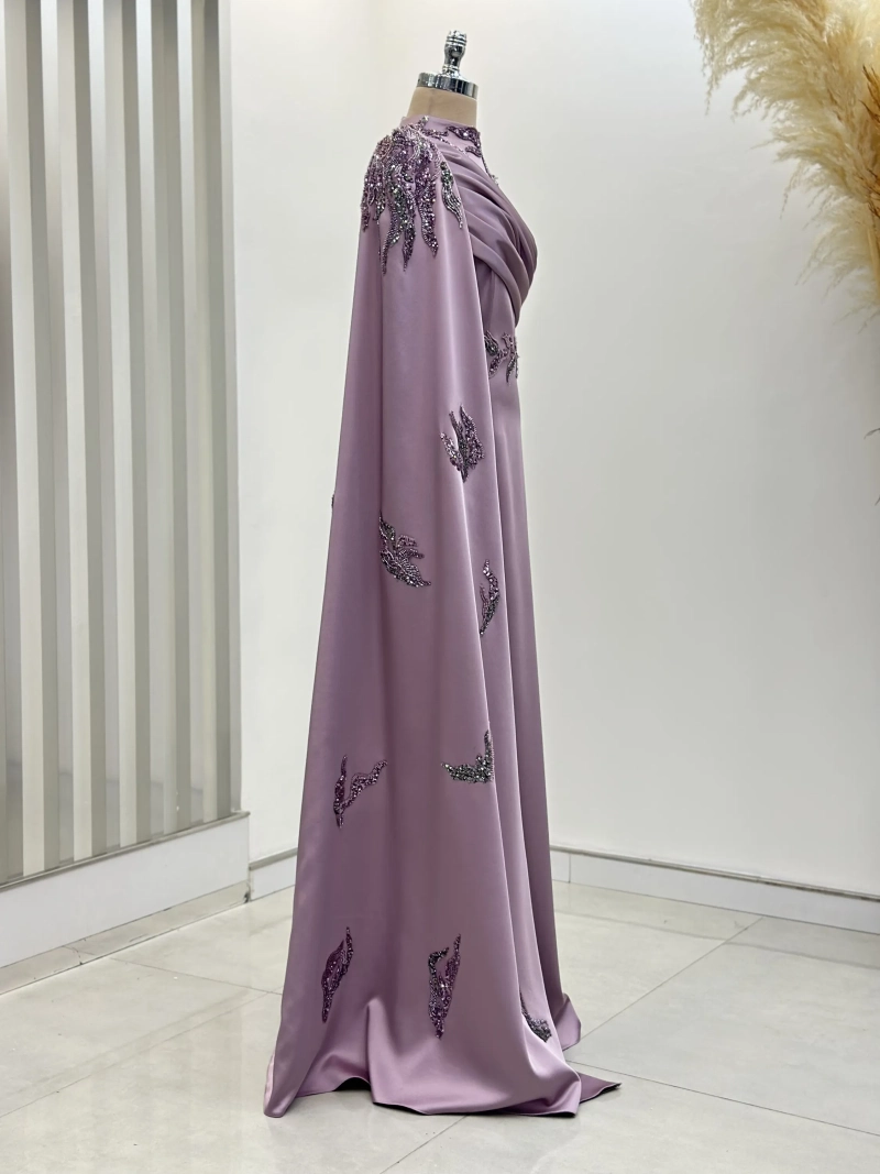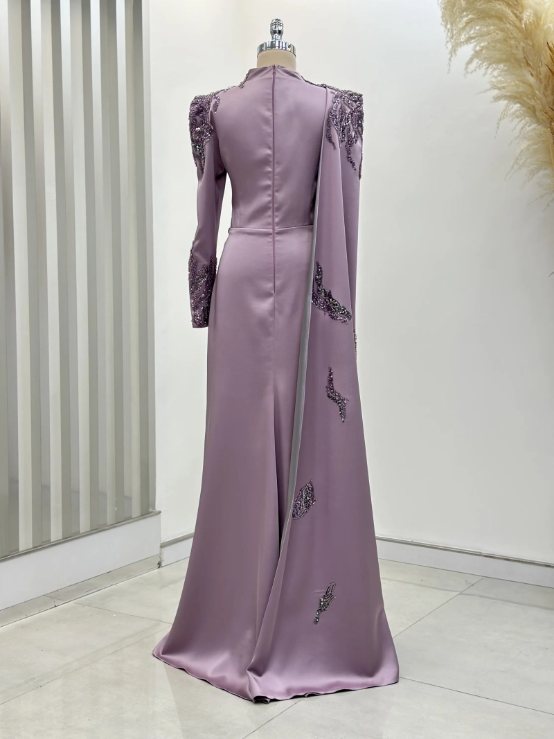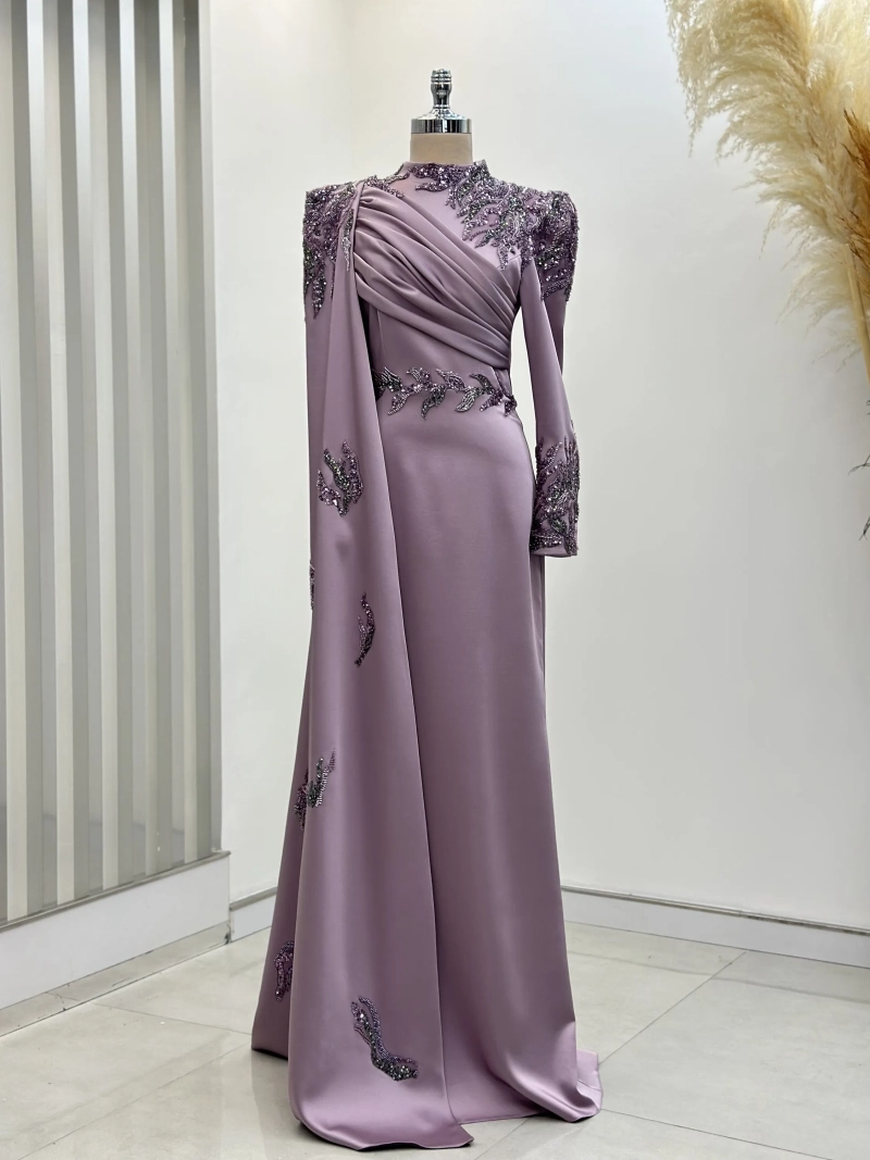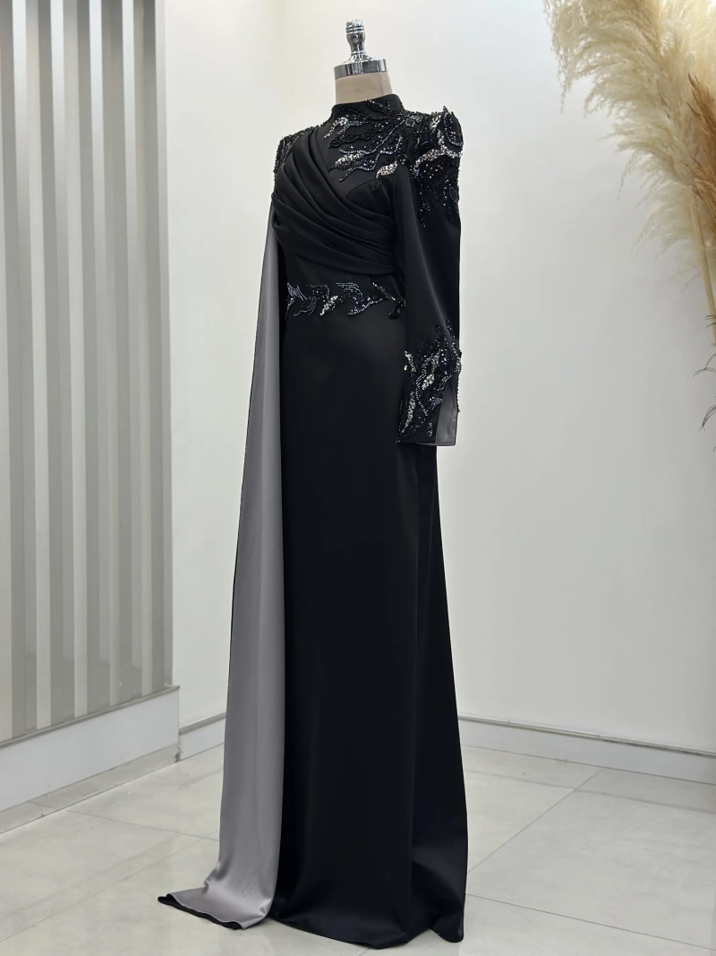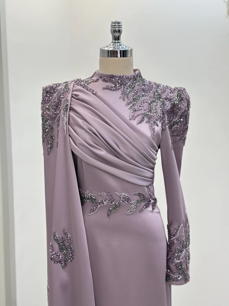 The design features a statuesque high neckline and long fitted sleeves, offering full coverage in a silhouette that flatters without clinging. The bodice is elevated by carefully placed beaded embroidery in botanical shapes, cascading from the shoulders and cuffs for a refined statement.