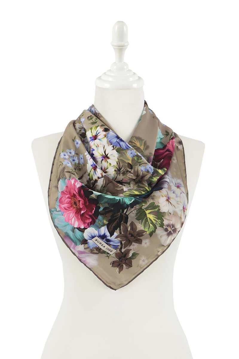 The Bej Fulya Desen İpeksi Eşarp is made from 100% silky rayon fabric and measures 90×90 cm. It features a beige floral pattern with vibrant colors, originating from Bursa, Turkey.