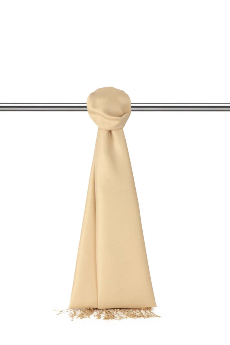 The Bej İpek Görünümlü Şal is a beige scarf with a silk-like appearance, featuring a structured and shiny design. Made of 70% acrylic and 30% PES, it measures 70×190 cm and originates from Bursa, Turkey.