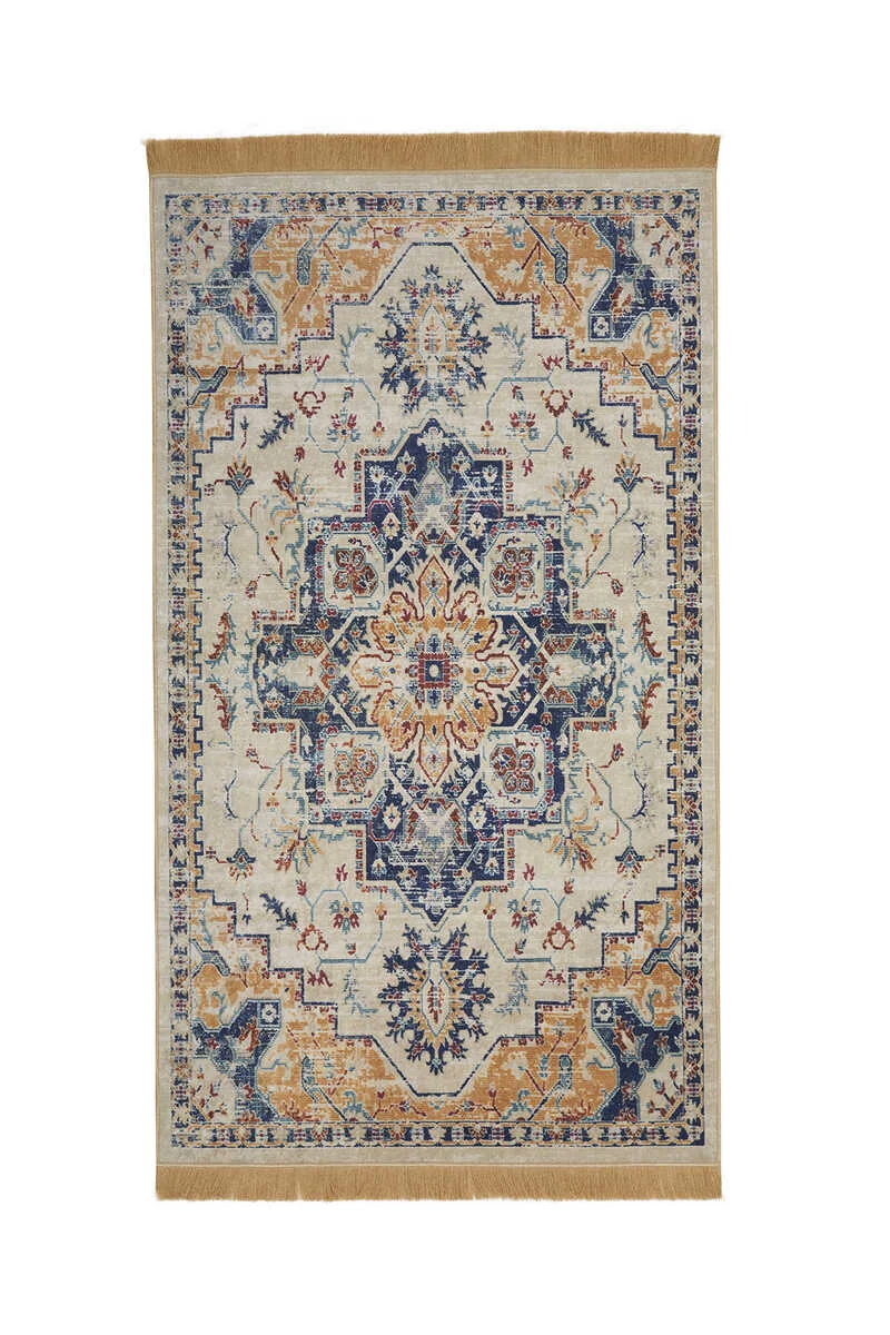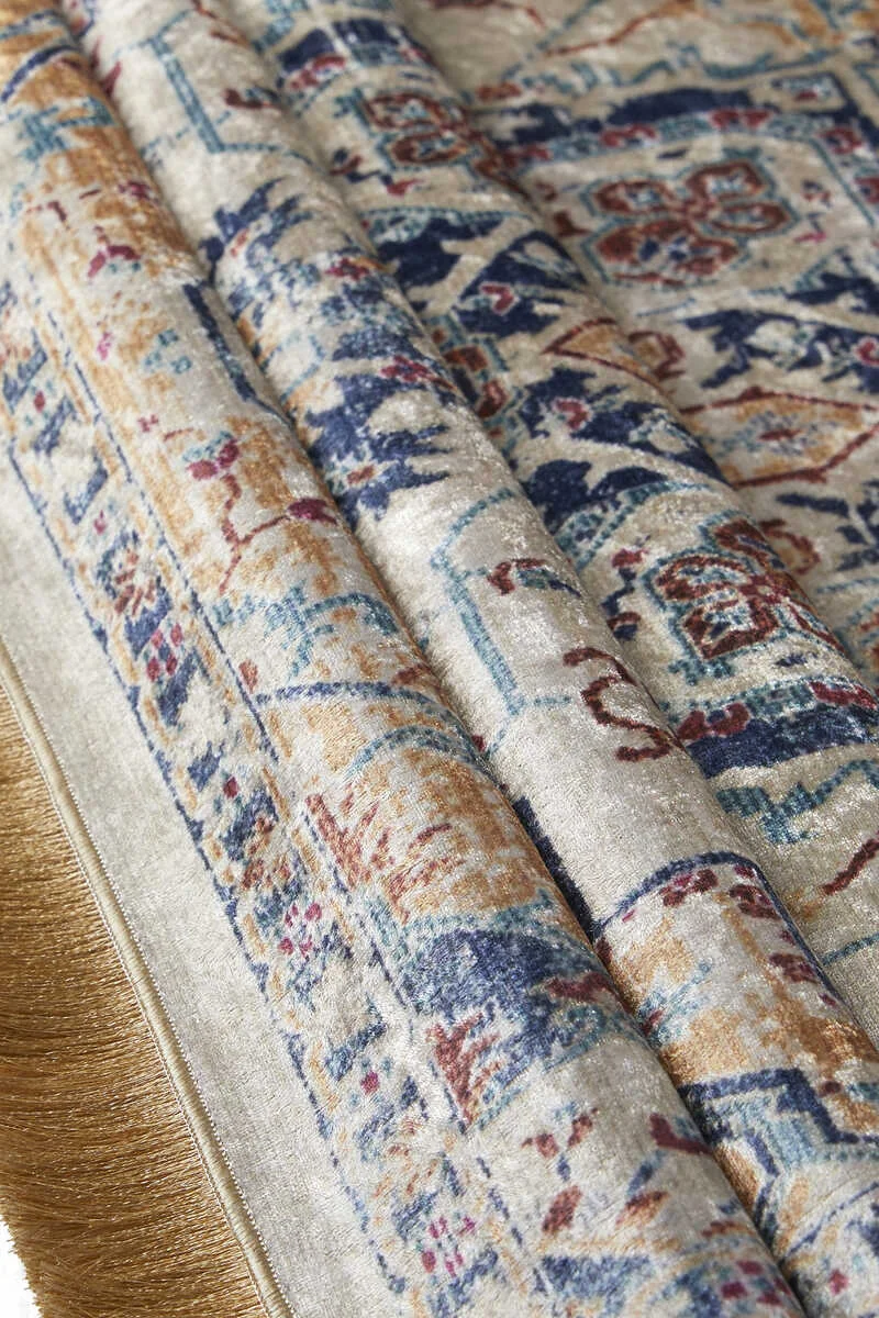 The Bej Kadife Halı Seccade is a prayer rug featuring Turkish motifs and tile patterns, designed with a velvet texture for decorative appeal. It measures 65×115 cm and originates from Bursa, Turkey.