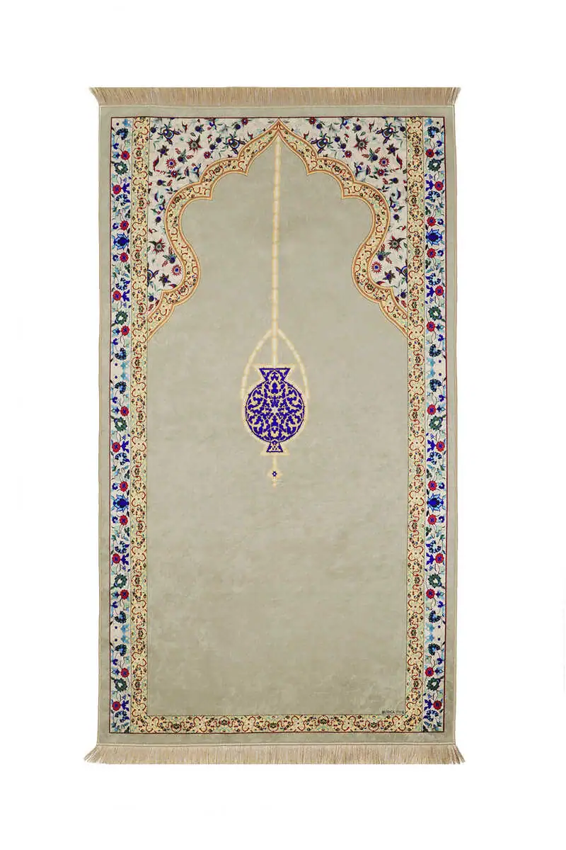 The Bej Kadife Halı Seccade is a prayer rug with a silky texture and eye-catching colors featuring Turkish motifs and tile patterns. It measures 65×115 cm and is designed for comfortable use, originating from Bursa, Turkey.