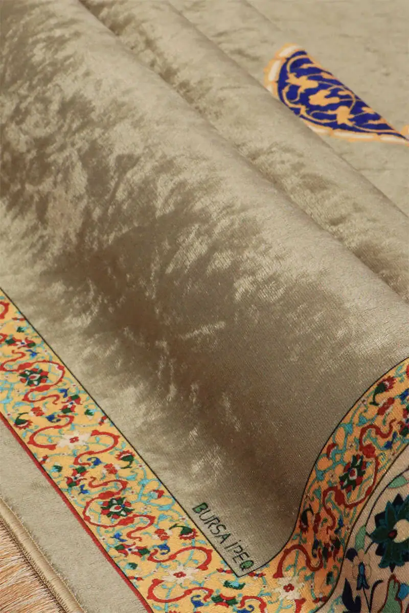 This beige velvet rug prayer mat combines traditional Turkish motifs with intricate tile patterns. Measuring 65×115 cm, it offers both decorative appeal and practical use. The silky feel of the velvet adds a touch of elegance to any space. Originating from Bursa, Turkey, this prayer mat is crafted to enhance your spiritual practice while complementing your home decor.