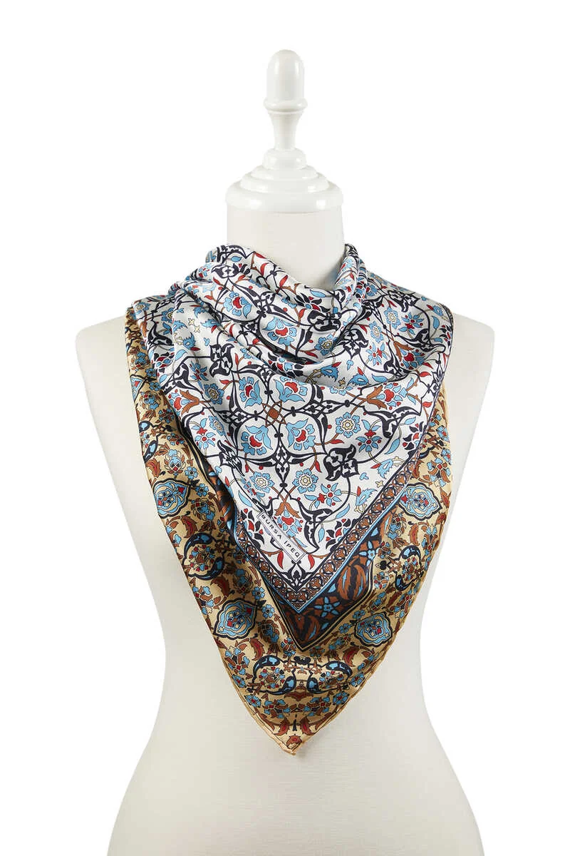 The Black Brown Turkish Motif Silk-Like Scarf features vibrant colors on a silk-like rayon fabric, offering both fun and classic appeal. The floral patterns add energy to your wardrobe, making it a versatile accessory for various occasions. With dimensions of 90×90 cm, it provides ease of use and styling options. Originating from Bursa, Turkey, this scarf is crafted with attention to traditional design elements.