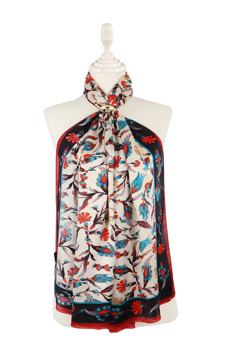 The Black Burgundy Carnation Tulip Silk Scarf adds elegance to any outfit. Whether attending a business meeting or visiting an art gallery, this scarf complements your style effortlessly. Featuring eye-catching patterns in black and burgundy, it is crafted from 100% silk for a luxurious feel. With dimensions of 55×160 cm, it offers ease of use and versatility. Originating from Bursa, Turkey, it's a fine example of Turkish craftsmanship.