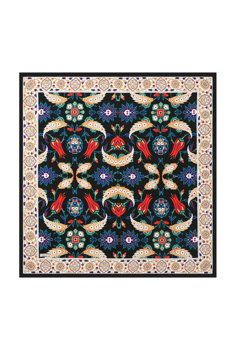 The Siyah Ekru Efes Desen İpek Eşarp is a silk scarf measuring 90×90 cm, made from 100% silk. It originates from Bursa, Turkey and features a unique design.