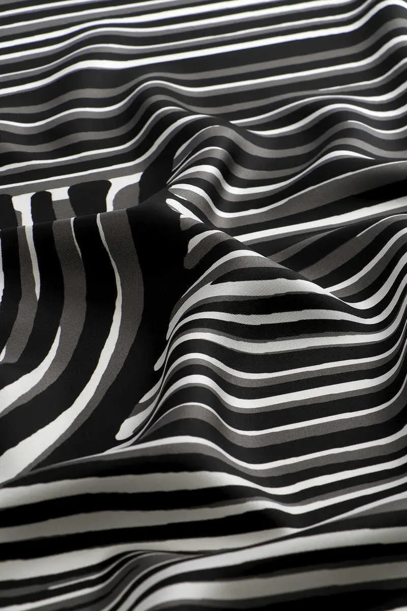 The Black Illusion Pattern Twill Silk Scarf is designed with an optical illusion pattern that combines geometric shapes and colors for a striking effect. Crafted from 100% twill silk, this scarf offers comfort and style in its 90 x 90 cm size. Originating from Bursa, Turkey, it exemplifies quality craftsmanship.