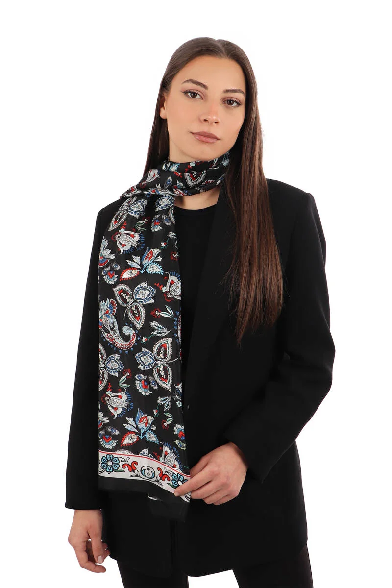 The Black Paisley Pattern Voile Silk Scarf combines elegance and sophistication. Crafted from 100% voile silk, its lightweight texture ensures a comfortable experience on your skin. Measuring 45 x 150 cm, this scarf is easy to style and can be worn in various settings, from casual outings to formal events. Originating from Bursa, Turkey, it reflects quality craftsmanship.