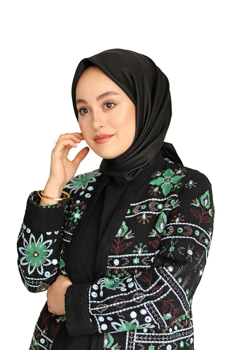 The Siyah Düz Renk Twill İpek Eşarp is a black, plain twill silk scarf designed to complement a simple look. It measures 90×90 cm and is made from 100% silk in Bursa, Turkey.