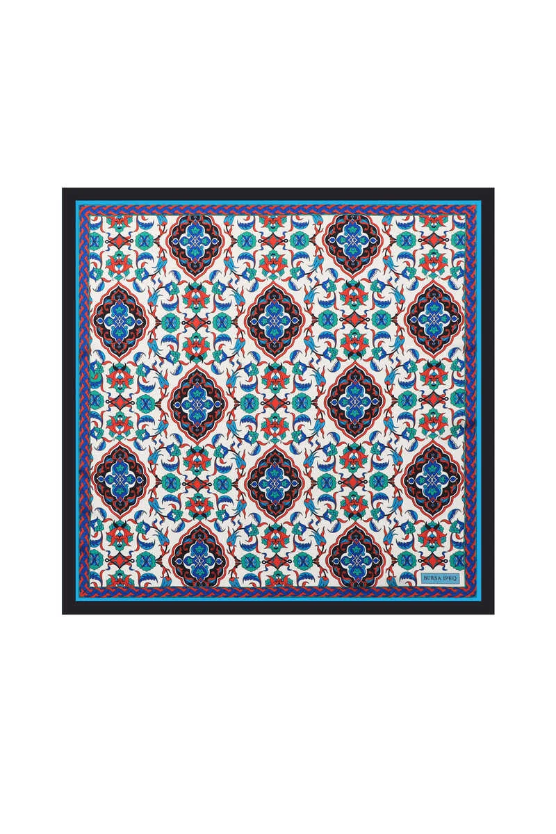 The Siyah Çini Desen İpeksi Mendil is a silk-like handkerchief featuring a classic black tile pattern. It measures 55×55 cm and is made from rayon with hand-rolled stitching, originating from Bursa, Turkey.