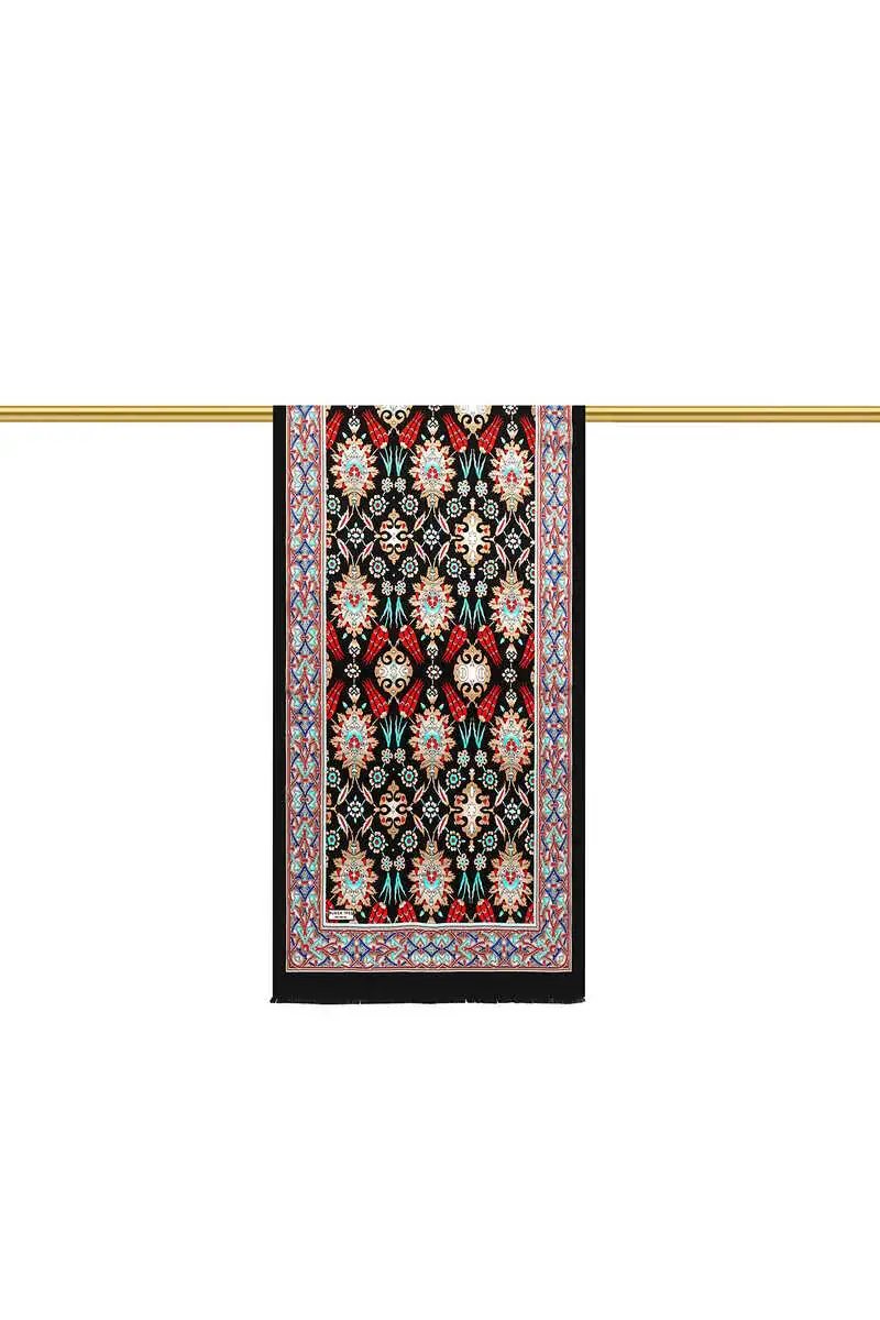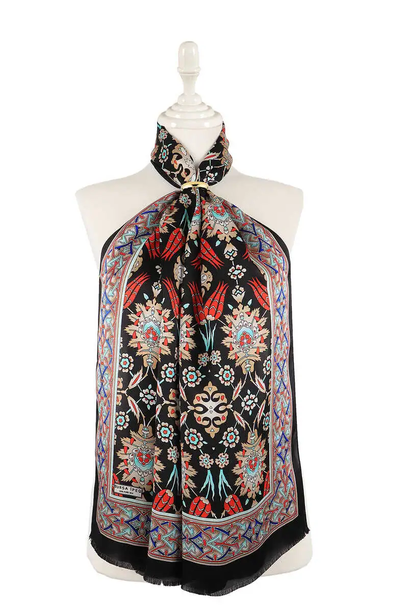 The Siyah Çini Lale Desen Dar İpek Fular is a black silk scarf with eye-catching patterns, measuring 45 x 165 cm. Made from 100% silk, it originates from Bursa, Turkey.