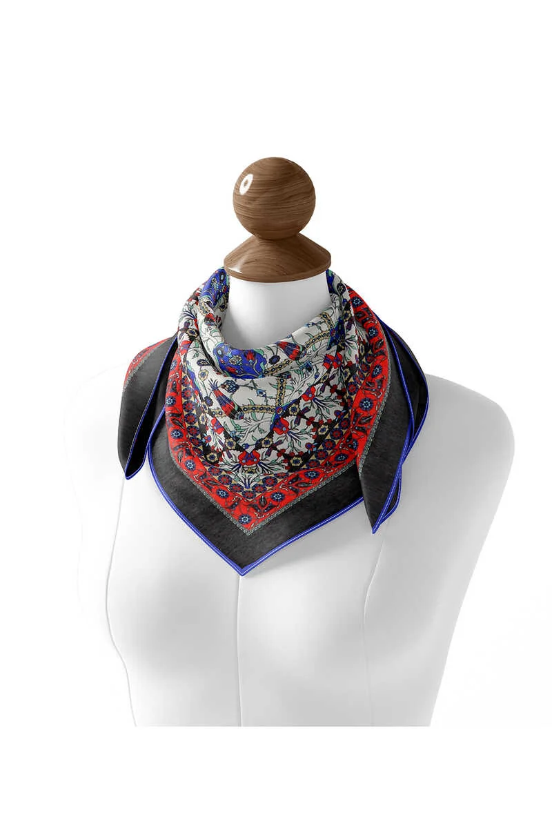 The Siyah Çini Lale Desen Soft Eşarp is a lightweight, cotton scarf measuring 90 x 90 cm, available in a black navy option. It is designed for comfort during warm summer days and originates from Bursa, Turkey.