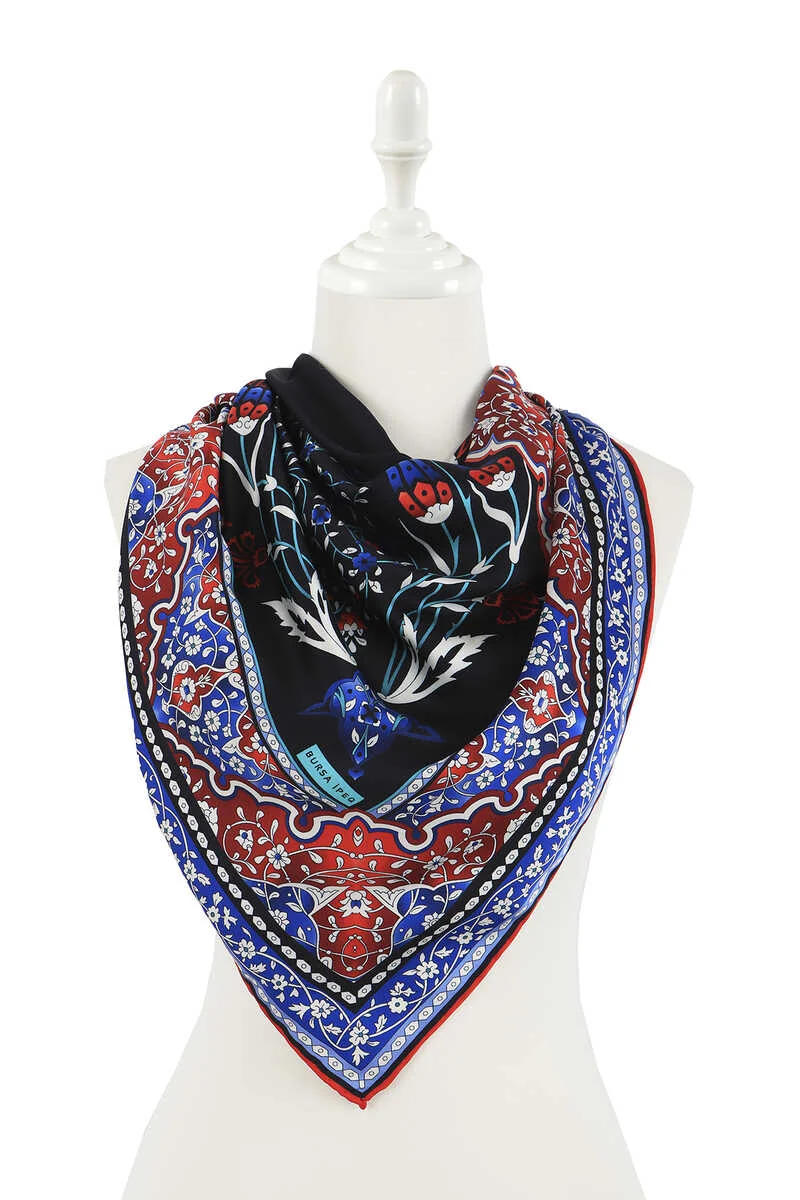 This scarf combines the elegance of black candle tulip patterns with the smooth texture of silky rayon fabric. The vibrant colors make it both a fun and classic accessory. Made from 100% silky rayon, it offers ease of use with its 90×90 cm dimensions. Originating from Bursa, Turkey, this scarf adds energy to your wardrobe.