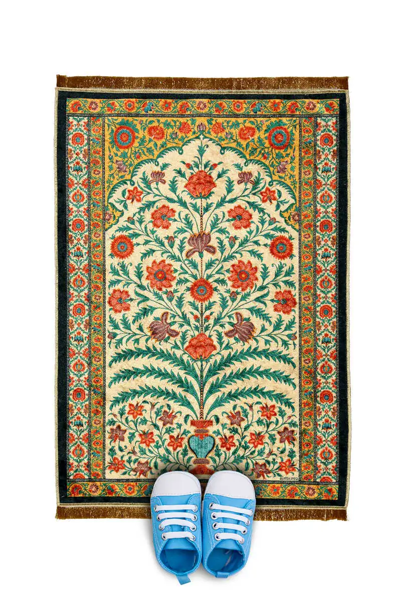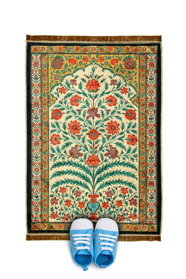 The Black Velvet Kids Prayer Rug and Play Mat is crafted to make prayer time appealing for children. It features vibrant colors and patterns that capture attention. Measuring 45×80 cm, this rug is designed for ease of use. Originating from Bursa, Turkey, it combines traditional craftsmanship with child-friendly design.