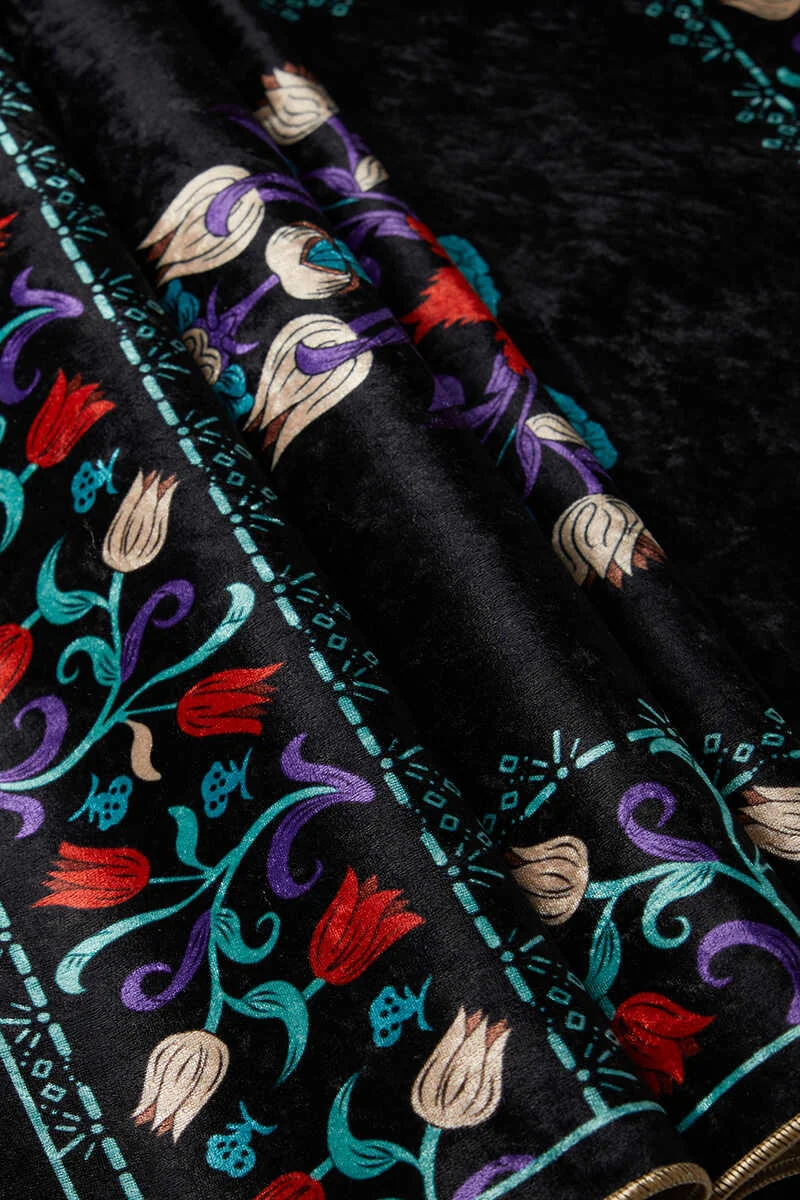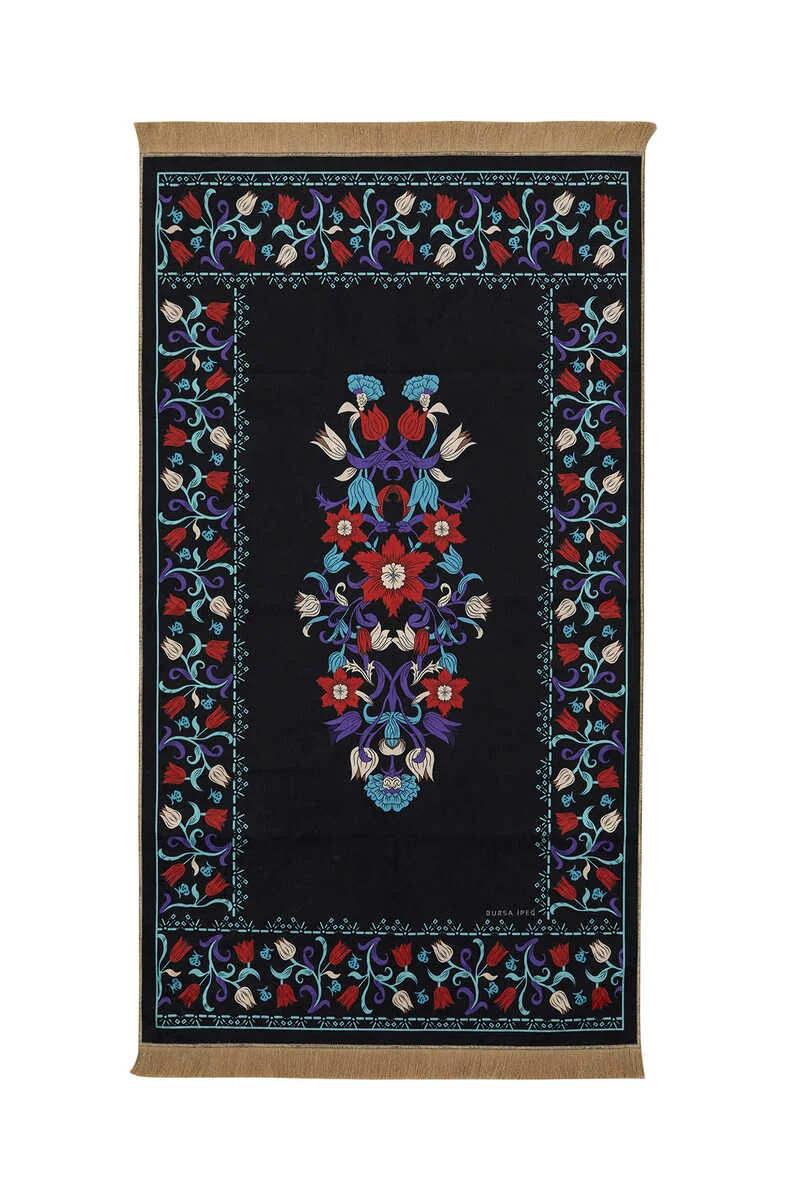 This Black Velvet Prayer Rug combines traditional Turkish motifs with intricate tile patterns. Measuring 65×115 cm, it offers both decorative appeal and practical use. The rug is crafted in Bursa, Turkey, known for its quality textile production. Its velvet texture provides a comfortable surface for prayer.