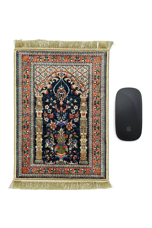 This blue decorative small rug mousepad combines traditional Turkish motifs with intricate tile designs. Measuring 25×30 cm, it offers a comfortable user experience with its velvet texture. Made in Bursa, Turkey, this mousepad also serves as a decorative piece, enhancing any workspace or home setting.