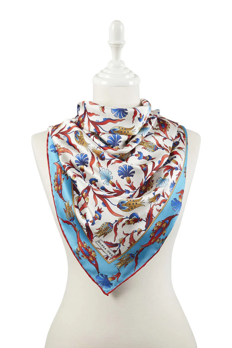 This scarf combines blue and red clove and tulip patterns with a silky texture. Made from 100% silky rayon, it offers a vibrant and classic look. The dimensions of 90×90 cm provide versatility in styling. Originating from Bursa, Turkey, this scarf is both stylish and functional.