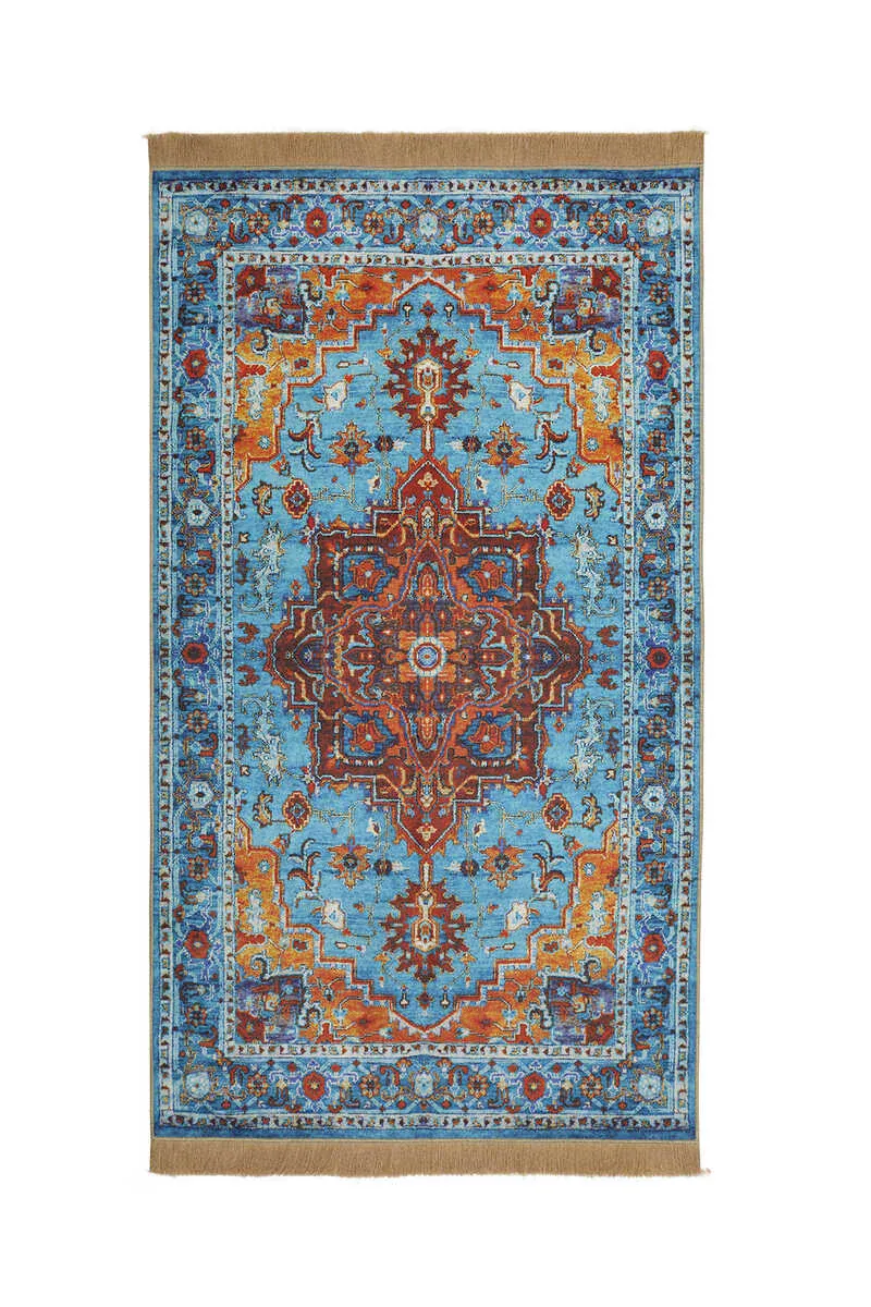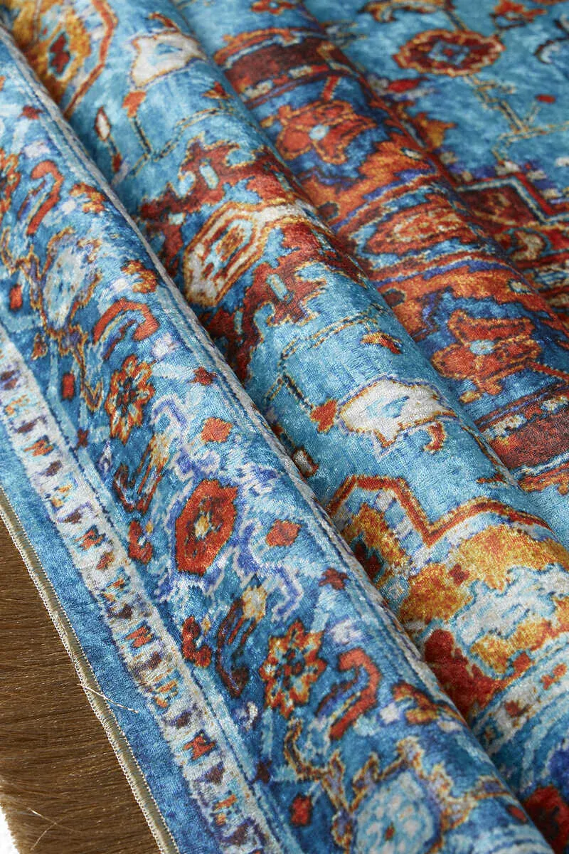 The Mavi Kadife Halı Seccade features a silky texture and eye-catching colors with Turkish motifs and ceramic patterns. It is designed for comfortable use with dimensions of 65×115 cm and originates from Bursa, Turkey.