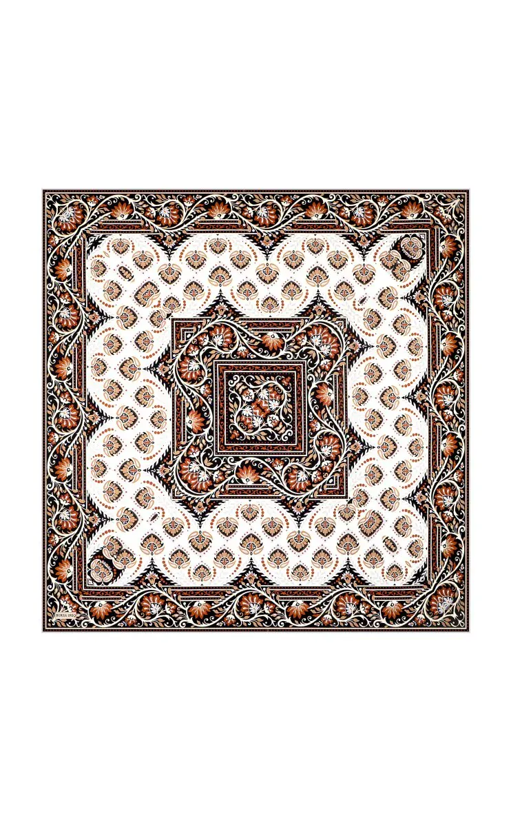 The "Kiremit Taç Desen Twill İpek Eşarp" features a distinctive crown pattern, blending classic and modern styles. Made from 100% twill silk in Bursa, Turkey, it measures 90×90 cm.