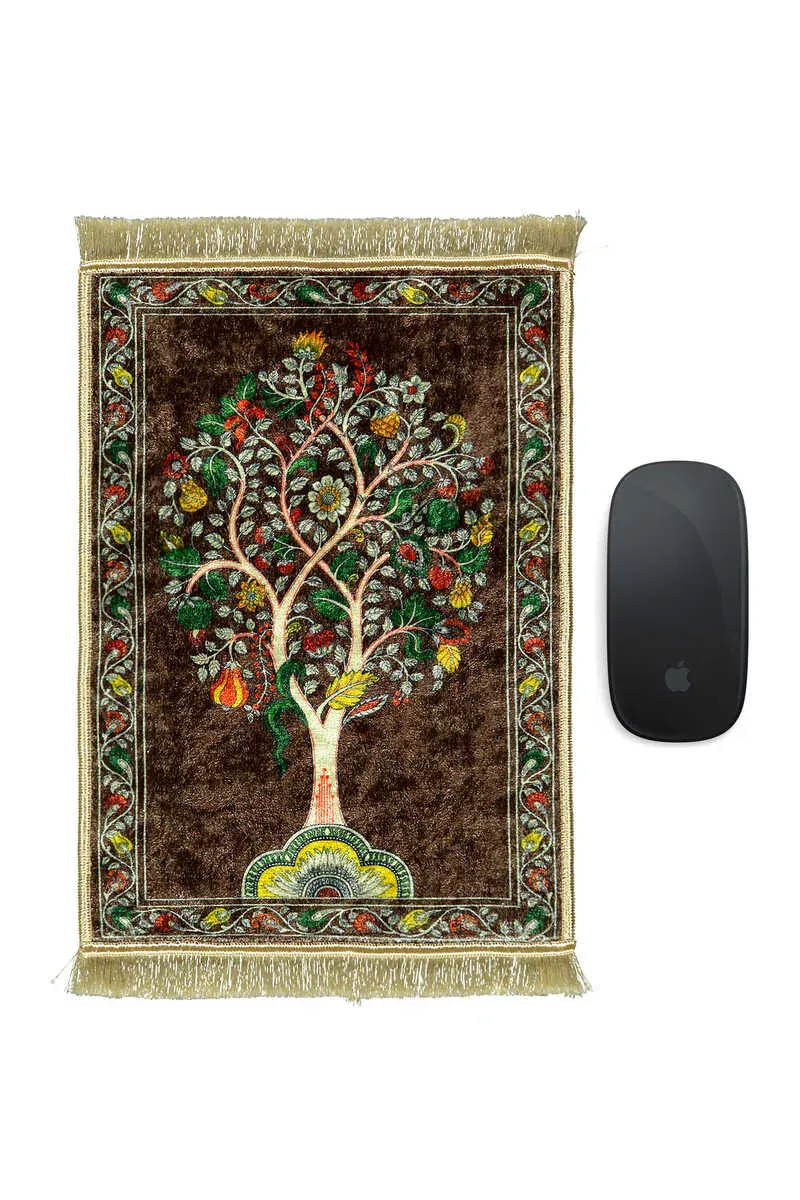 The Kahverengi Dekoratif Küçük Halı Mousepad features Turkish motifs and ceramic patterns with a silky texture. It is designed for comfortable use with its velvet finish and dimensions of 25x30cm.