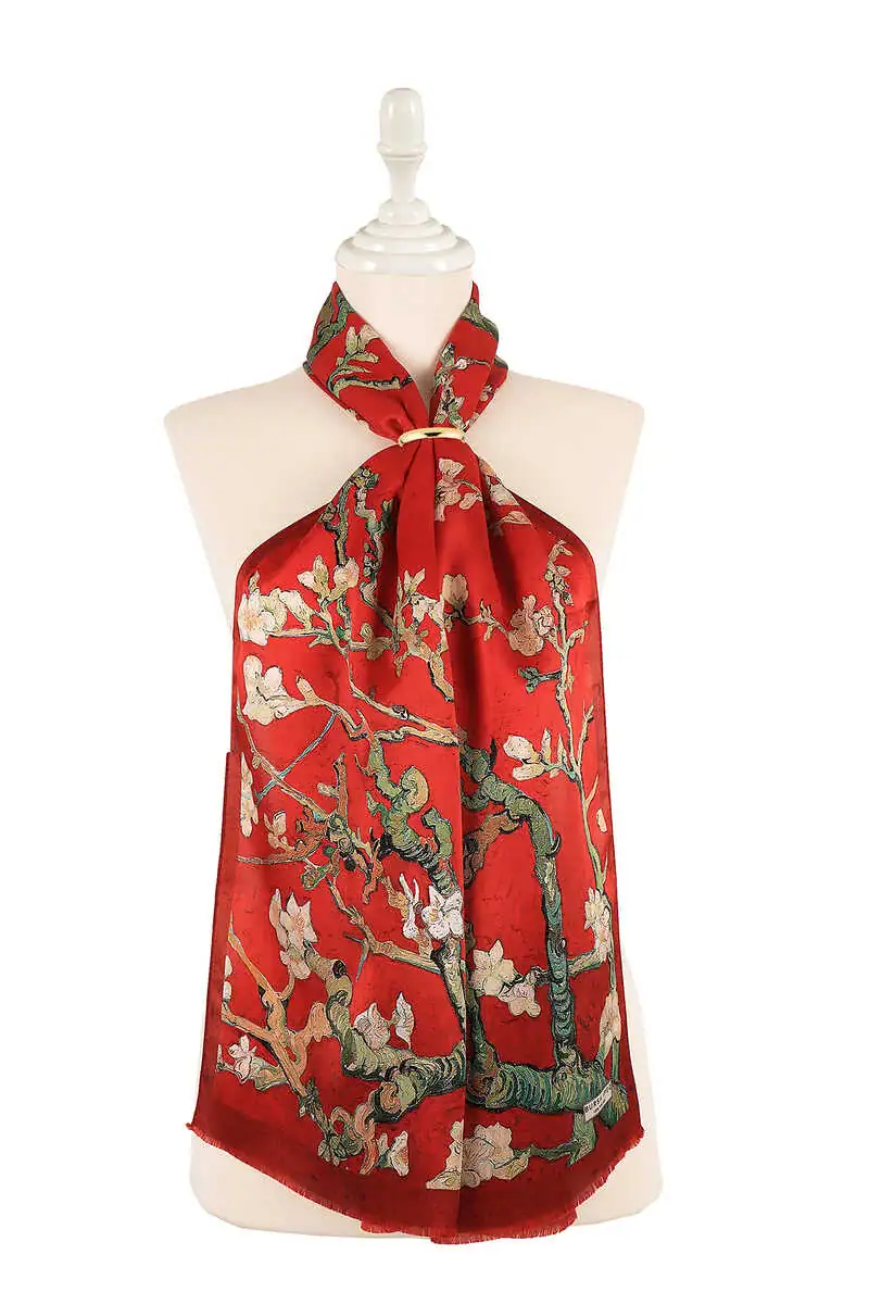 The Burgundy Almond Blossom Silk Scarf draws inspiration from Vincent Van Gogh's artwork, created to celebrate the birth of his nephew. This scarf features captivating patterns and is crafted from 100% silk. With dimensions of 45×165 cm, it offers both elegance and practicality. Originating from Bursa, Turkey, it makes a stylish addition to any wardrobe.