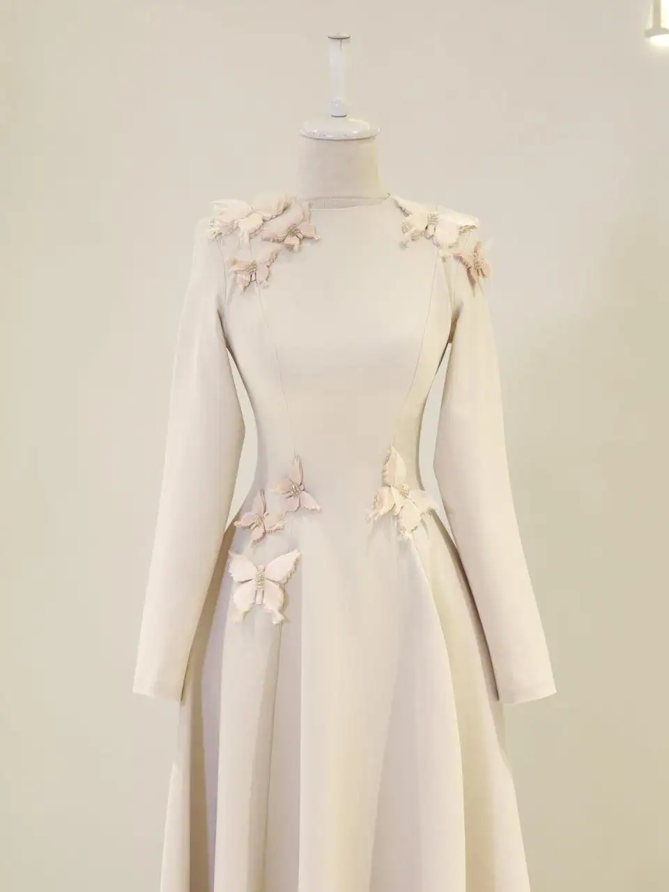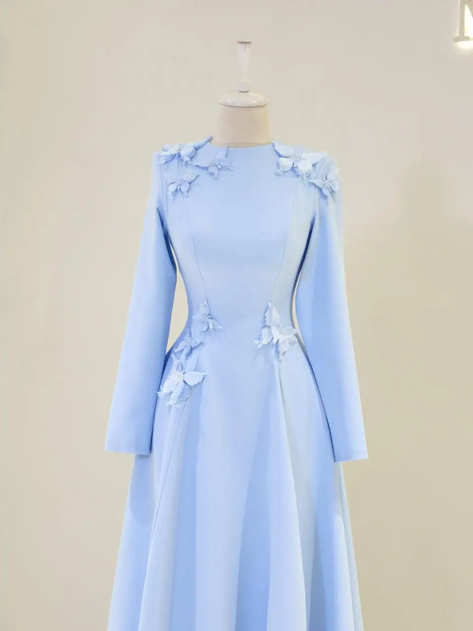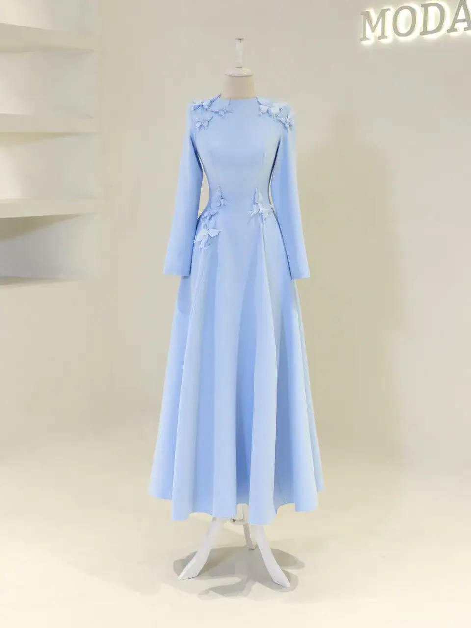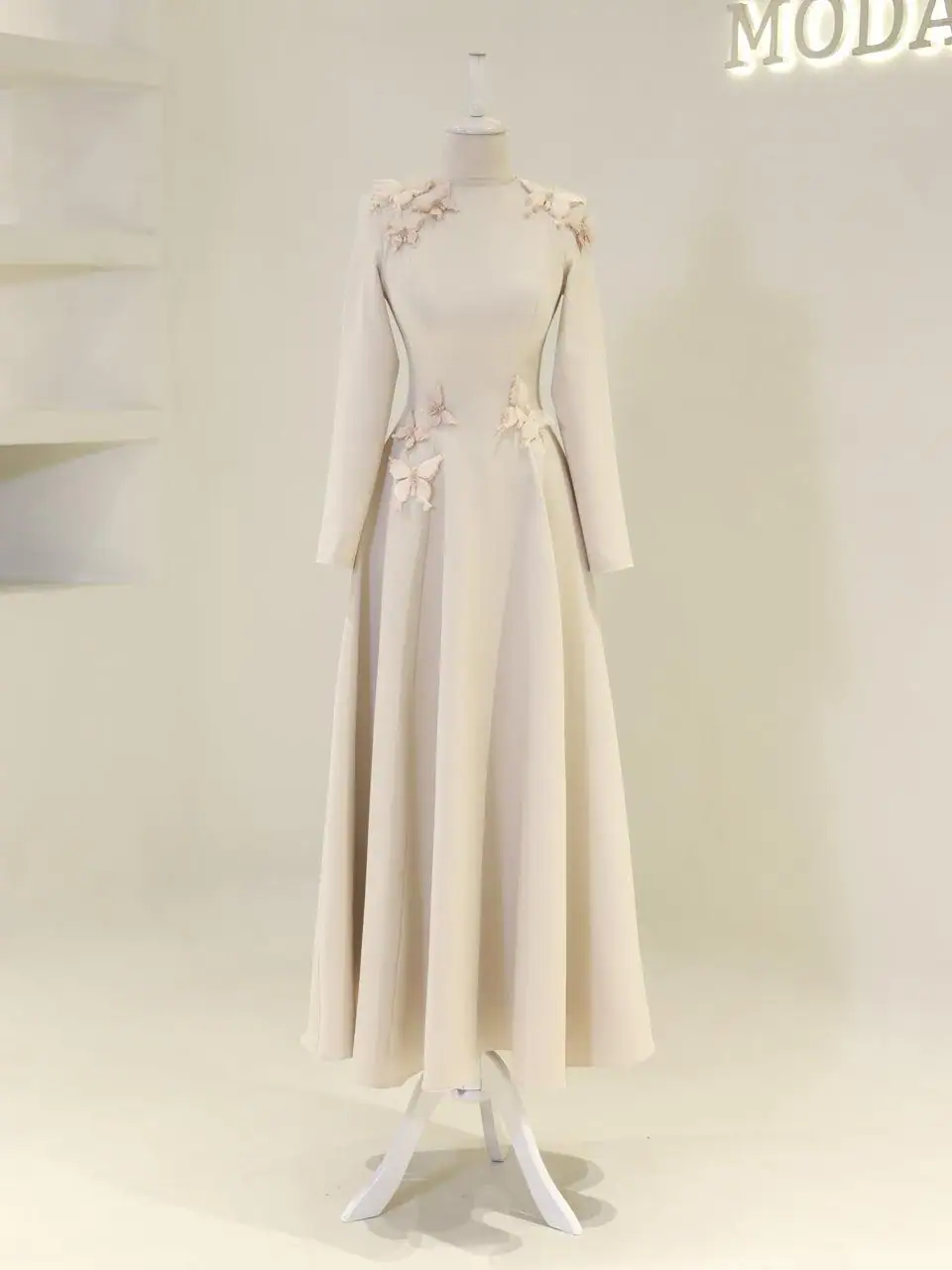 The Butterfly Modest Evening Dress is designed with precision to offer a perfect fit. Made from crepe fabric, this dress measures 145 cm in length and includes a lining for added comfort. It features a back zipper closure and built-in chest pads. The embellishments are three-dimensional and securely attached, ensuring durability. The dress is styled with an A-line skirt, providing a graceful silhouette.