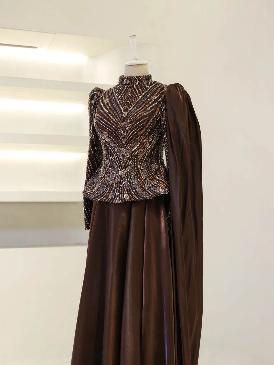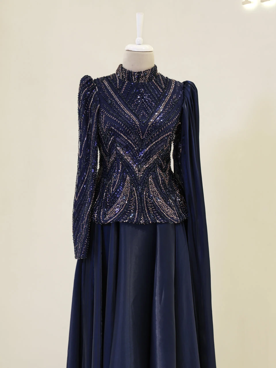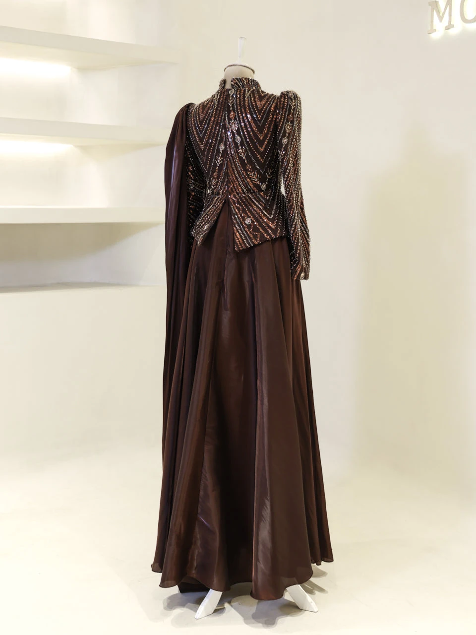 The Calienne Modest Evening Dress offers a perfect fit with a length of 160 cm. The upper part is made of tulle fabric, while the lower part is crafted from orchid fabric. It features a cape detail that extends from the left shoulder to the hem. The dress is equipped with a back zipper for easy wear and includes a chest pad for added comfort. Fully lined with balloon sleeves, the dress showcases non-adhesive embellishments and has a flared skirt design.