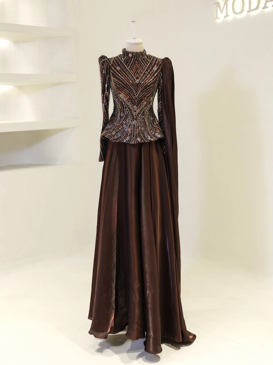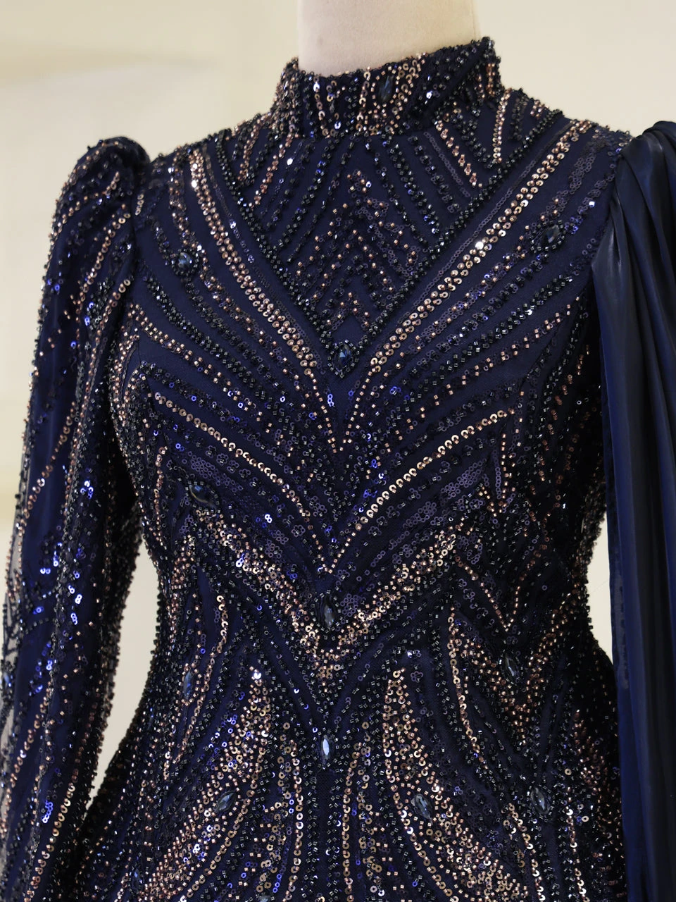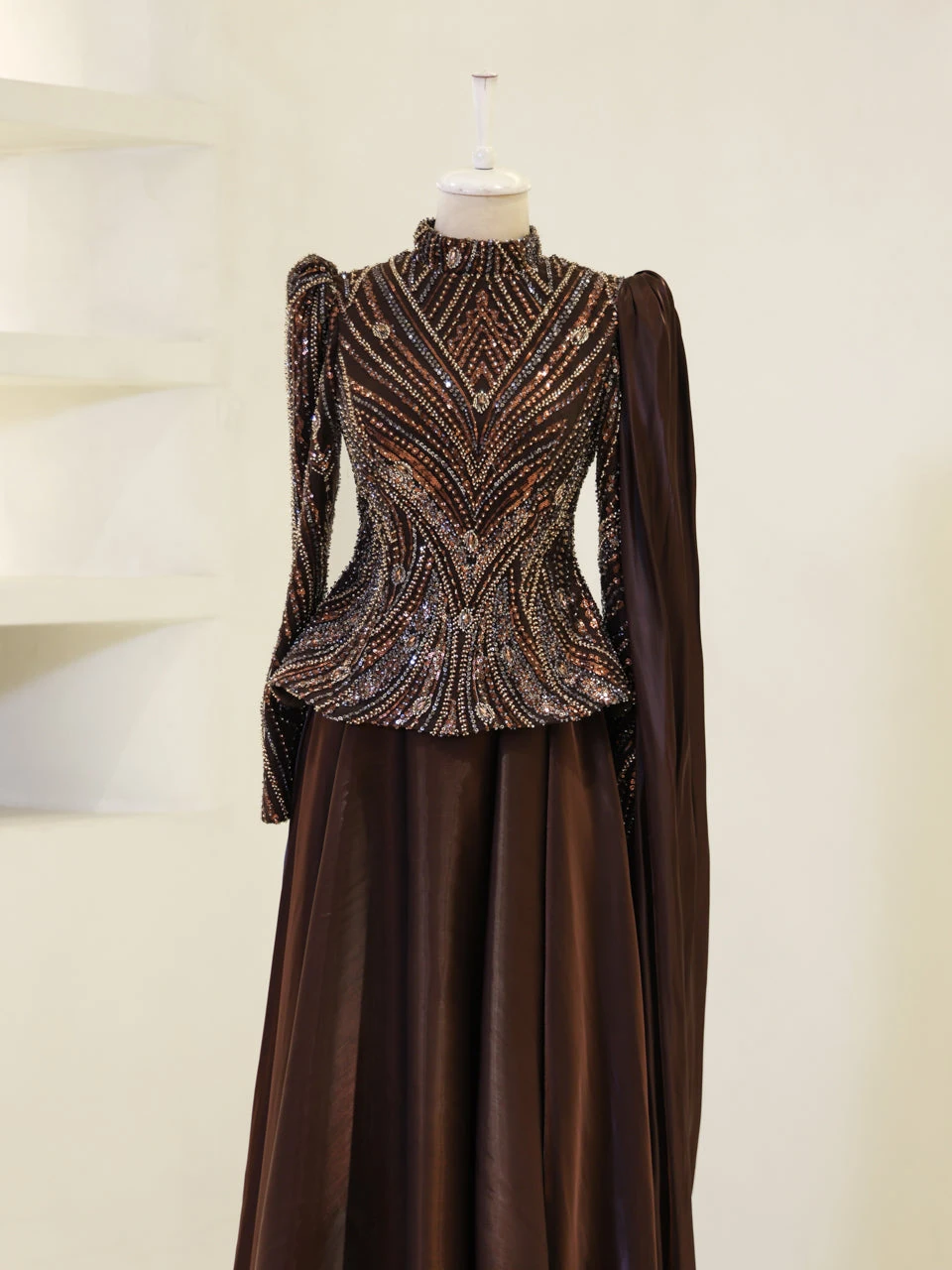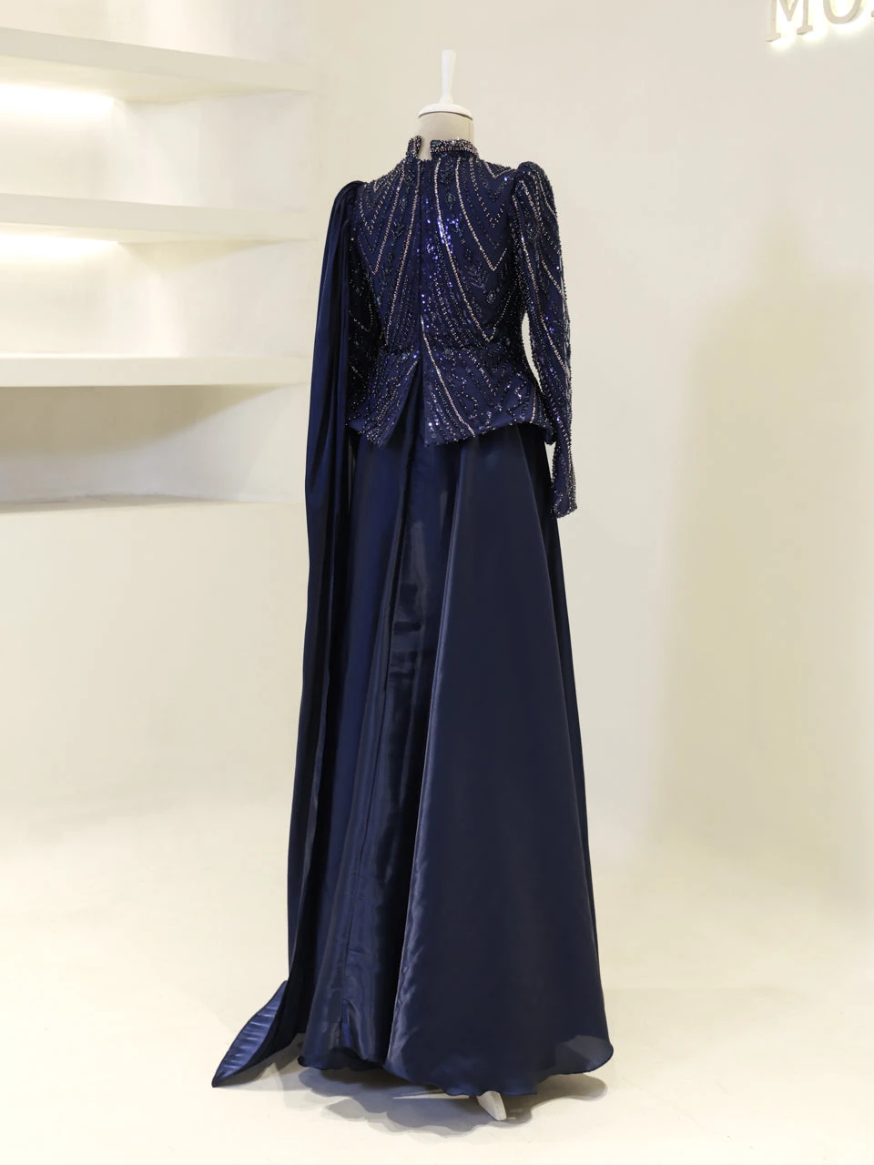 The Calienne Modest Evening Dress offers a perfect fit with a length of 160 cm. The upper part is made of tulle fabric, while the lower part is crafted from orchid fabric. It features a cape detail that extends from the left shoulder to the hem. The dress is equipped with a back zipper for easy wear and includes a chest pad for added comfort. Fully lined with balloon sleeves, the dress showcases non-adhesive embellishments and has a flared skirt design.
